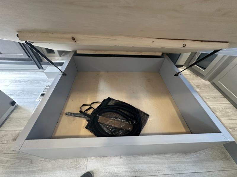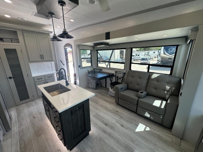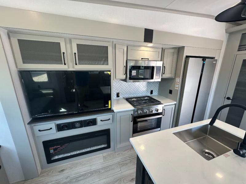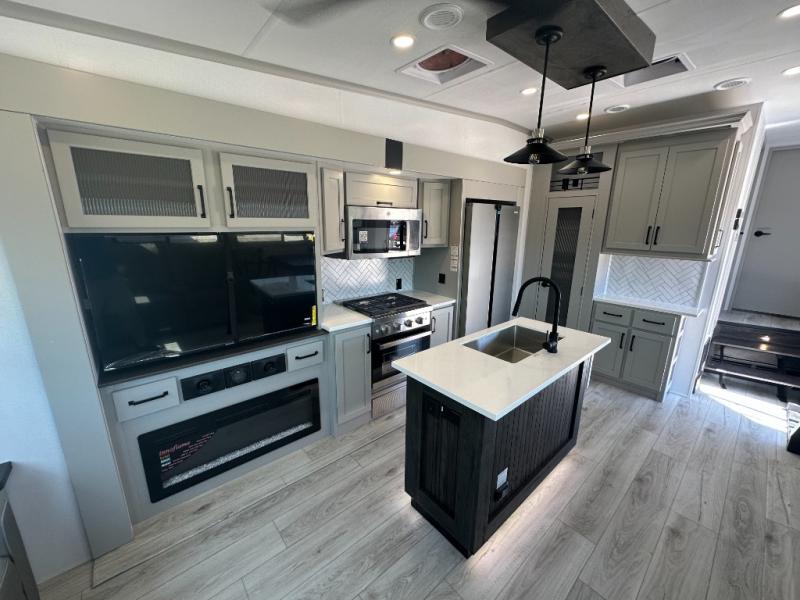 You can take this Montana High Country fifth wheel to the campsite of your choice! You'll have plenty of comfort with the king-size bed in the front master suite, and you can also let some friends or kids sleep on the hide-a-bed sofa in the rear living area. While you watch the 50" TV, you can sit back in the power theater seating, and you can switch on the fireplace for some added heat if it's cool outside. The opposing slides in the main living area are what give you extra space to work freely around the kitchen island, and the coffee station allows you to prepare your afternoon pick-me-up with all of your coffee essentials sitting in one place just like at home.