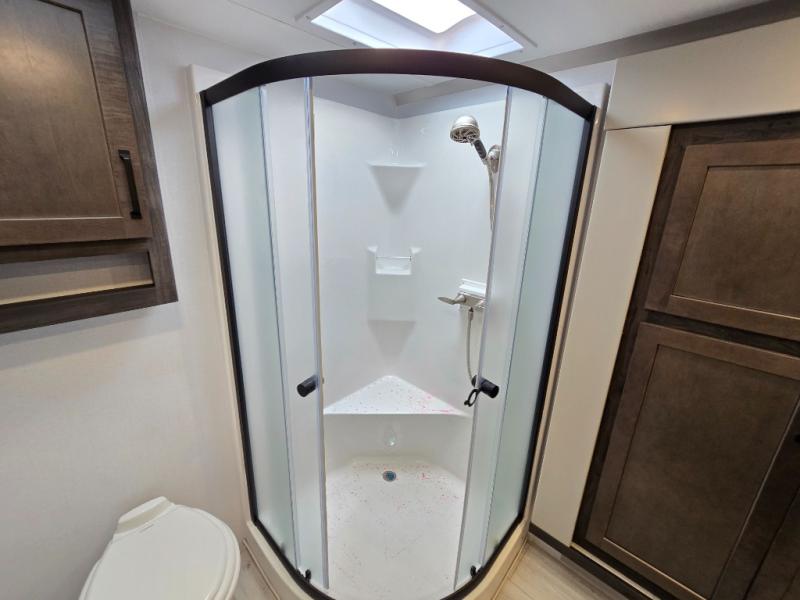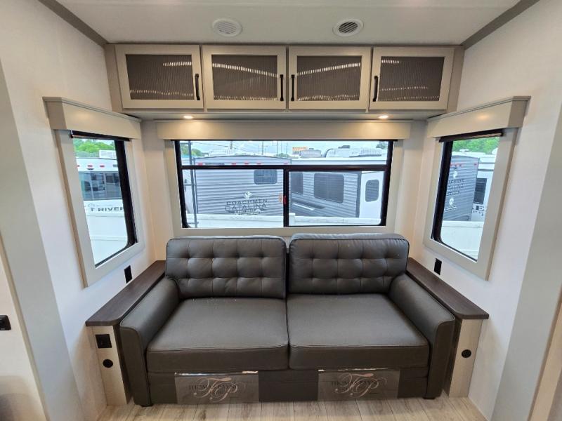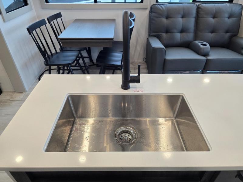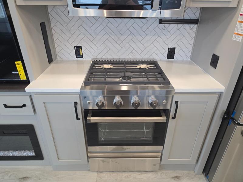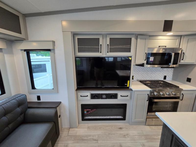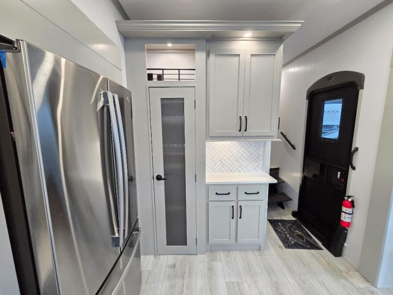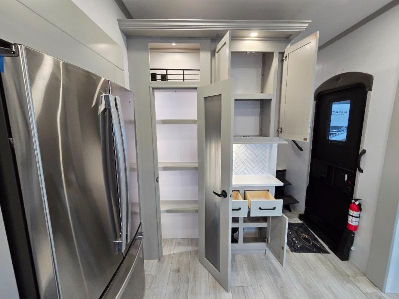 You can take this Montana High Country fifth wheel to the campsite of your choice! You'll have plenty of comfort with the king-size bed in the front master suite, and you can also let some friends or kids sleep on the hide-a-bed sofa in the rear living area. While you watch the 50" TV, you can sit back in the power theater seating, and you can switch on the fireplace for some added heat if it's cool outside. The opposing slides in the main living area are what give you extra space to work freely around the kitchen island, and the coffee station allows you to prepare your afternoon pick-me-up with all of your coffee essentials sitting in one place just like at home.