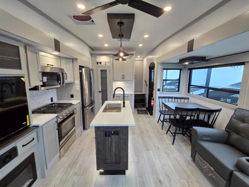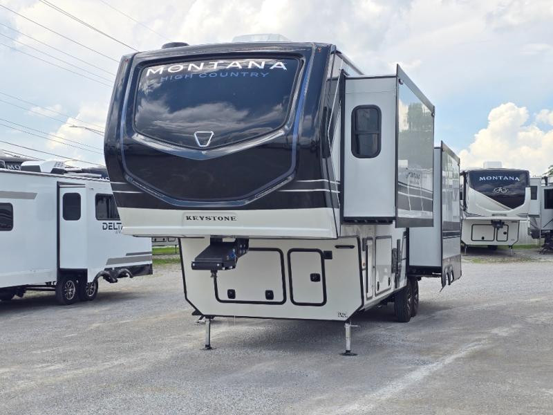 Live the high life with a Keystone Montana High Country fifth wheel! You'll have all the luxury you need with these units. They come with a MaxTurn™ front cap with KeyShield™ automotive-grade paint, a fully walkable roof with Alpha seamless TPO membrane system, and an insulated underbelly with forced hot air and electric tank heaters. The MORryde CRE3000 suspension with wet bolts helps provide a smooth tow, and the Ground Control® four-point electric auto-leveling with hitch memory will make set-up quite easy. The interior is elegantly appointed with the Thomas Payne Collection furniture, hardwood decorative slide-out fascia, Beauflor® vinyl throughout, accent crown molding, and premium solid surface kitchen countertops.