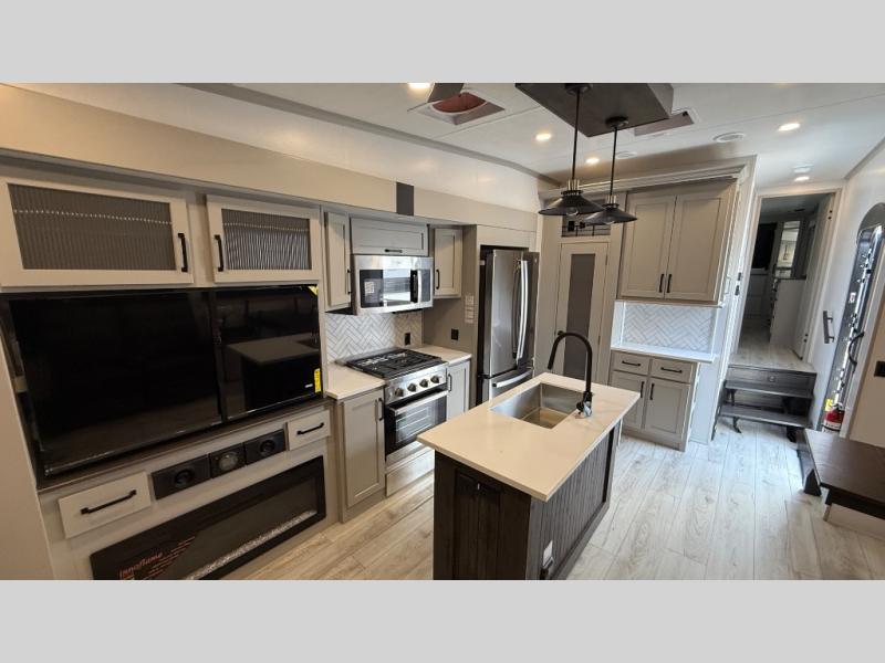 You can take this Montana High Country fifth wheel to the campsite of your choice! You'll have plenty of comfort with the king-size bed in the front master suite, and you can also let some friends or kids sleep on the hide-a-bed sofa in the rear living area. While you watch the 50" TV, you can sit back in the power theater seating, and you can switch on the fireplace for some added heat if it's cool outside. The opposing slides in the main living area are what give you extra space to work freely around the kitchen island, and the coffee station allows you to prepare your afternoon pick-me-up with all of your coffee essentials sitting in one place just like at home.