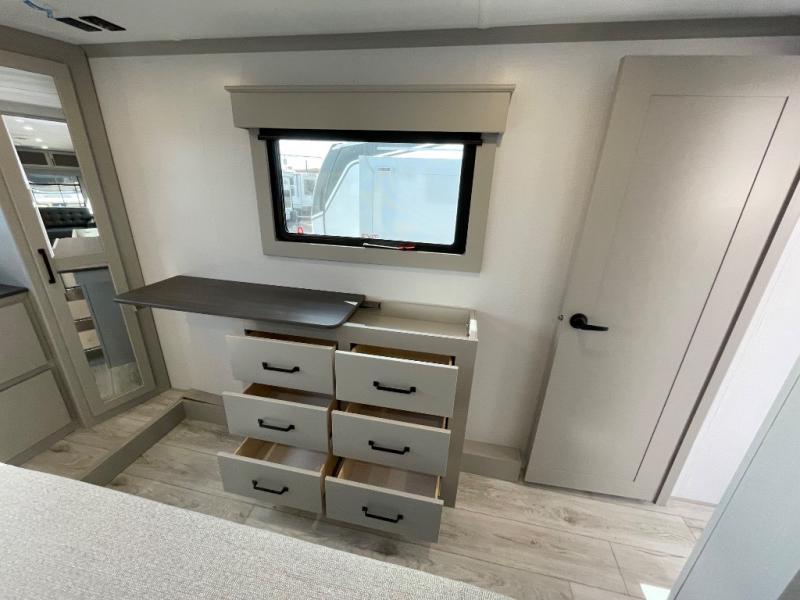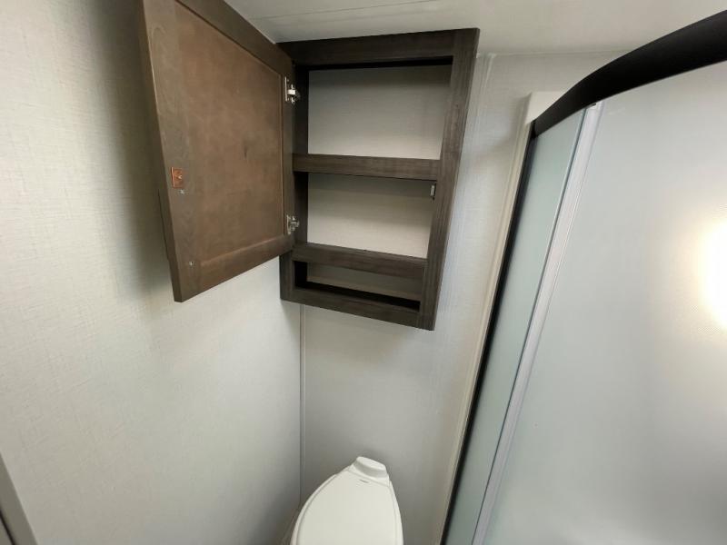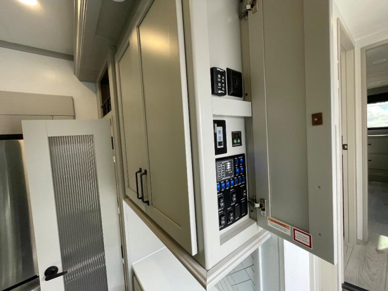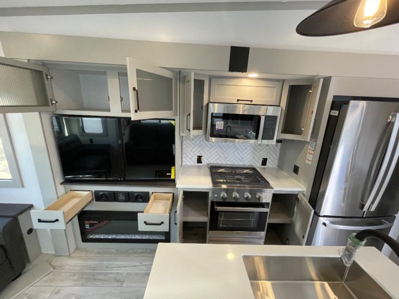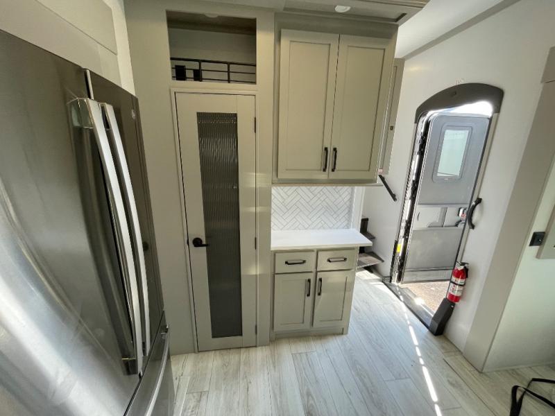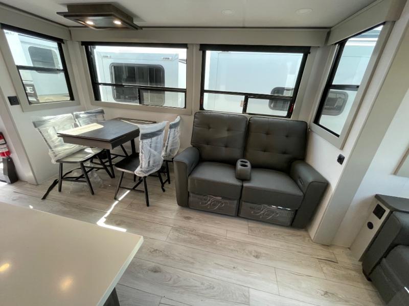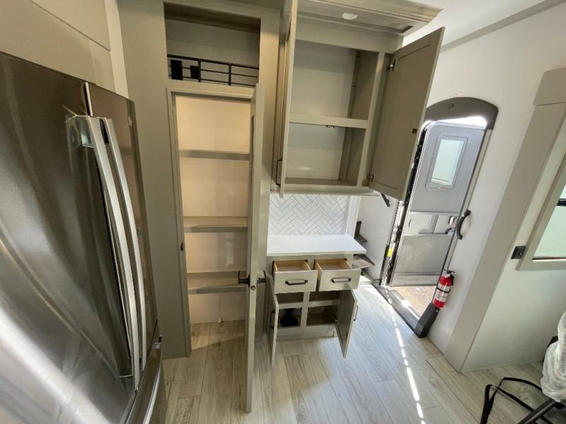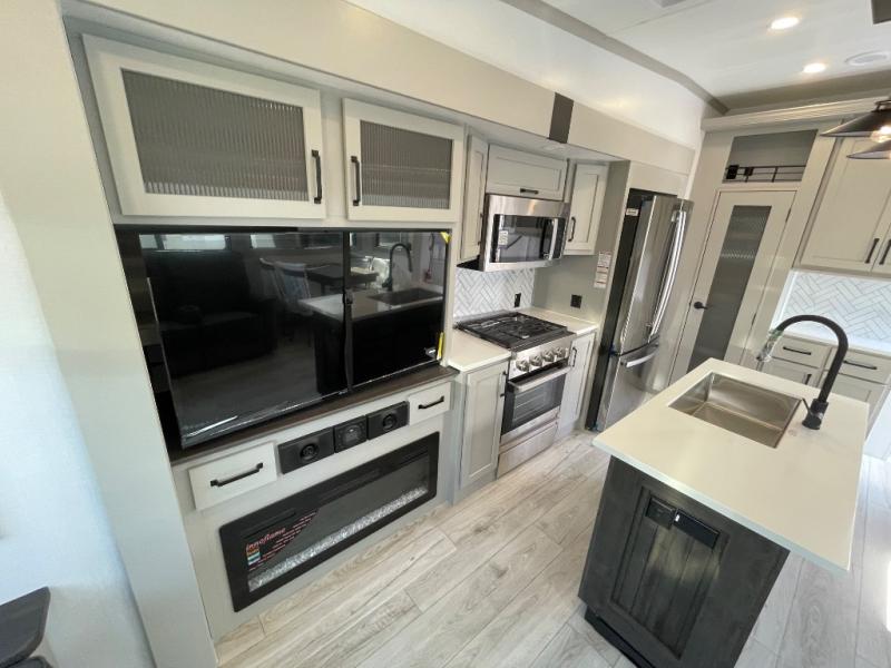 You can take this Montana High Country fifth wheel to the campsite of your choice! You'll have plenty of comfort with the king-size bed in the front master suite, and you can also let some friends or kids sleep on the hide-a-bed sofa in the rear living area. While you watch the 50" TV, you can sit back in the power theater seating, and you can switch on the fireplace for some added heat if it's cool outside. The opposing slides in the main living area are what give you extra space to work freely around the kitchen island, and the coffee station allows you to prepare your afternoon pick-me-up with all of your coffee essentials sitting in one place just like at home.