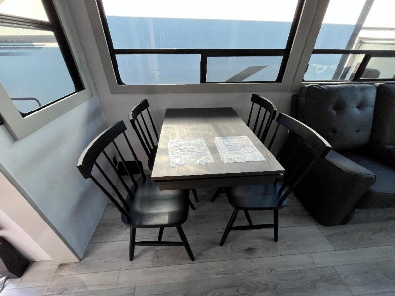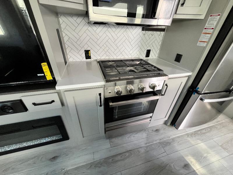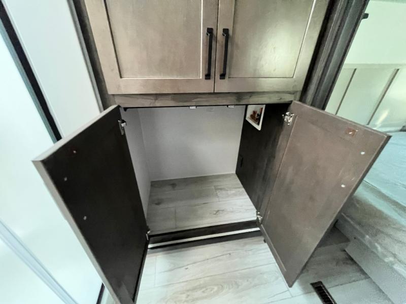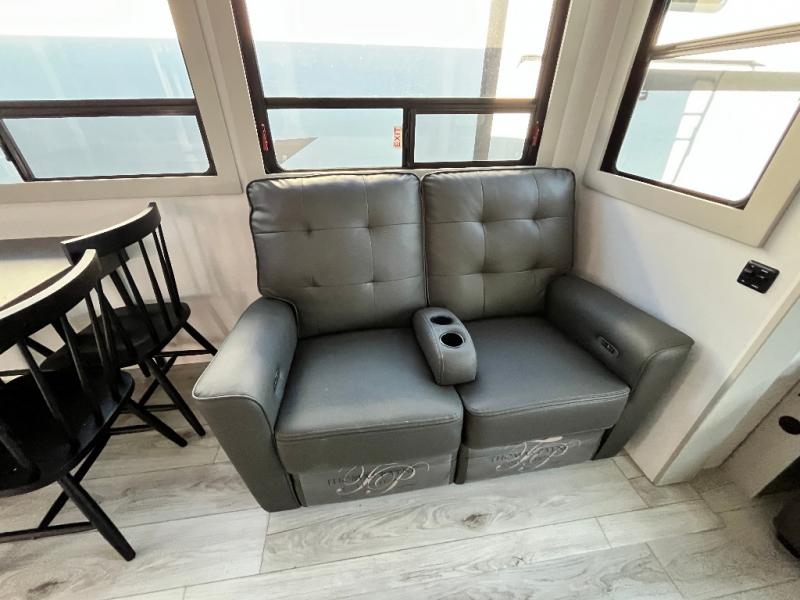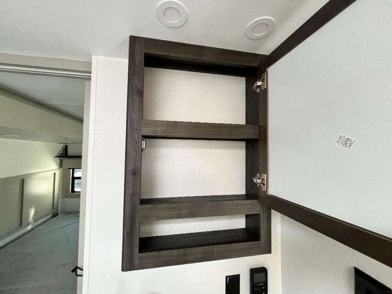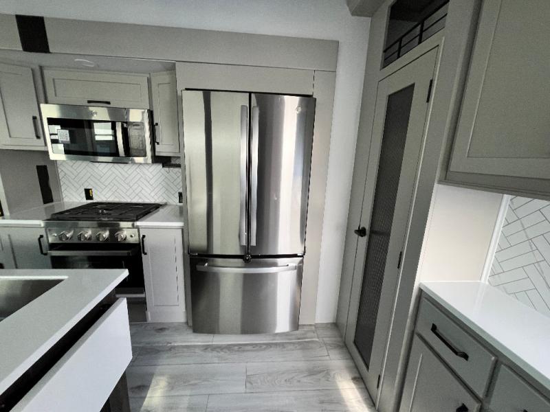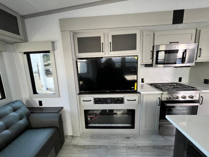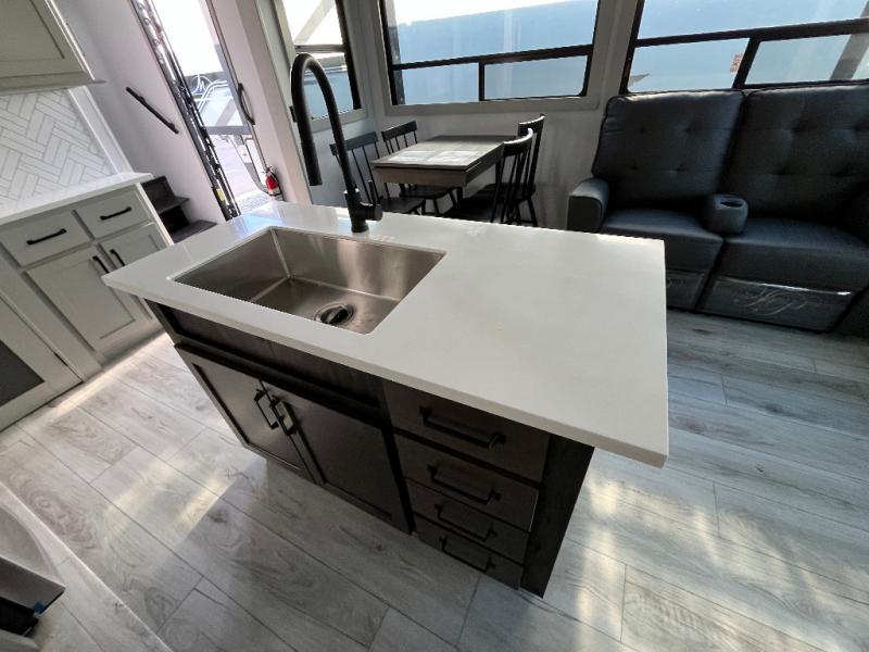 You can take this Montana High Country fifth wheel to the campsite of your choice! You'll have plenty of comfort with the king-size bed in the front master suite, and you can also let some friends or kids sleep on the hide-a-bed sofa in the rear living area. While you watch the 50" TV, you can sit back in the power theater seating, and you can switch on the fireplace for some added heat if it's cool outside. The opposing slides in the main living area are what give you extra space to work freely around the kitchen island, and the coffee station allows you to prepare your afternoon pick-me-up with all of your coffee essentials sitting in one place just like at home.