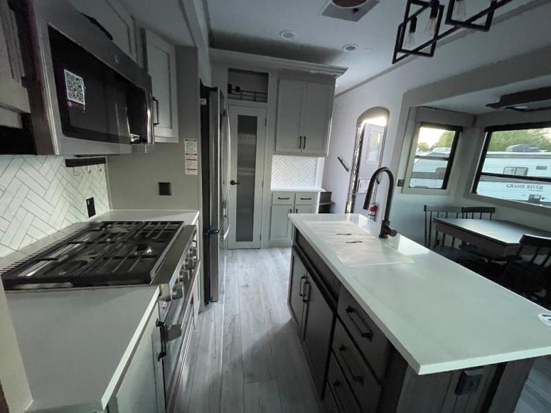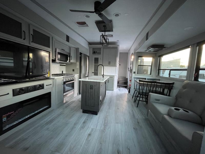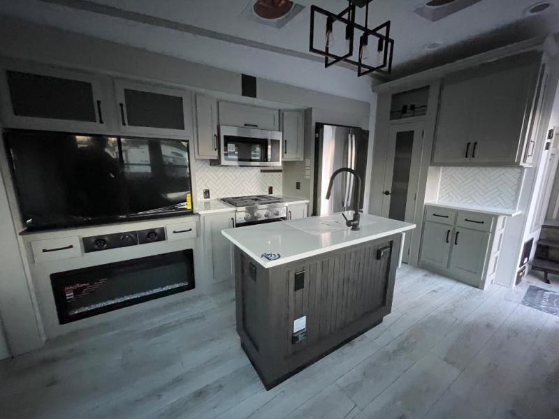 You can take this Montana High Country fifth wheel to the campsite of your choice! You'll have plenty of comfort with the king-size bed in the front master suite, and you can also let some friends or kids sleep on the hide-a-bed sofa in the rear living area. While you watch the 50" TV, you can sit back in the power theater seating, and you can switch on the fireplace for some added heat if it's cool outside. The opposing slides in the main living area are what give you extra space to work freely around the kitchen island, and the coffee station allows you to prepare your afternoon pick-me-up with all of your coffee essentials sitting in one place just like at home.