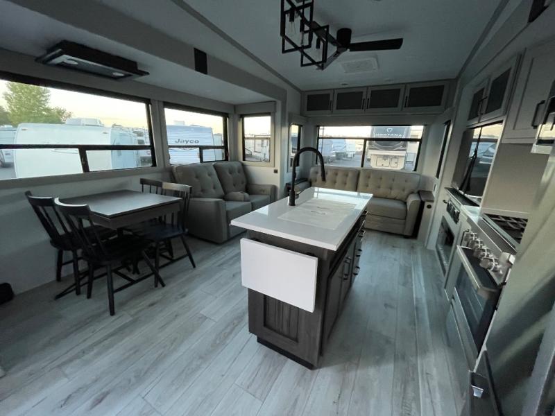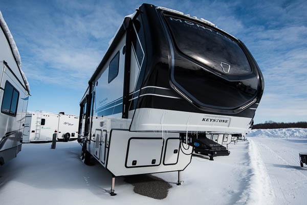 Live the high life with a Keystone Montana High Country fifth wheel! You'll have all the luxury you need with these units. They come with a MaxTurn™ front cap with KeyShield™ automotive-grade paint, a fully walkable roof with Alpha seamless TPO membrane system, and an insulated underbelly with forced hot air and electric tank heaters. The MORryde CRE3000 suspension with wet bolts helps provide a smooth tow, and the Ground Control® four-point electric auto-leveling with hitch memory will make set-up quite easy. The interior is elegantly appointed with the Thomas Payne Collection furniture, hardwood decorative slide-out fascia, Beauflor® vinyl throughout, accent crown molding, and premium solid surface kitchen countertops.