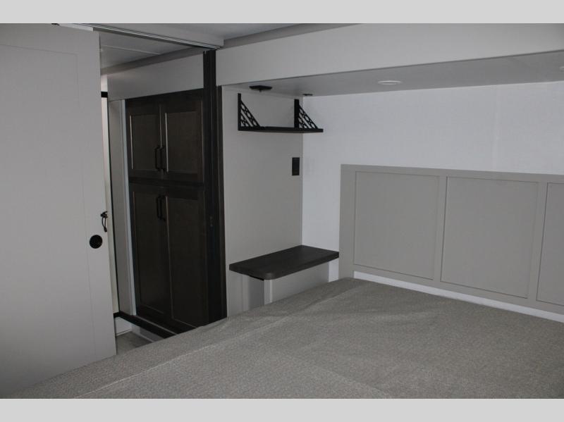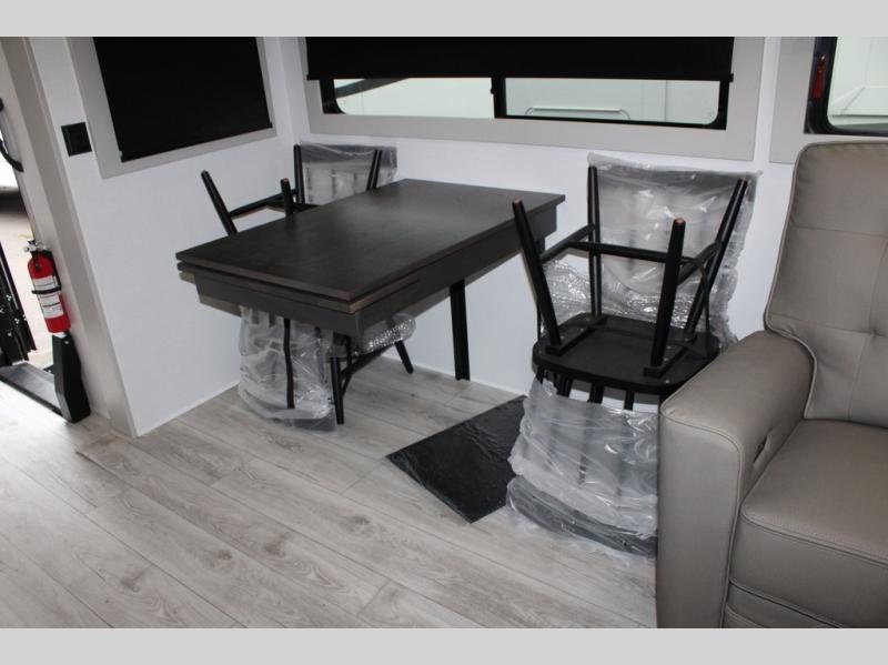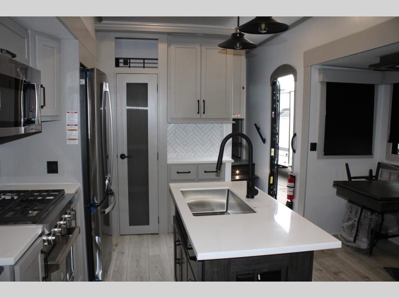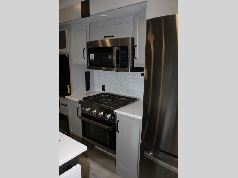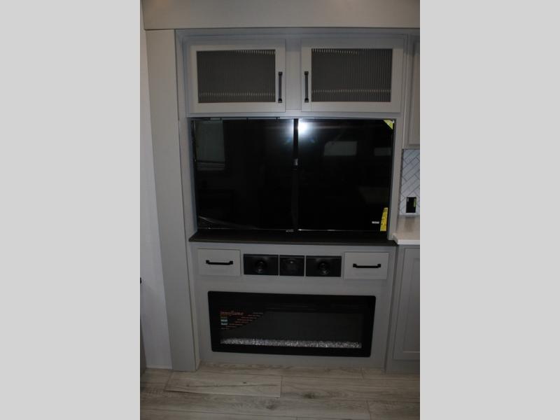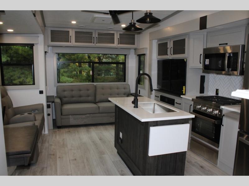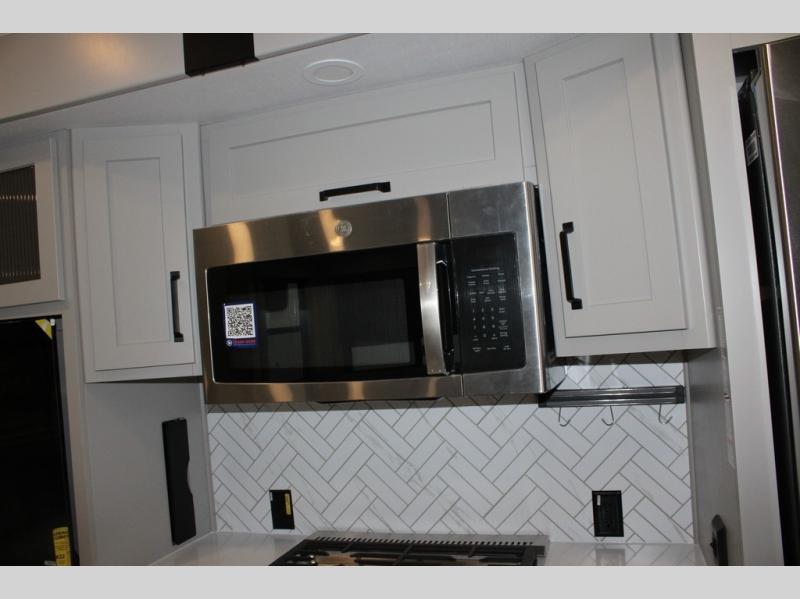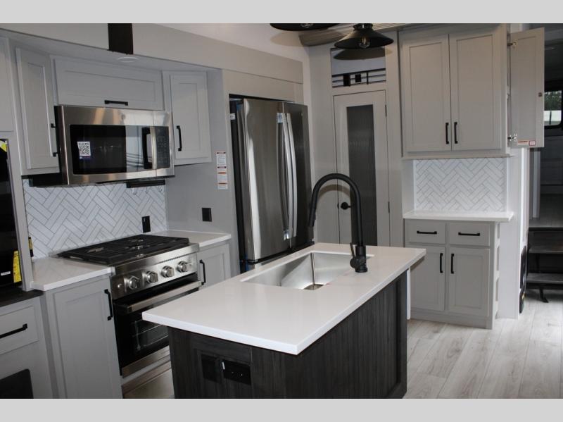 You can take this Montana High Country fifth wheel to the campsite of your choice! You'll have plenty of comfort with the king-size bed in the front master suite, and you can also let some friends or kids sleep on the hide-a-bed sofa in the rear living area. While you watch the 50" TV, you can sit back in the power theater seating, and you can switch on the fireplace for some added heat if it's cool outside. The opposing slides in the main living area are what give you extra space to work freely around the kitchen island, and the coffee station allows you to prepare your afternoon pick-me-up with all of your coffee essentials sitting in one place just like at home.