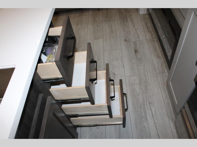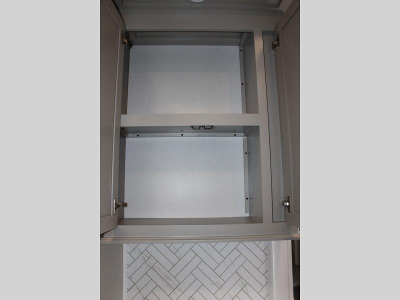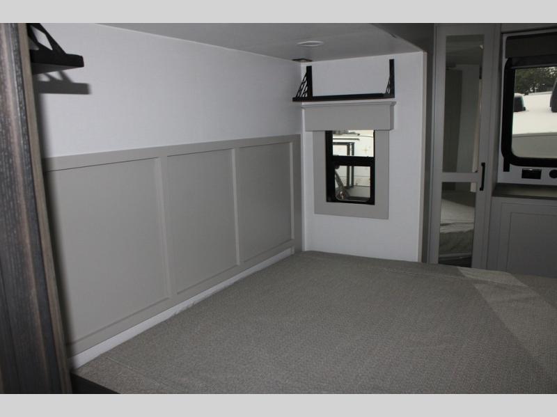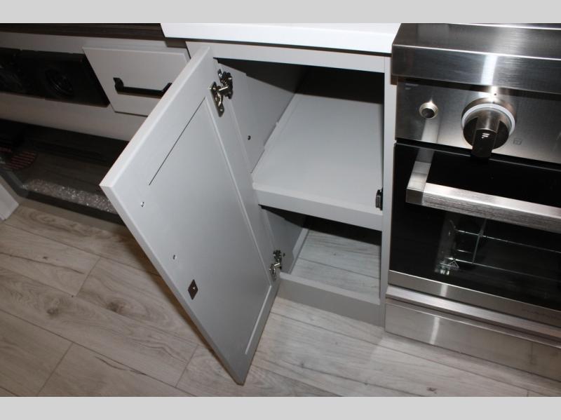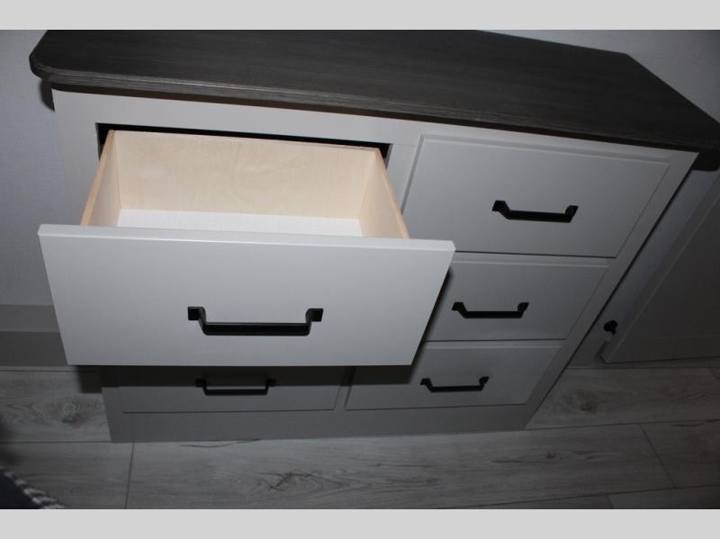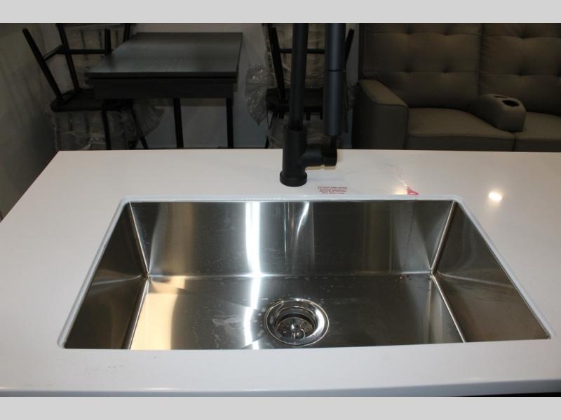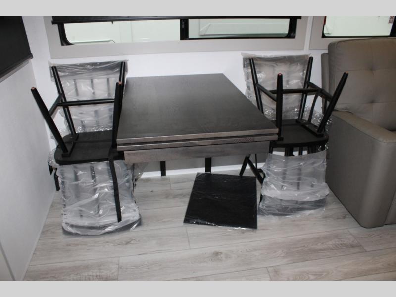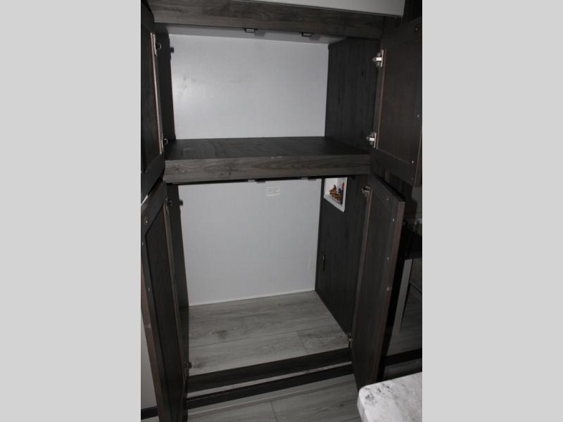 You can take this Montana High Country fifth wheel to the campsite of your choice! You'll have plenty of comfort with the king-size bed in the front master suite, and you can also let some friends or kids sleep on the hide-a-bed sofa in the rear living area. While you watch the 50" TV, you can sit back in the power theater seating, and you can switch on the fireplace for some added heat if it's cool outside. The opposing slides in the main living area are what give you extra space to work freely around the kitchen island, and the coffee station allows you to prepare your afternoon pick-me-up with all of your coffee essentials sitting in one place just like at home.