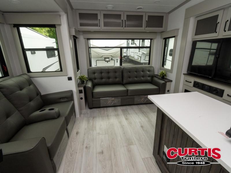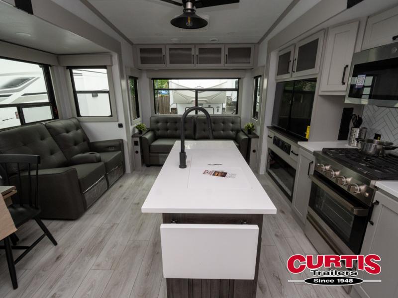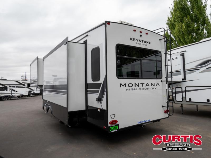 Live the high life with a Keystone Montana High Country fifth wheel! You'll have all the luxury you need with these units. They come with a MaxTurn™ front cap with KeyShield™ automotive-grade paint, a fully walkable roof with Alpha seamless TPO membrane system, and an insulated underbelly with forced hot air and electric tank heaters. The MORryde CRE3000 suspension with wet bolts helps provide a smooth tow, and the Ground Control® four-point electric auto-leveling with hitch memory will make set-up quite easy. The interior is elegantly appointed with the Thomas Payne Collection furniture, hardwood decorative slide-out fascia, Beauflor® vinyl throughout, accent crown molding, and premium solid surface kitchen countertops.