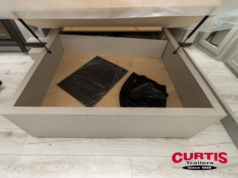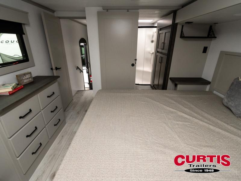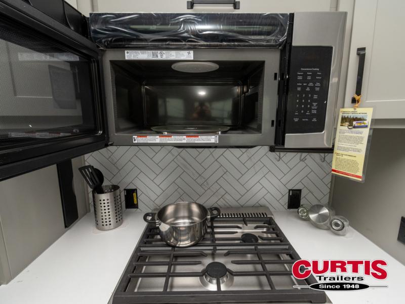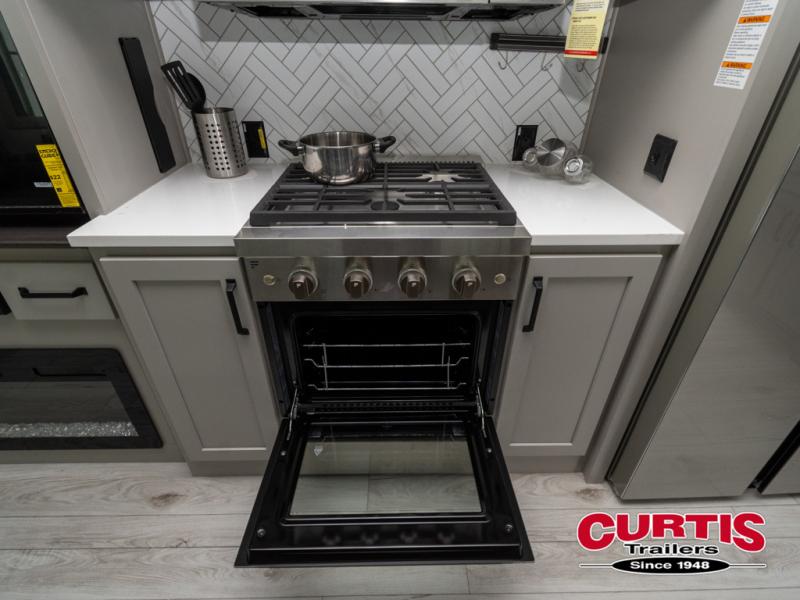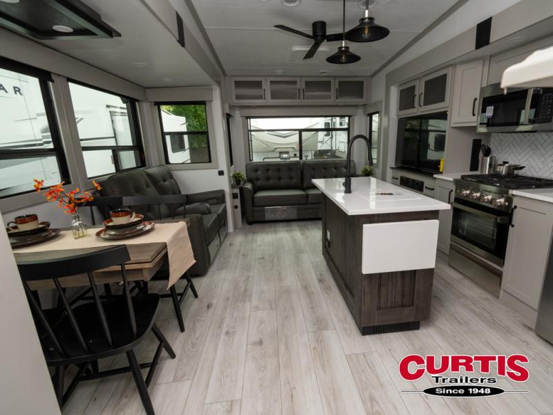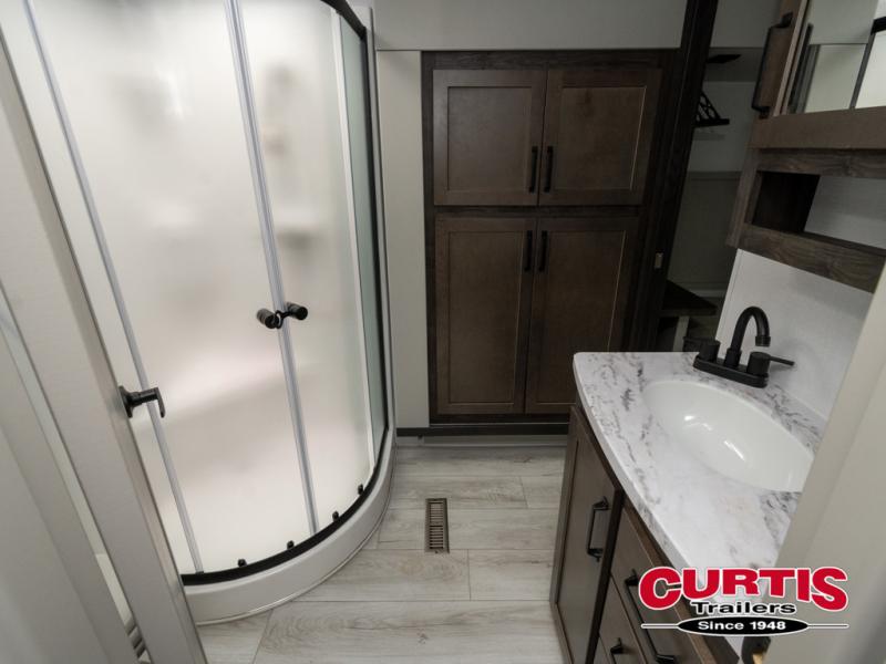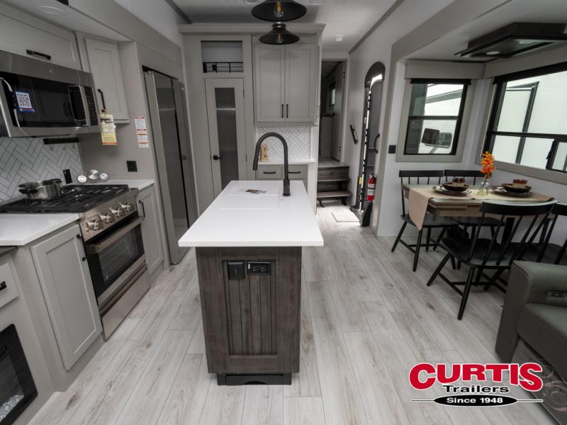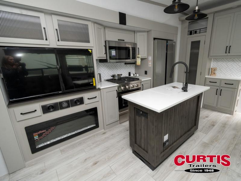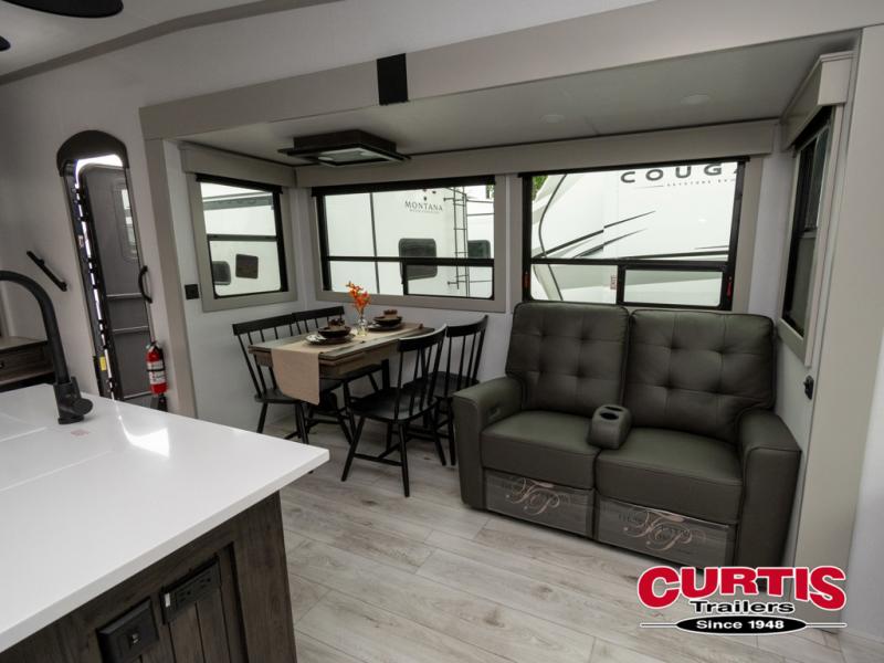 You can take this Montana High Country fifth wheel to the campsite of your choice! You'll have plenty of comfort with the king-size bed in the front master suite, and you can also let some friends or kids sleep on the hide-a-bed sofa in the rear living area. While you watch the 50" TV, you can sit back in the power theater seating, and you can switch on the fireplace for some added heat if it's cool outside. The opposing slides in the main living area are what give you extra space to work freely around the kitchen island, and the coffee station allows you to prepare your afternoon pick-me-up with all of your coffee essentials sitting in one place just like at home.