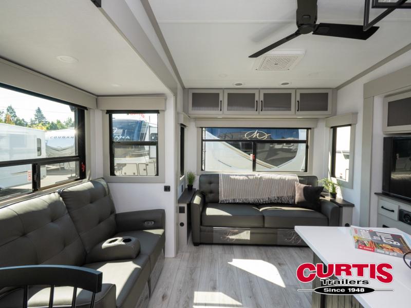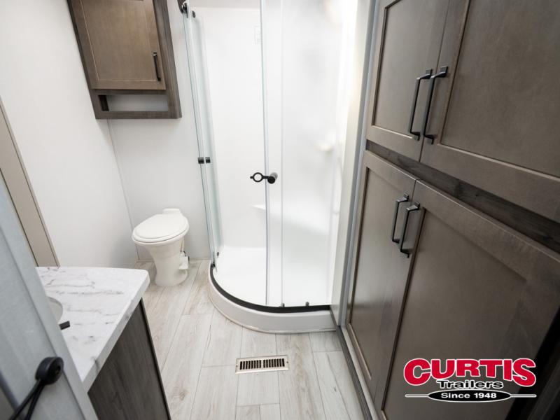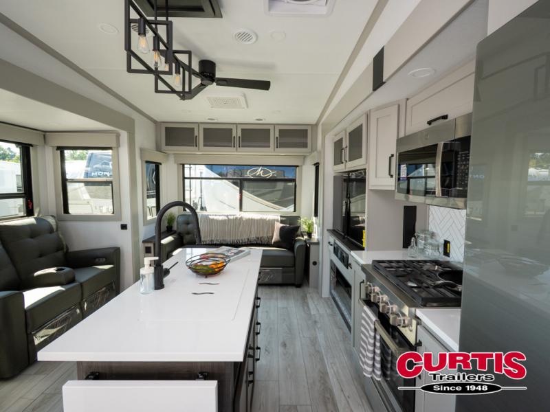 Live the high life with a Keystone Montana High Country fifth wheel! You'll have all the luxury you need with these units. They come with a MaxTurn™ front cap with KeyShield™ automotive-grade paint, a fully walkable roof with Alpha seamless TPO membrane system, and an insulated underbelly with forced hot air and electric tank heaters. The MORryde CRE3000 suspension with wet bolts helps provide a smooth tow, and the Ground Control® four-point electric auto-leveling with hitch memory will make set-up quite easy. The interior is elegantly appointed with the Thomas Payne Collection furniture, hardwood decorative slide-out fascia, Beauflor® vinyl throughout, accent crown molding, and premium solid surface kitchen countertops.
