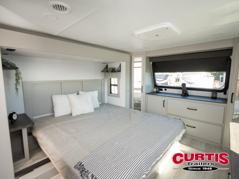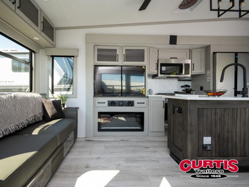 You can take this Montana High Country fifth wheel to the campsite of your choice! You'll have plenty of comfort with the king-size bed in the front master suite, and you can also let some friends or kids sleep on the hide-a-bed sofa in the rear living area. While you watch the 50" TV, you can sit back in the power theater seating, and you can switch on the fireplace for some added heat if it's cool outside. The opposing slides in the main living area are what give you extra space to work freely around the kitchen island, and the coffee station allows you to prepare your afternoon pick-me-up with all of your coffee essentials sitting in one place just like at home.