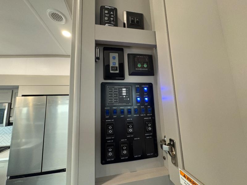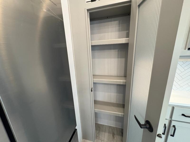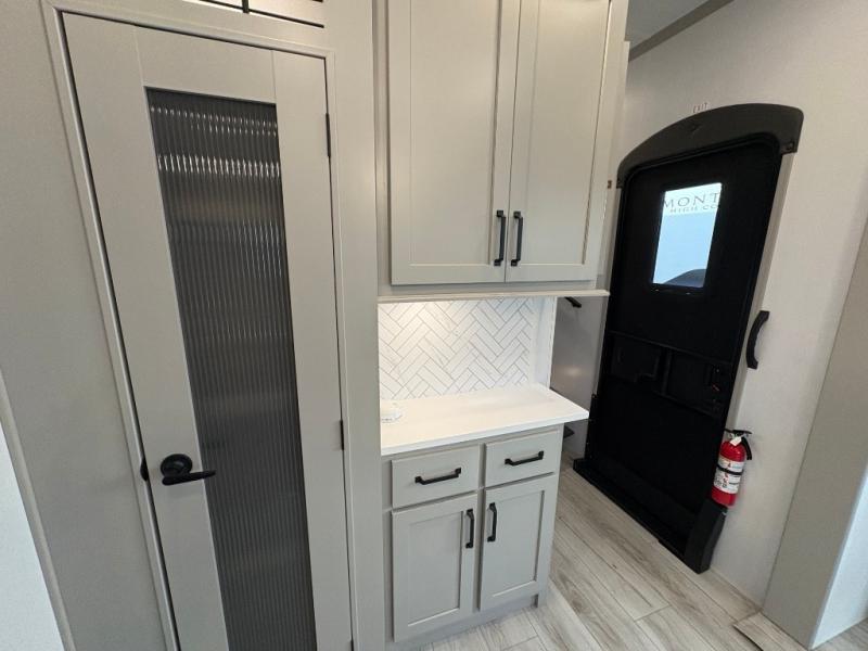 You can take this Montana High Country fifth wheel to the campsite of your choice! You'll have plenty of comfort with the king-size bed in the front master suite, and you can also let some friends or kids sleep on the hide-a-bed sofa in the rear living area. While you watch the 50" TV, you can sit back in the power theater seating, and you can switch on the fireplace for some added heat if it's cool outside. The opposing slides in the main living area are what give you extra space to work freely around the kitchen island, and the coffee station allows you to prepare your afternoon pick-me-up with all of your coffee essentials sitting in one place just like at home.