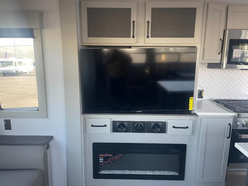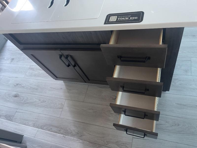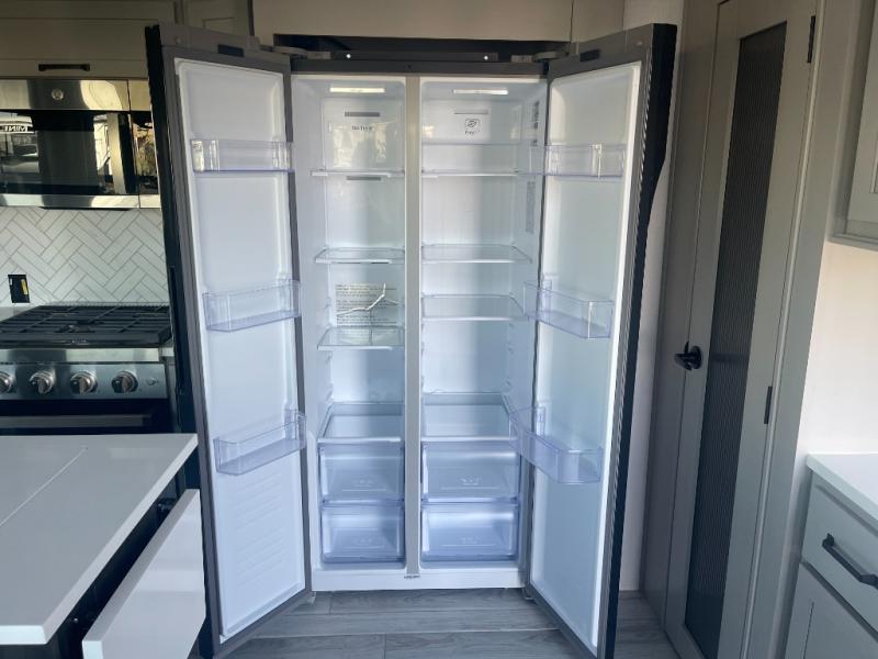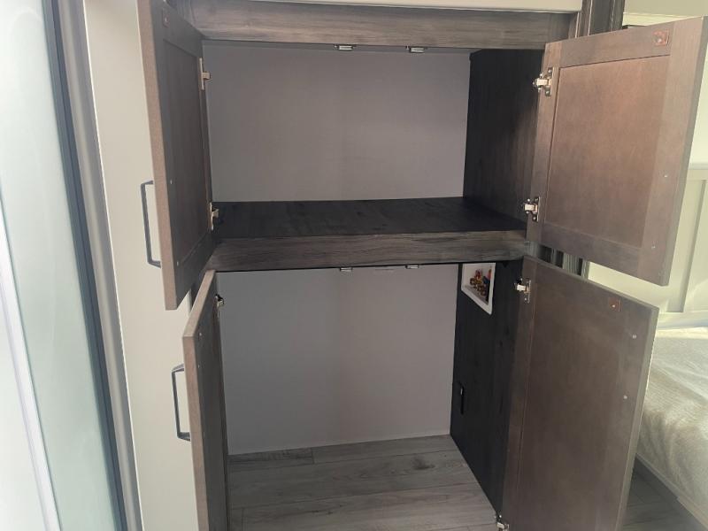 You can take this Montana High Country fifth wheel to the campsite of your choice! You'll have plenty of comfort with the king-size bed in the front master suite, and you can also let some friends or kids sleep on the hide-a-bed sofa in the rear living area. While you watch the 50" TV, you can sit back in the power theater seating, and you can switch on the fireplace for some added heat if it's cool outside. The opposing slides in the main living area are what give you extra space to work freely around the kitchen island, and the coffee station allows you to prepare your afternoon pick-me-up with all of your coffee essentials sitting in one place just like at home.