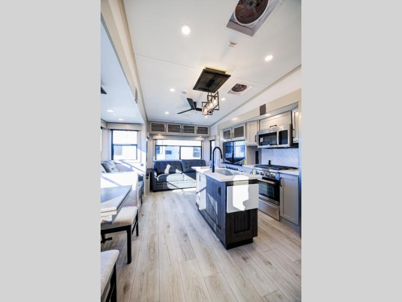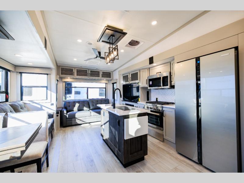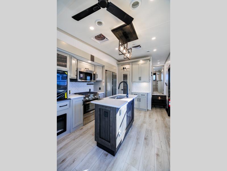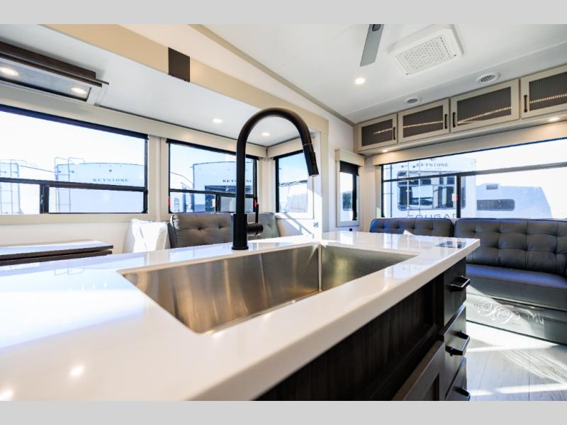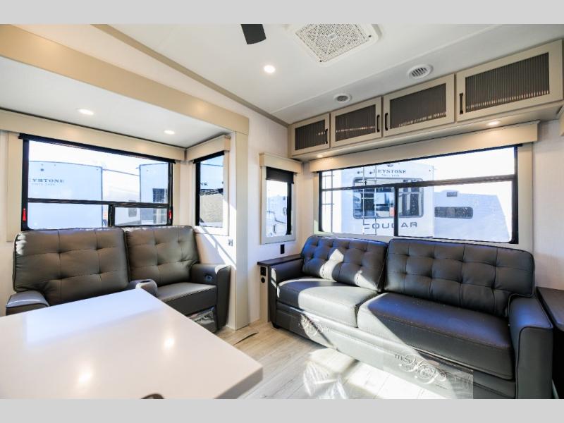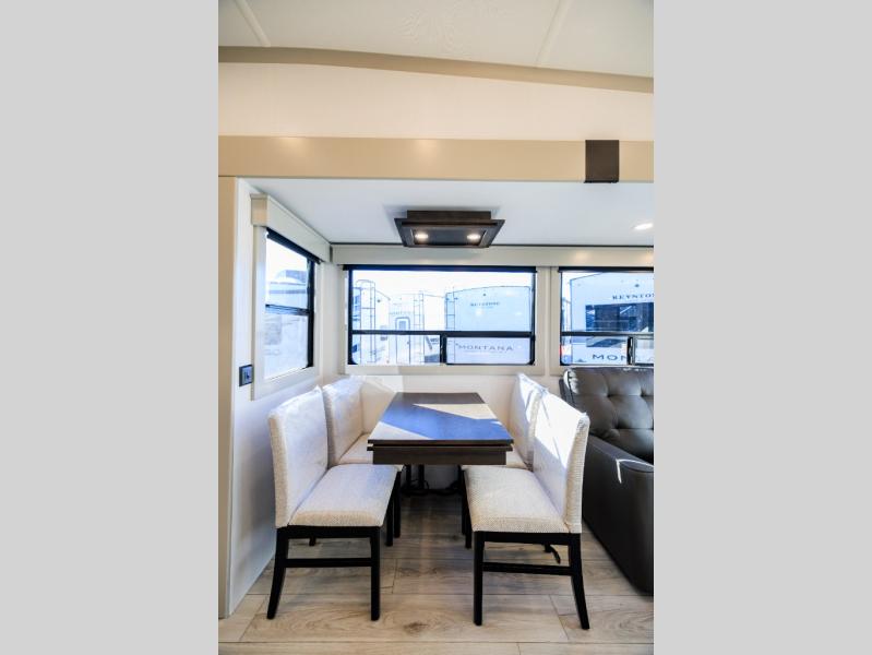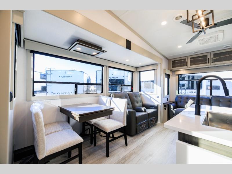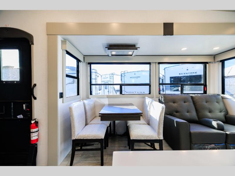 Live the high life with a Keystone Montana High Country fifth wheel! You'll have all the luxury you need with these units. They come with a MaxTurn™ front cap with KeyShield™ automotive-grade paint, a fully walkable roof with Alpha seamless TPO membrane system, and an insulated underbelly with forced hot air and electric tank heaters. The MORryde CRE3000 suspension with wet bolts helps provide a smooth tow, and the Ground Control® four-point electric auto-leveling with hitch memory will make set-up quite easy. The interior is elegantly appointed with the Thomas Payne Collection furniture, hardwood decorative slide-out fascia, Beauflor® vinyl throughout, accent crown molding, and premium solid surface kitchen countertops.