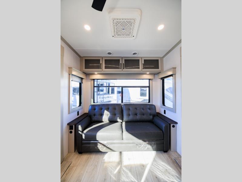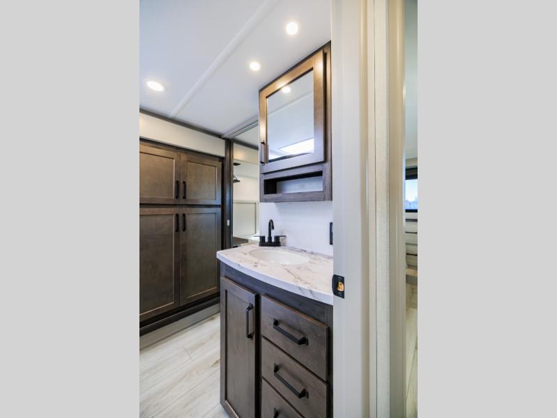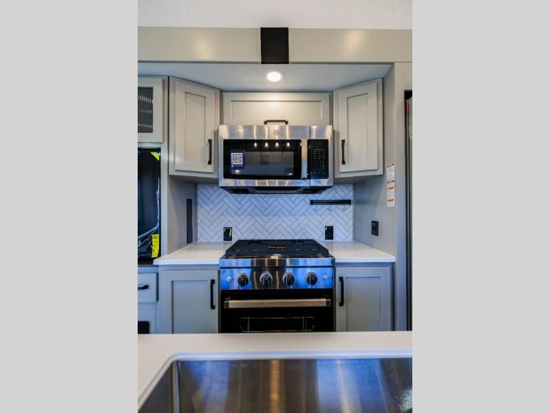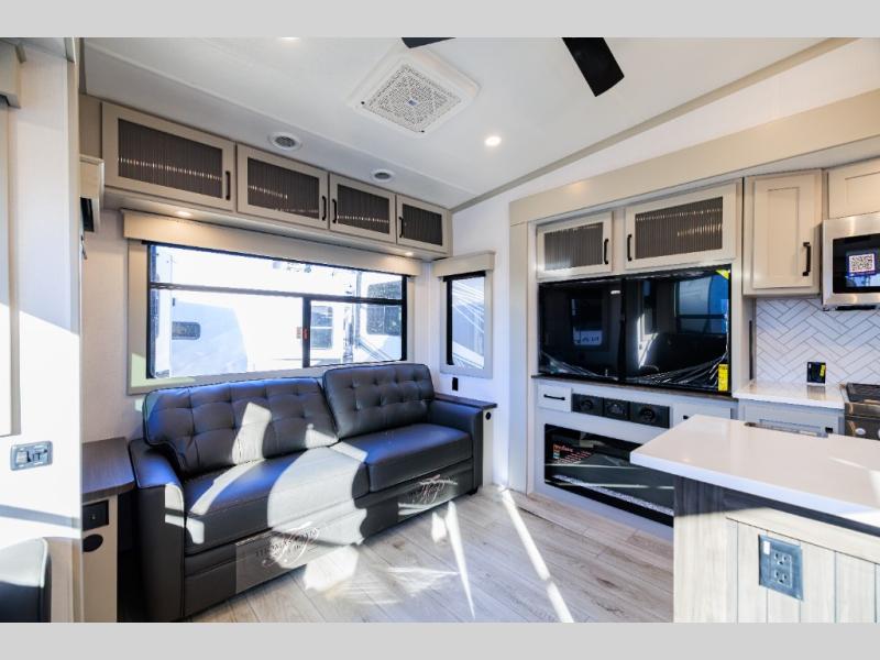 You can take this Montana High Country fifth wheel to the campsite of your choice! You'll have plenty of comfort with the king-size bed in the front master suite, and you can also let some friends or kids sleep on the hide-a-bed sofa in the rear living area. While you watch the 50" TV, you can sit back in the power theater seating, and you can switch on the fireplace for some added heat if it's cool outside. The opposing slides in the main living area are what give you extra space to work freely around the kitchen island, and the coffee station allows you to prepare your afternoon pick-me-up with all of your coffee essentials sitting in one place just like at home.