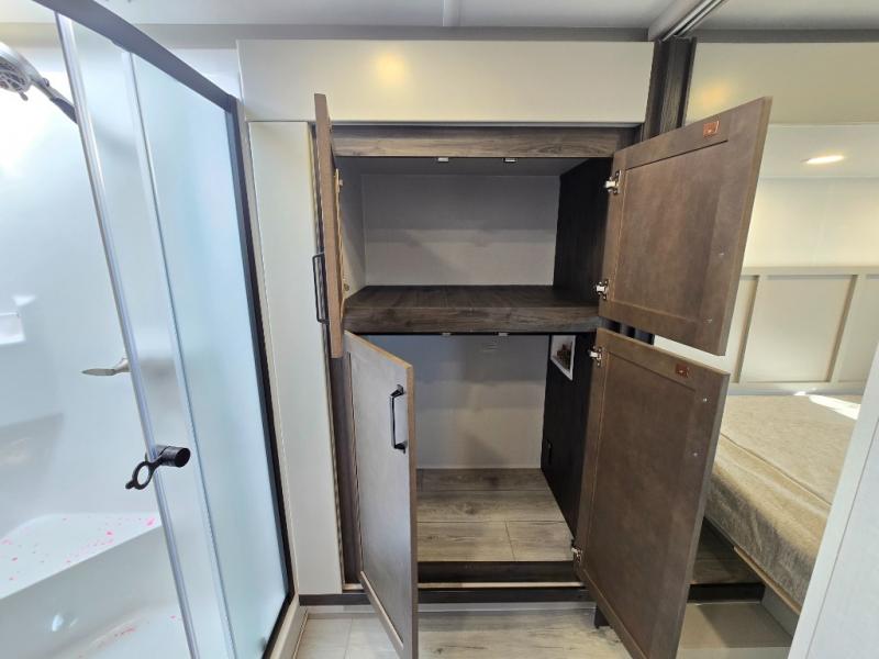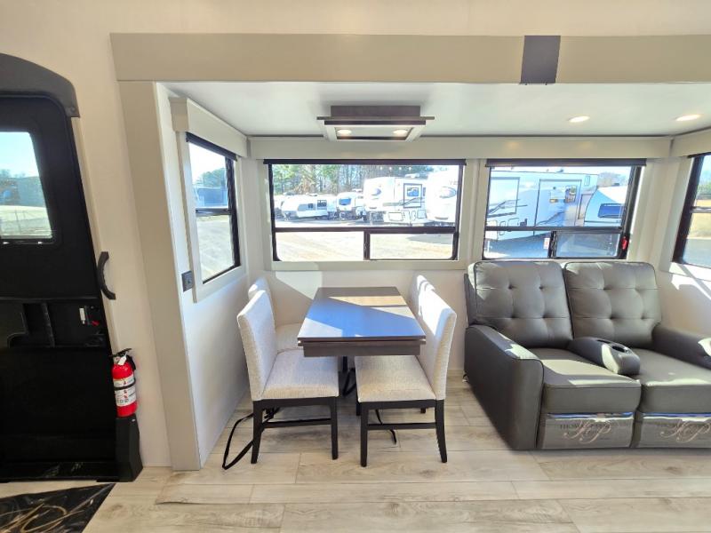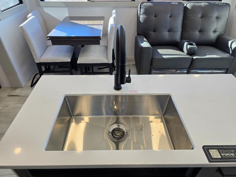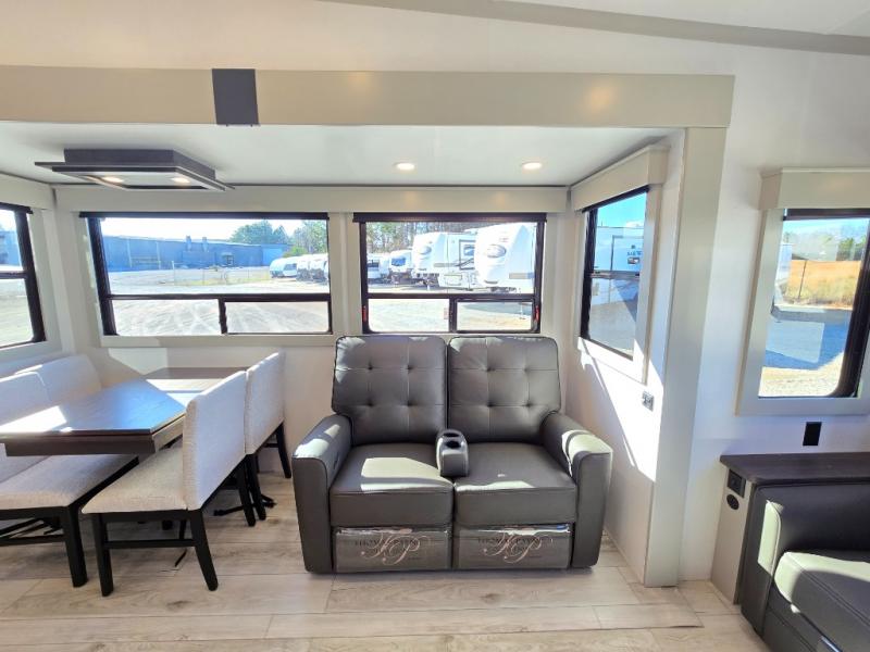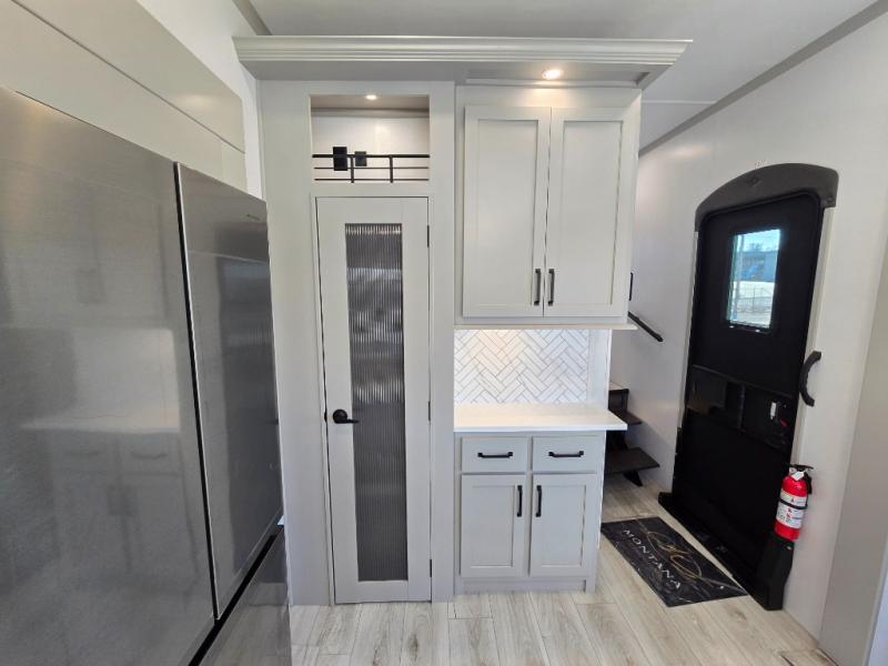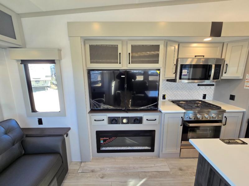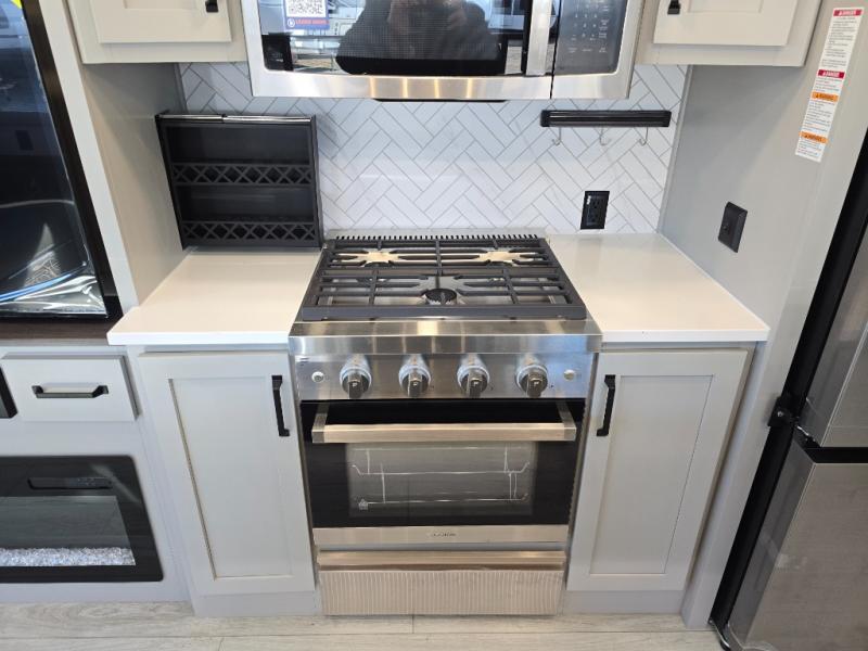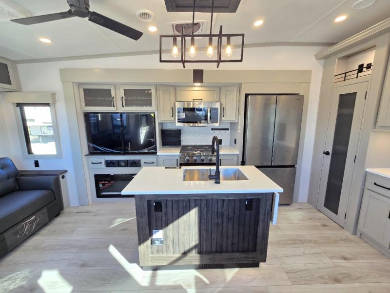 You can take this Montana High Country fifth wheel to the campsite of your choice! You'll have plenty of comfort with the king-size bed in the front master suite, and you can also let some friends or kids sleep on the hide-a-bed sofa in the rear living area. While you watch the 50" TV, you can sit back in the power theater seating, and you can switch on the fireplace for some added heat if it's cool outside. The opposing slides in the main living area are what give you extra space to work freely around the kitchen island, and the coffee station allows you to prepare your afternoon pick-me-up with all of your coffee essentials sitting in one place just like at home.