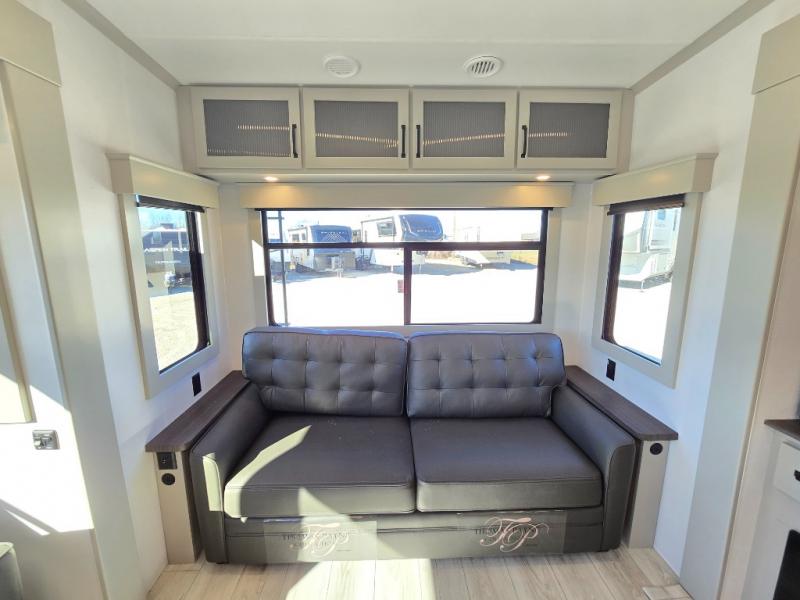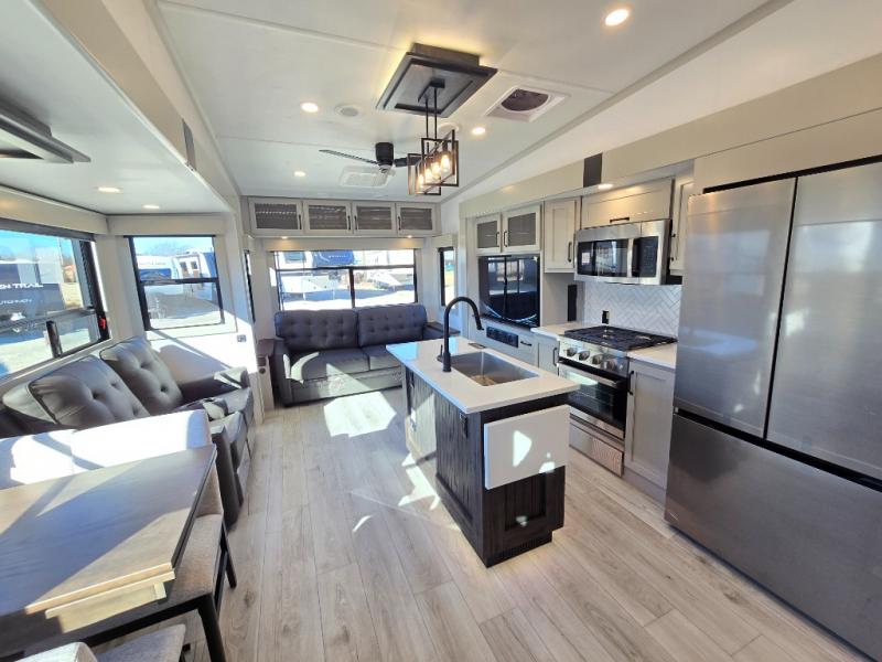 Live the high life with a Keystone Montana High Country fifth wheel! You'll have all the luxury you need with these units. They come with a MaxTurn™ front cap with KeyShield™ automotive-grade paint, a fully walkable roof with Alpha seamless TPO membrane system, and an insulated underbelly with forced hot air and electric tank heaters. The MORryde CRE3000 suspension with wet bolts helps provide a smooth tow, and the Ground Control® four-point electric auto-leveling with hitch memory will make set-up quite easy. The interior is elegantly appointed with the Thomas Payne Collection furniture, hardwood decorative slide-out fascia, Beauflor® vinyl throughout, accent crown molding, and premium solid surface kitchen countertops.