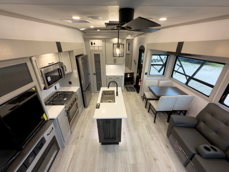 Overview: This three-slide, rear-living fifth wheel offers premier space in a manageable 34-foot length. With a front king suite and rear theatre lounge, it’s ideal for Michigan getaways and beyond.