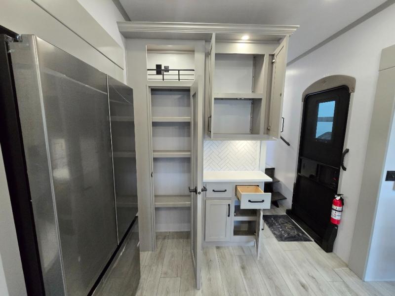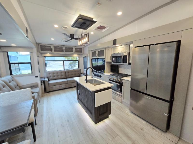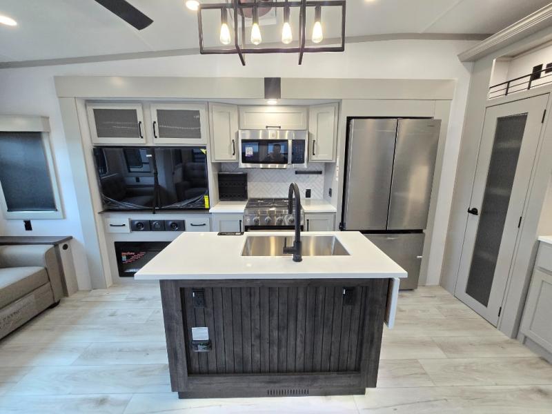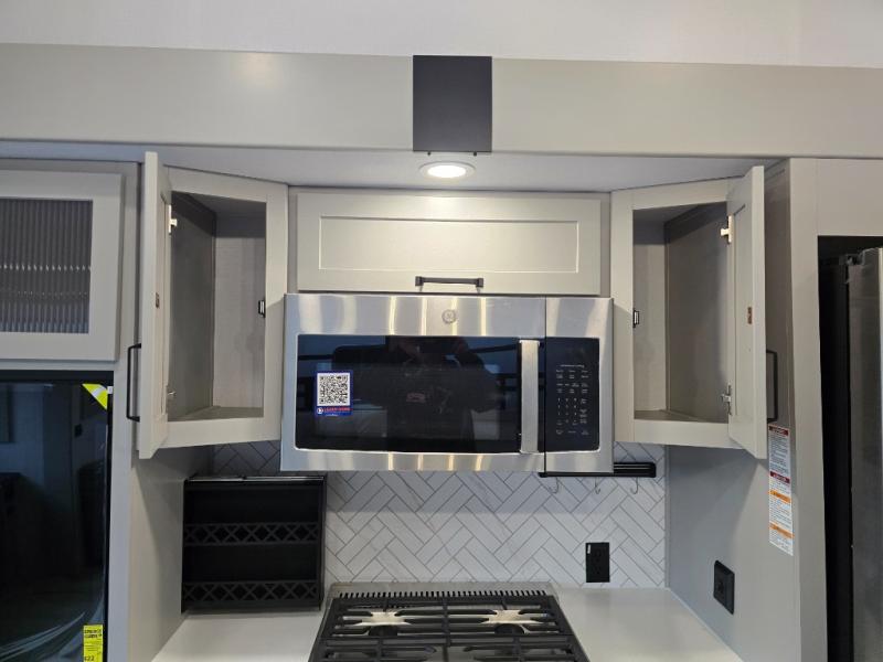 You can take this Montana High Country fifth wheel to the campsite of your choice! You'll have plenty of comfort with the king-size bed in the front master suite, and you can also let some friends or kids sleep on the hide-a-bed sofa in the rear living area. While you watch the 50" TV, you can sit back in the power theater seating, and you can switch on the fireplace for some added heat if it's cool outside. The opposing slides in the main living area are what give you extra space to work freely around the kitchen island, and the coffee station allows you to prepare your afternoon pick-me-up with all of your coffee essentials sitting in one place just like at home.