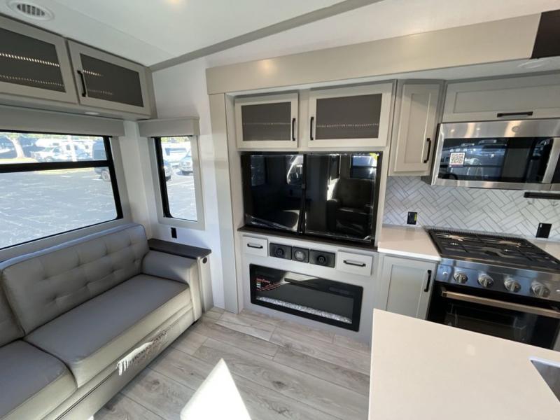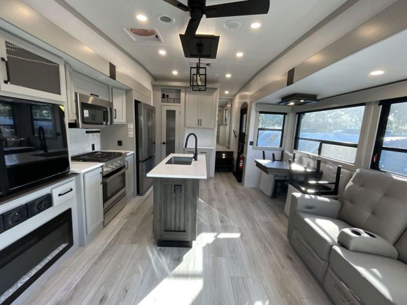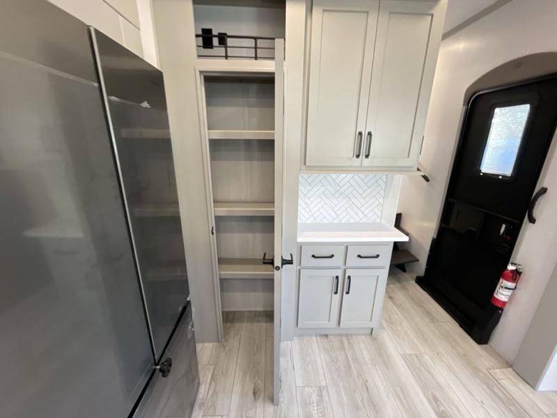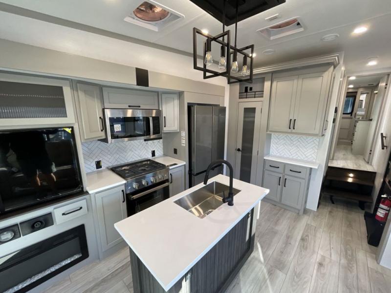 You can take this Montana High Country fifth wheel to the campsite of your choice! You'll have plenty of comfort with the king-size bed in the front master suite, and you can also let some friends or kids sleep on the hide-a-bed sofa in the rear living area. While you watch the 50" TV, you can sit back in the power theater seating, and you can switch on the fireplace for some added heat if it's cool outside. The opposing slides in the main living area are what give you extra space to work freely around the kitchen island, and the coffee station allows you to prepare your afternoon pick-me-up with all of your coffee essentials sitting in one place just like at home.