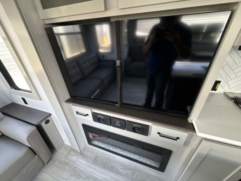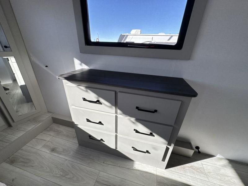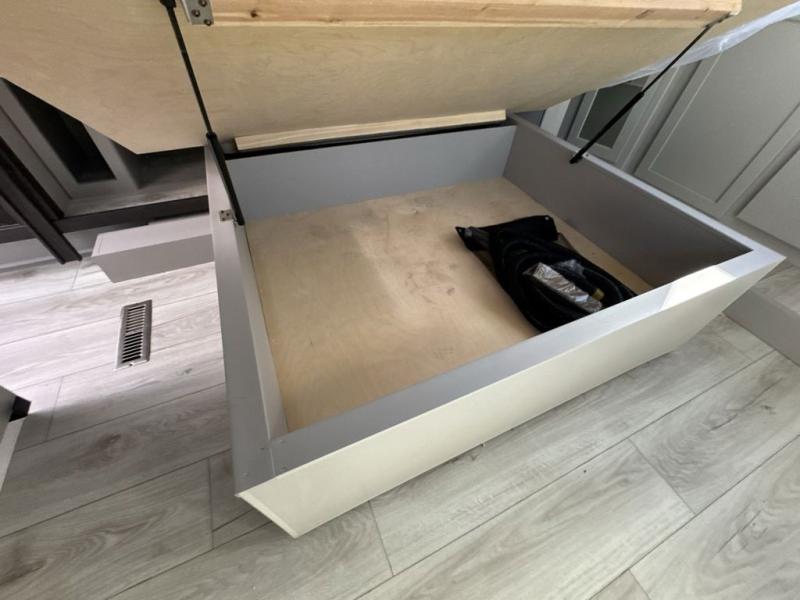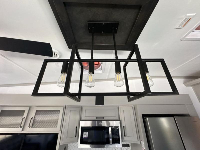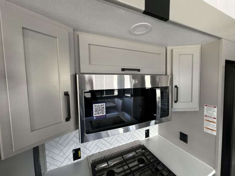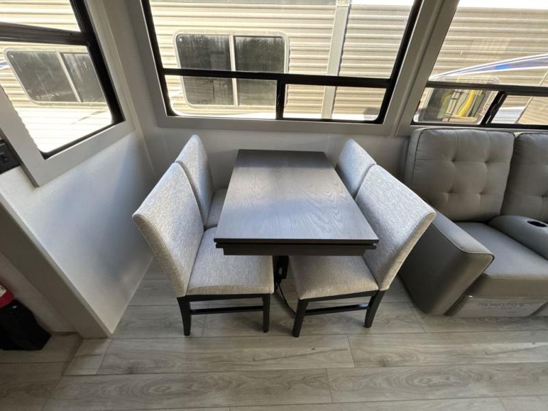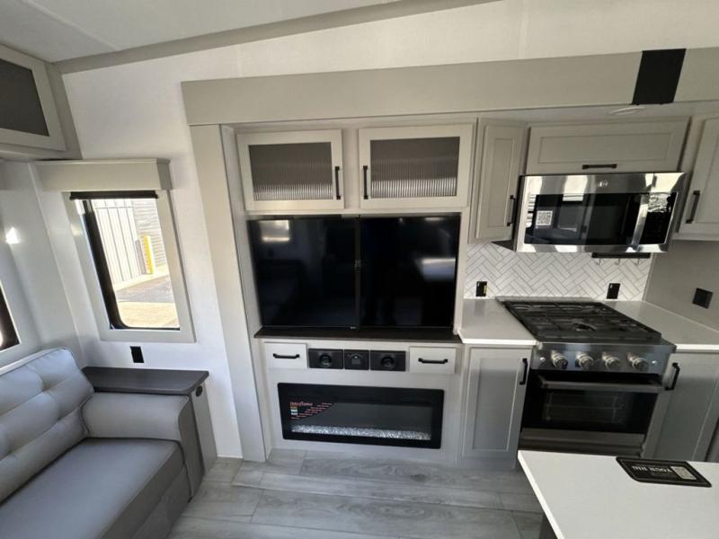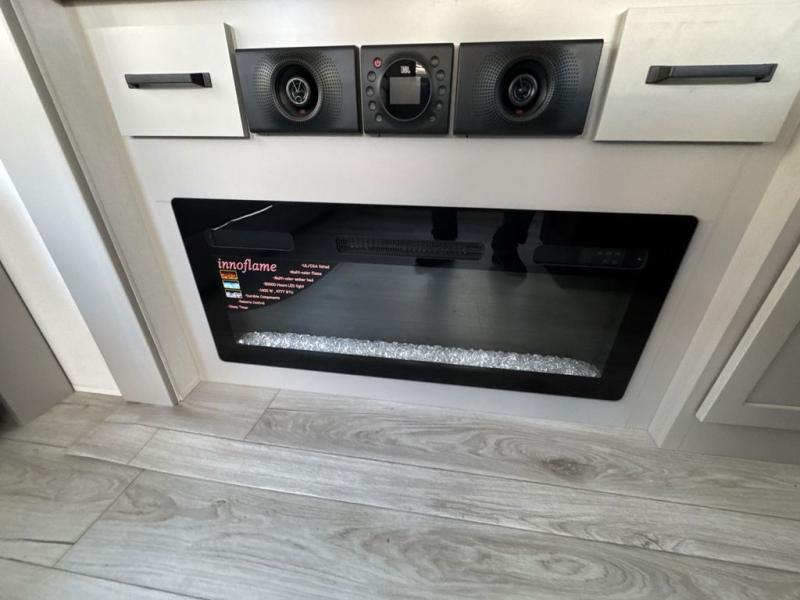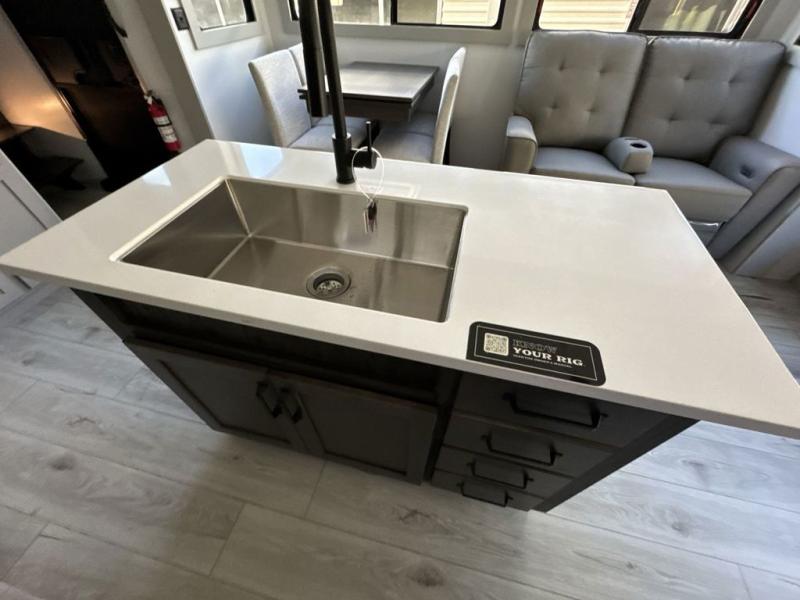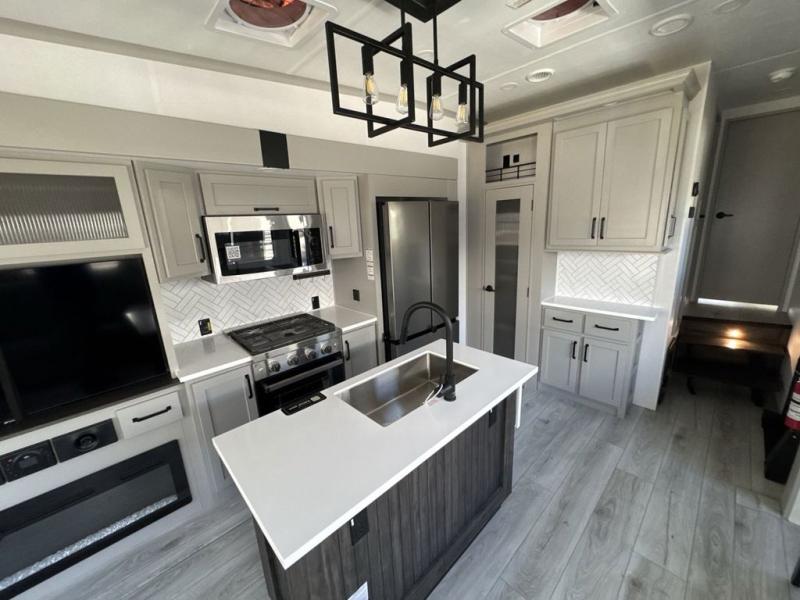 You can take this Montana High Country fifth wheel to the campsite of your choice! You'll have plenty of comfort with the king-size bed in the front master suite, and you can also let some friends or kids sleep on the hide-a-bed sofa in the rear living area. While you watch the 50" TV, you can sit back in the power theater seating, and you can switch on the fireplace for some added heat if it's cool outside. The opposing slides in the main living area are what give you extra space to work freely around the kitchen island, and the coffee station allows you to prepare your afternoon pick-me-up with all of your coffee essentials sitting in one place just like at home.