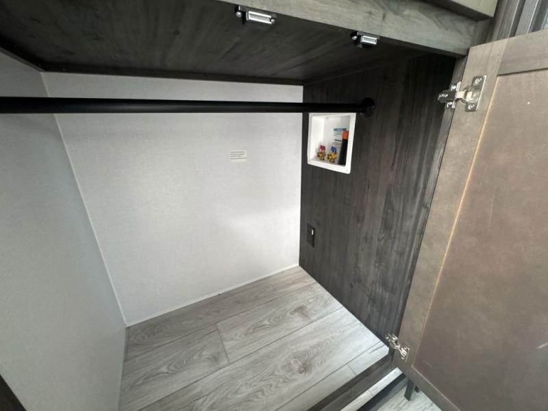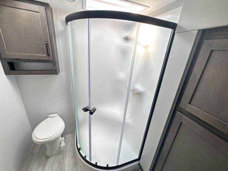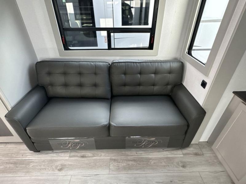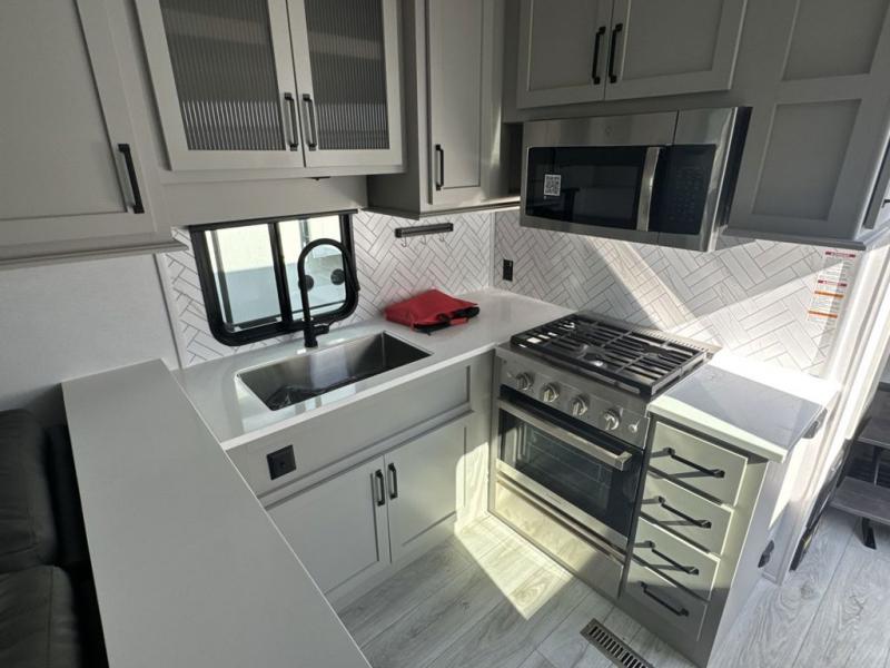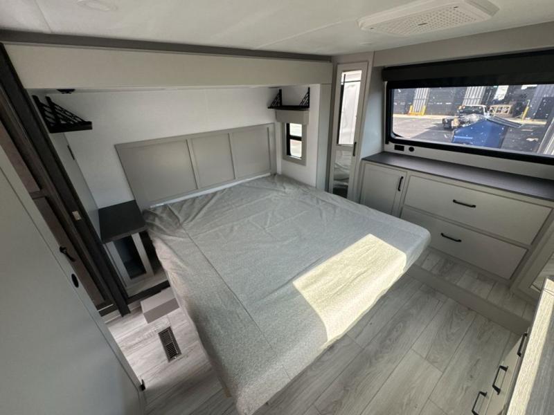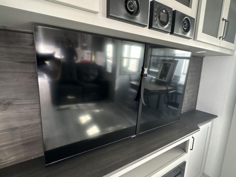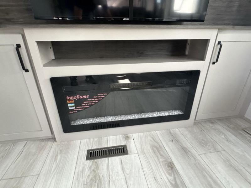 This couples coach will have you excited about traveling to all of your favorite places, and new locations too! The triple slide unit features an open concept living/dining area with dual opposing slides at the very back featuring a hide-a-bed sofa along the curbside, and a dining space opposite with a booth dinette or choose the optional table and four chairs. Power theater seats will be a comfortable place to kick back for a movie, and you will love the all-new entertainment center design featuring a fireplace, Smart TV, and overhead cabinets. In the evening, head up to your private retreat with a spacious bath including dual entry doors from the hall at the top of the stairs or from within the private bedroom. Get cleaned up in the large radius shower with seat and snuggle up in a king bed slide. The bedroom slide also features a large wardrobe that has been prepped for a washer/dryer if you choose to add the convenience. You will find plenty more storage spaces for your clothing and belongings in the two dressers or dual wardrobes along the full front wall. Another bonus with this unit is the outdoor kitchen which gives you a choice to cook inside or out!