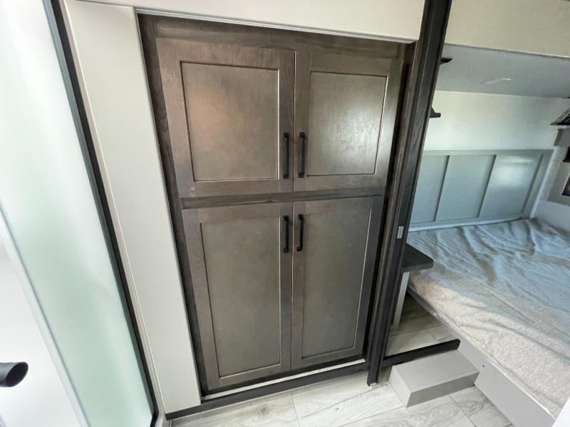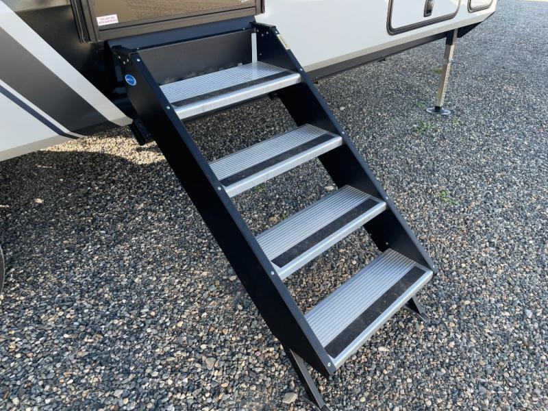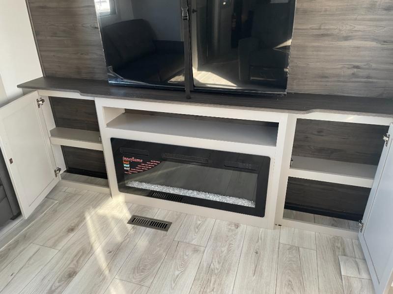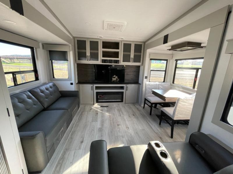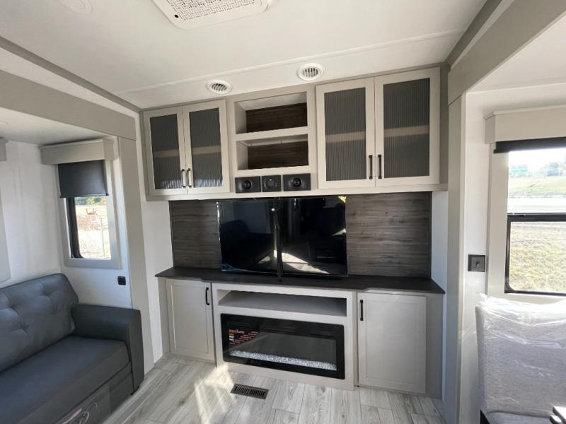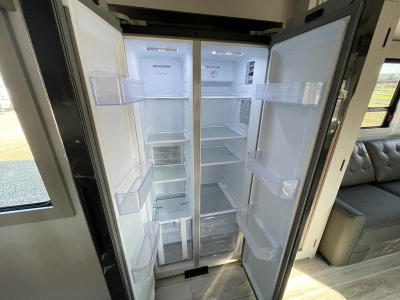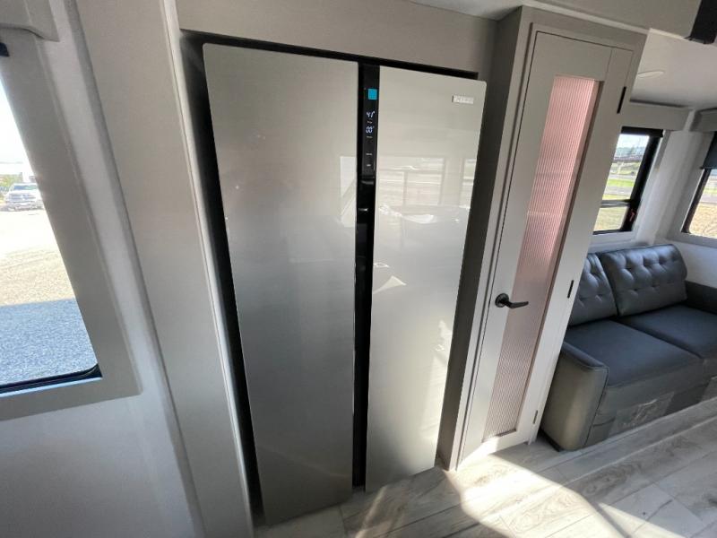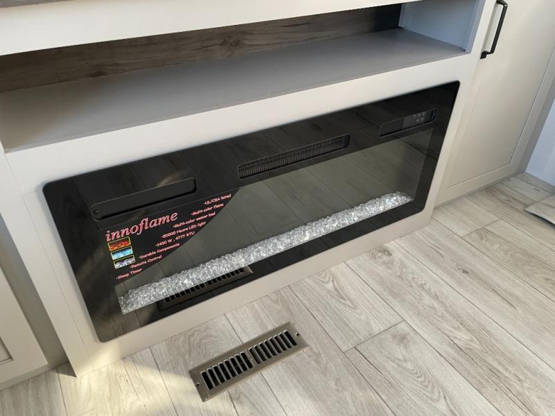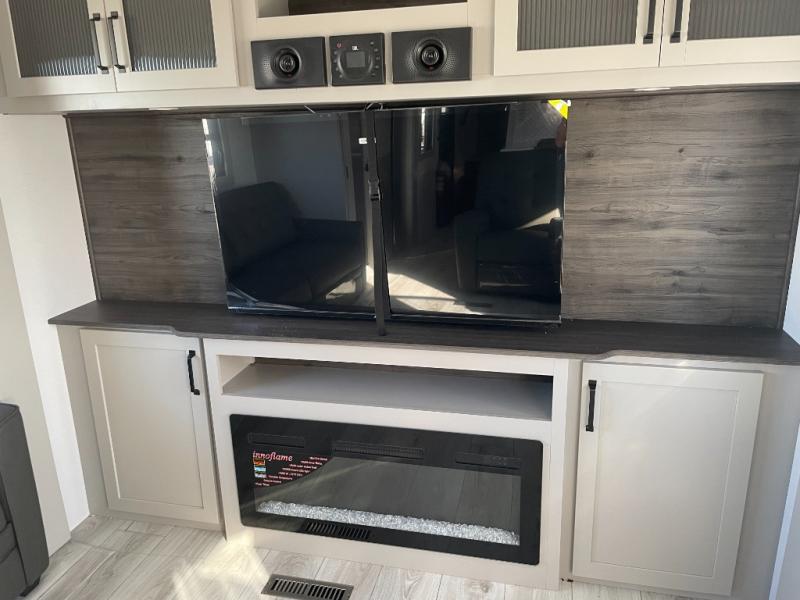 This couples coach will have you excited about traveling to all of your favorite places, and new locations too! The triple slide unit features an open concept living/dining area with dual opposing slides at the very back featuring a hide-a-bed sofa along the curbside, and a dining space opposite with a booth dinette or choose the optional table and four chairs. Power theater seats will be a comfortable place to kick back for a movie, and you will love the all-new entertainment center design featuring a fireplace, Smart TV, and overhead cabinets. In the evening, head up to your private retreat with a spacious bath including dual entry doors from the hall at the top of the stairs or from within the private bedroom. Get cleaned up in the large radius shower with seat and snuggle up in a king bed slide. The bedroom slide also features a large wardrobe that has been prepped for a washer/dryer if you choose to add the convenience. You will find plenty more storage spaces for your clothing and belongings in the two dressers or dual wardrobes along the full front wall. Another bonus with this unit is the outdoor kitchen which gives you a choice to cook inside or out!