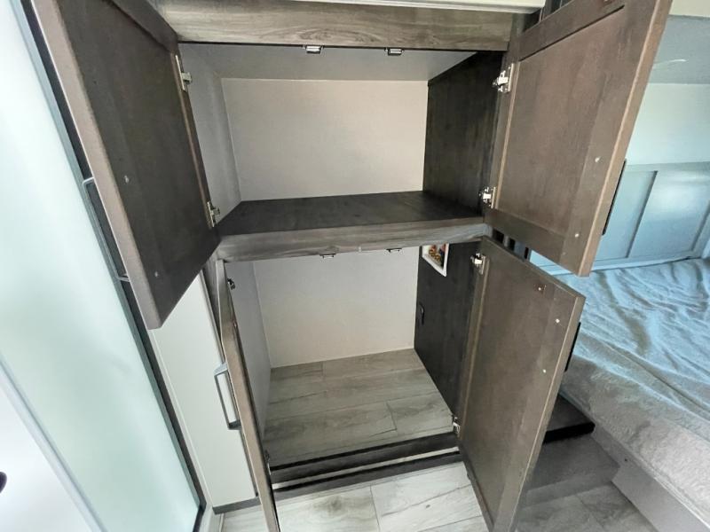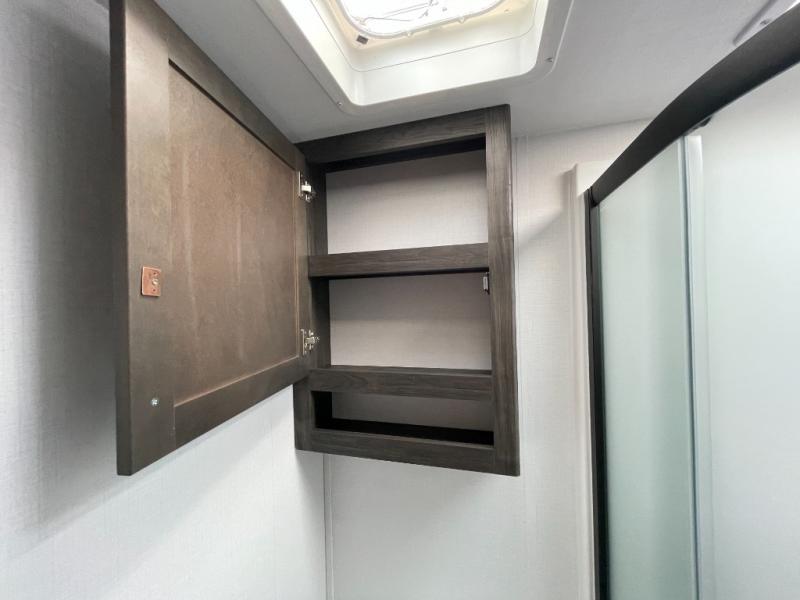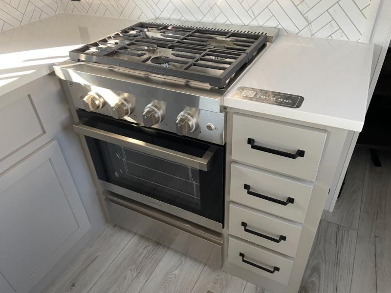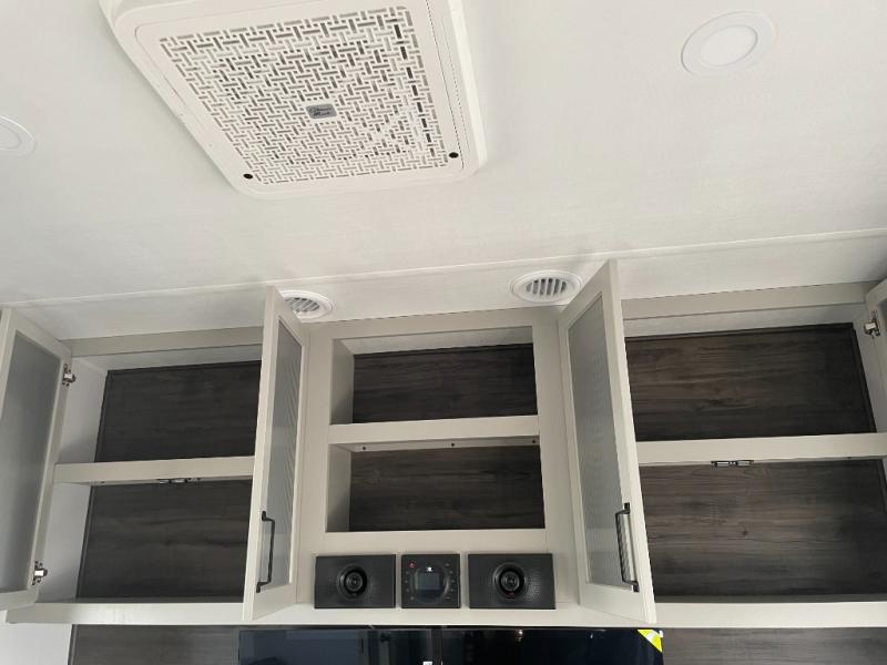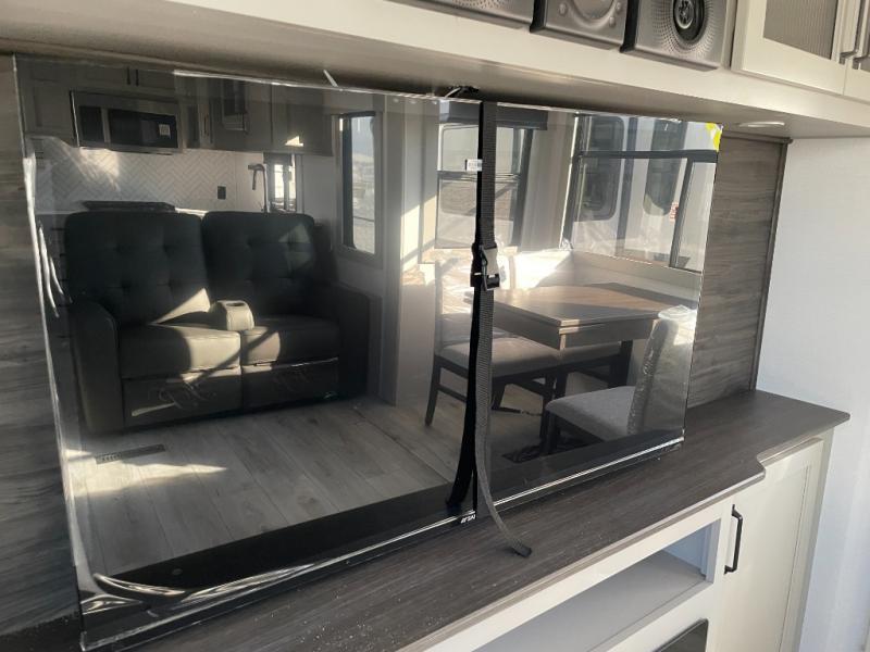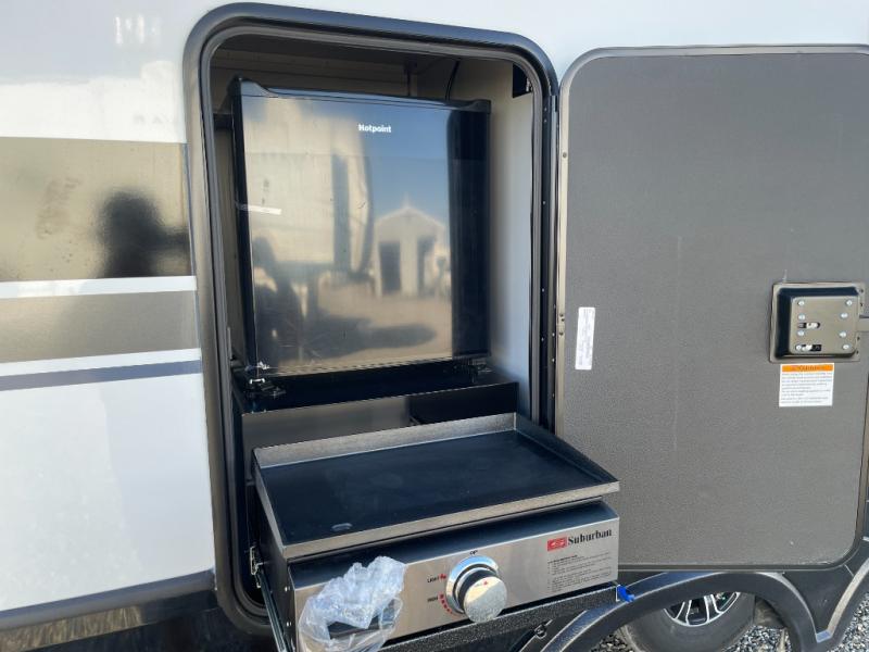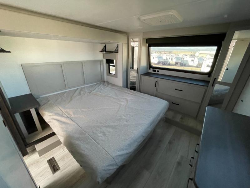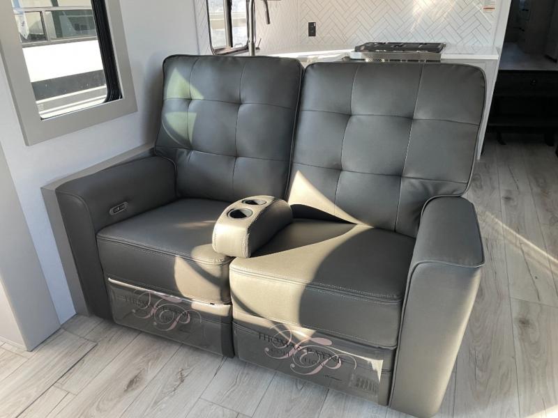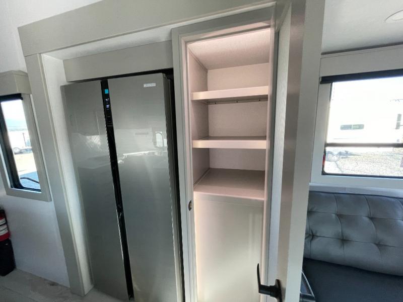 This couples coach will have you excited about traveling to all of your favorite places, and new locations too! The triple slide unit features an open concept living/dining area with dual opposing slides at the very back featuring a hide-a-bed sofa along the curbside, and a dining space opposite with a booth dinette or choose the optional table and four chairs. Power theater seats will be a comfortable place to kick back for a movie, and you will love the all-new entertainment center design featuring a fireplace, Smart TV, and overhead cabinets. In the evening, head up to your private retreat with a spacious bath including dual entry doors from the hall at the top of the stairs or from within the private bedroom. Get cleaned up in the large radius shower with seat and snuggle up in a king bed slide. The bedroom slide also features a large wardrobe that has been prepped for a washer/dryer if you choose to add the convenience. You will find plenty more storage spaces for your clothing and belongings in the two dressers or dual wardrobes along the full front wall. Another bonus with this unit is the outdoor kitchen which gives you a choice to cook inside or out!