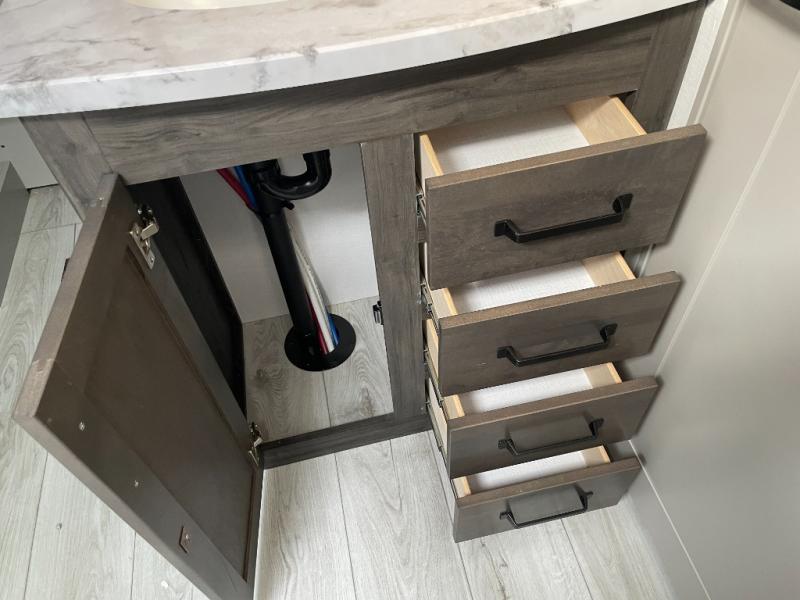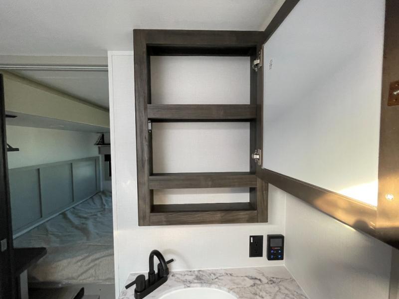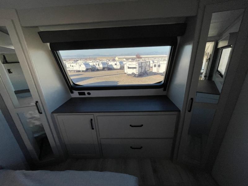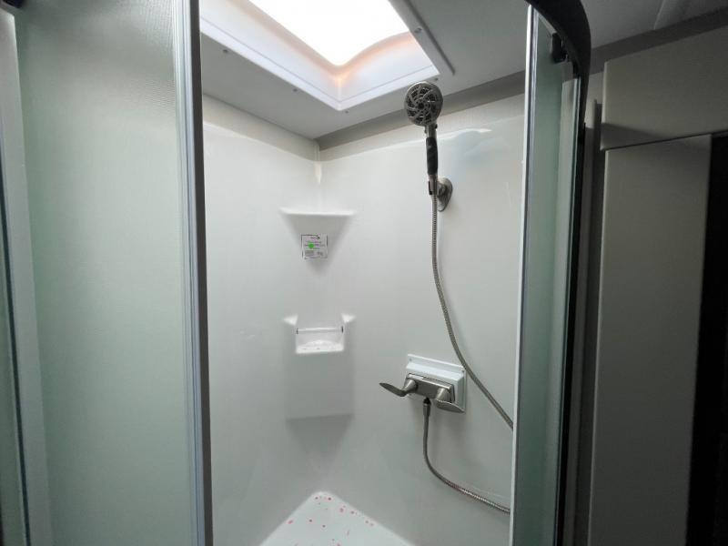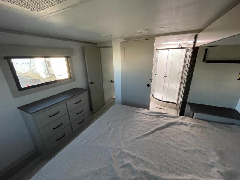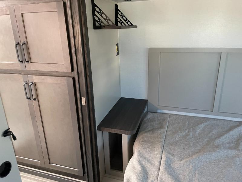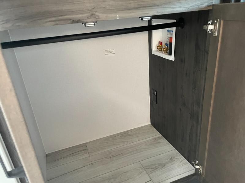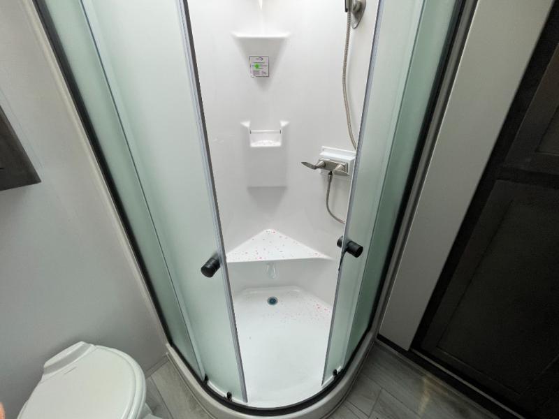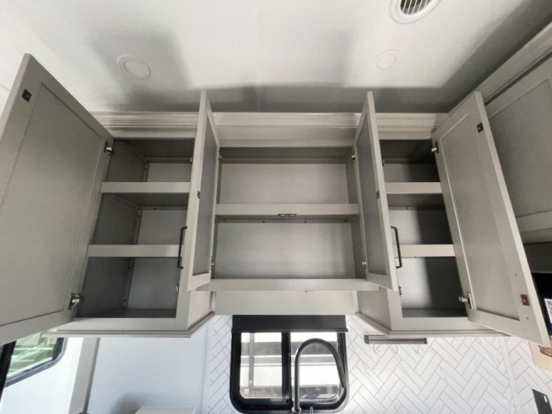 This couples coach will have you excited about traveling to all of your favorite places, and new locations too! The triple slide unit features an open concept living/dining area with dual opposing slides at the very back featuring a hide-a-bed sofa along the curbside, and a dining space opposite with a booth dinette or choose the optional table and four chairs. Power theater seats will be a comfortable place to kick back for a movie, and you will love the all-new entertainment center design featuring a fireplace, Smart TV, and overhead cabinets. In the evening, head up to your private retreat with a spacious bath including dual entry doors from the hall at the top of the stairs or from within the private bedroom. Get cleaned up in the large radius shower with seat and snuggle up in a king bed slide. The bedroom slide also features a large wardrobe that has been prepped for a washer/dryer if you choose to add the convenience. You will find plenty more storage spaces for your clothing and belongings in the two dressers or dual wardrobes along the full front wall. Another bonus with this unit is the outdoor kitchen which gives you a choice to cook inside or out!