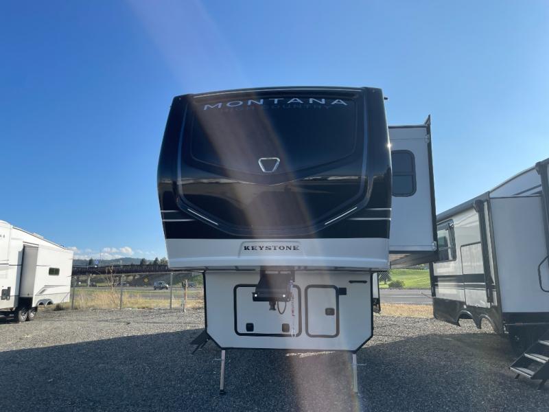 Live the high life with a Keystone Montana High Country fifth wheel! You'll have all the luxury you need with these units. They come with a MaxTurn™ front cap with KeyShield™ automotive-grade paint, a fully walkable roof with Alpha seamless TPO membrane system, and an insulated underbelly with forced hot air and electric tank heaters. The MORryde CRE3000 suspension with wet bolts helps provide a smooth tow, and the Ground Control® four-point electric auto-leveling with hitch memory will make set-up quite easy. The interior is elegantly appointed with the Thomas Payne Collection furniture, hardwood decorative slide-out fascia, Beauflor® vinyl throughout, accent crown molding, and premium solid surface kitchen countertops.