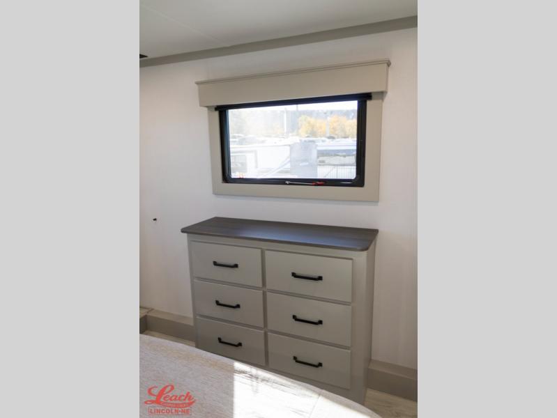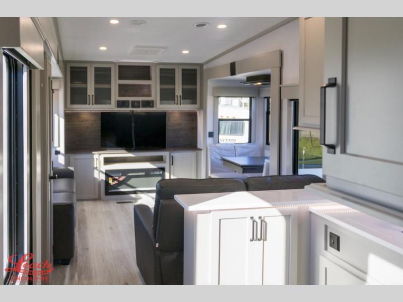 This couples coach will have you excited about traveling to all of your favorite places, and new locations too! The triple slide unit features an open concept living/dining area with dual opposing slides at the very back featuring a hide-a-bed sofa along the curbside, and a dining space opposite with a booth dinette or choose the optional table and four chairs. Power theater seats will be a comfortable place to kick back for a movie, and you will love the all-new entertainment center design featuring a fireplace, Smart TV, and overhead cabinets. In the evening, head up to your private retreat with a spacious bath including dual entry doors from the hall at the top of the stairs or from within the private bedroom. Get cleaned up in the large radius shower with seat and snuggle up in a king bed slide. The bedroom slide also features a large wardrobe that has been prepped for a washer/dryer if you choose to add the convenience. You will find plenty more storage spaces for your clothing and belongings in the two dressers or dual wardrobes along the full front wall. Another bonus with this unit is the outdoor kitchen which gives you a choice to cook inside or out!