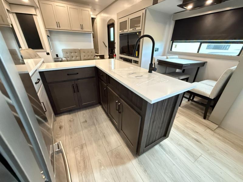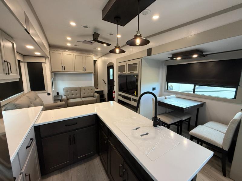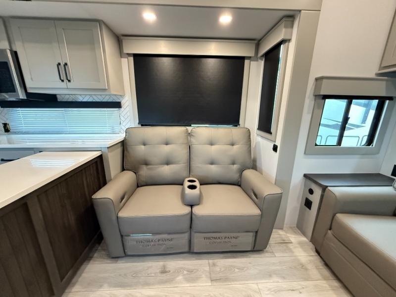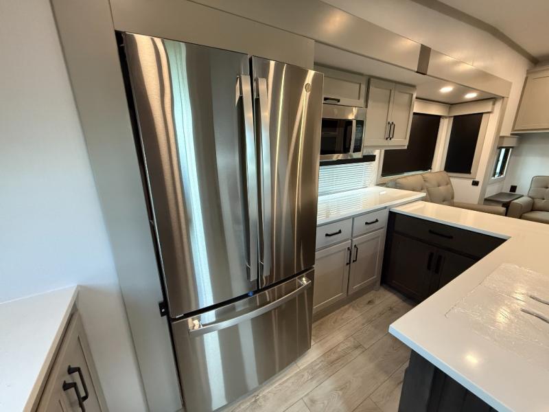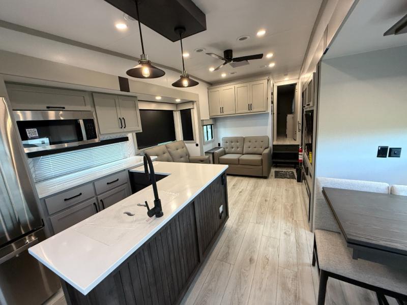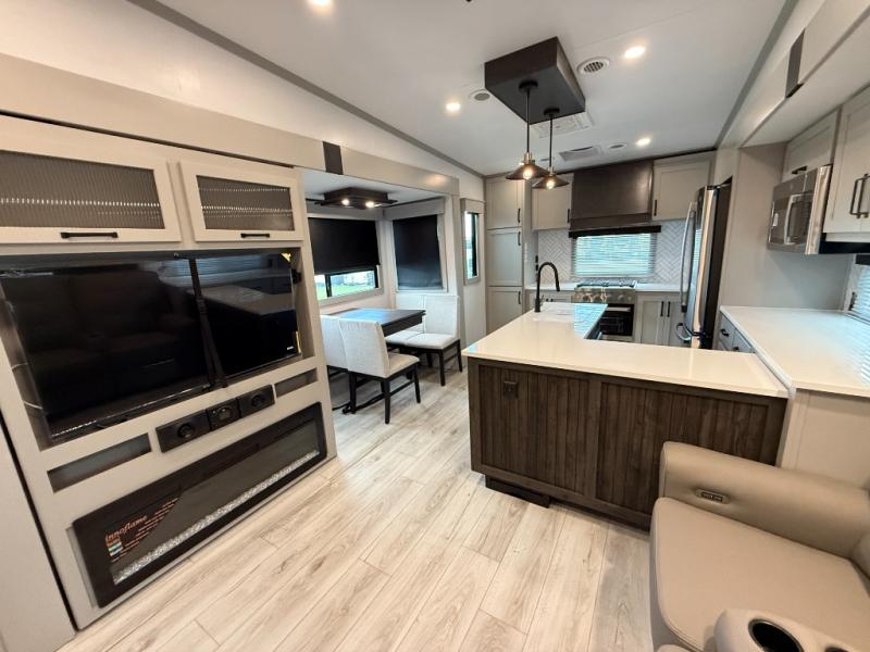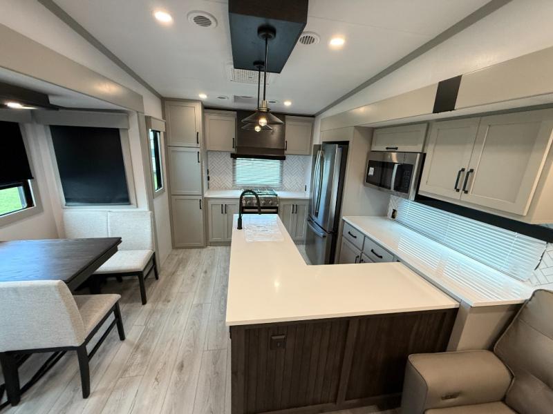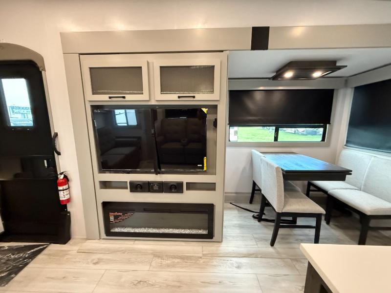 This rear kitchen fifth wheel features ample counter space, an L-shaped counter, plus a spacious pantry and residential refrigerator for food storage. Your crew can relax on the hide-a-bed sofa and power theater seating, or dine at the booth dinette. There is also an entertainment center and fireplace with a hidden pantry behind it for board games and movies. A full bath includes a shower with a seat for added comfort, and the front private bedroom with a king bed slide is sure to bring a great night's rest. You'll find a spacious wardrobe and a dresser to keep your clothes organized, plus washer and dryer prep if you want to add these appliances.