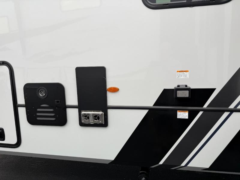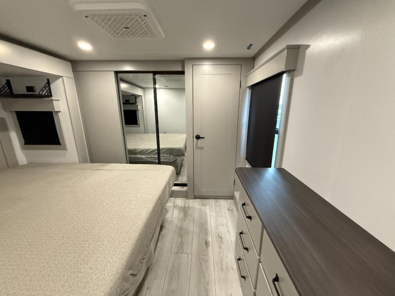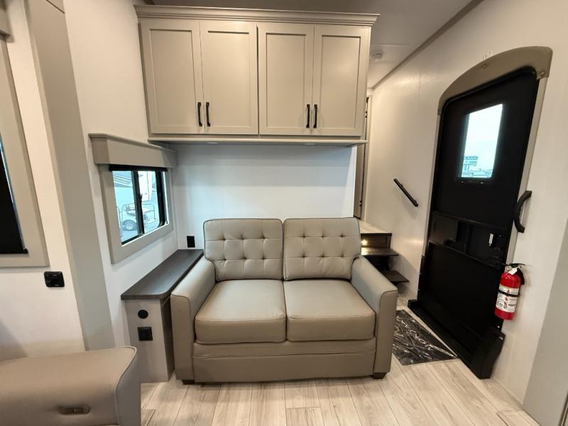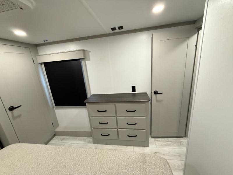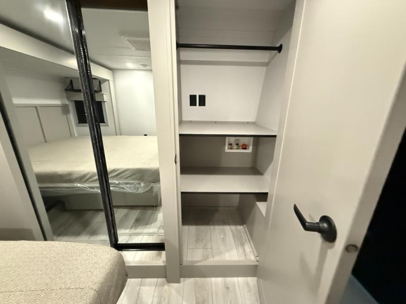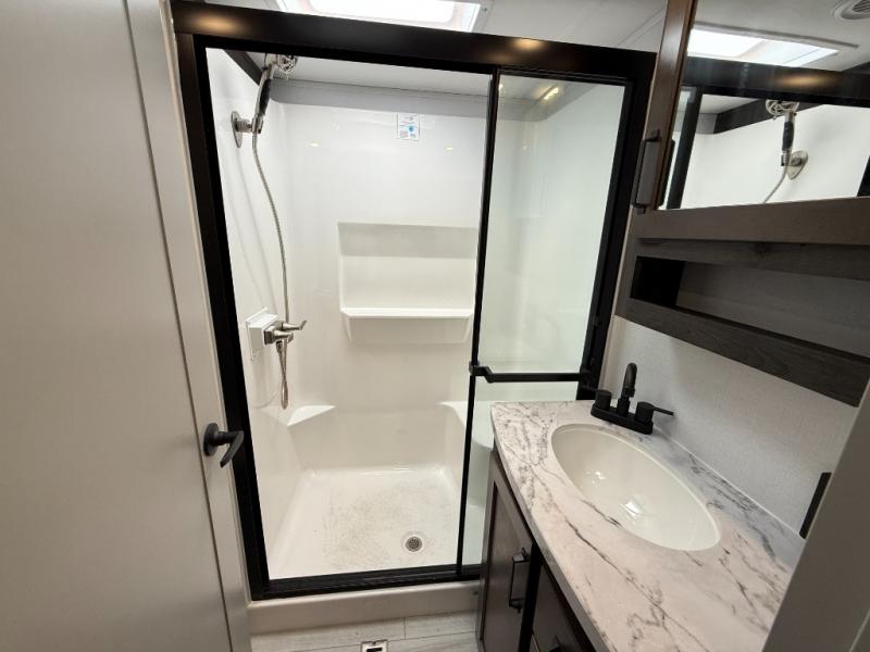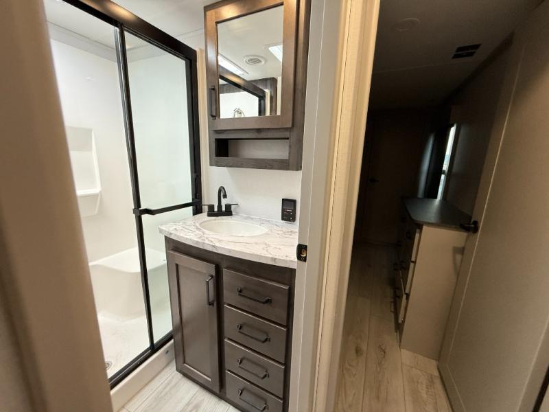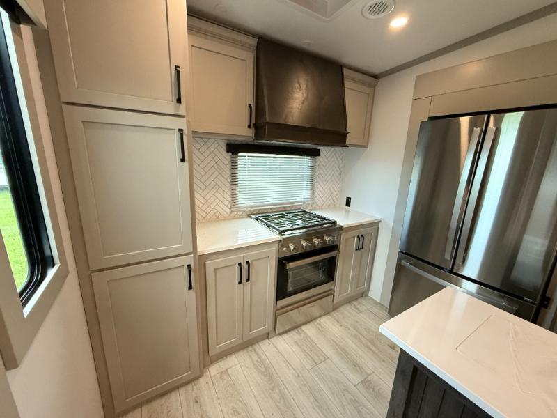 This rear kitchen fifth wheel features ample counter space, an L-shaped counter, plus a spacious pantry and residential refrigerator for food storage. Your crew can relax on the hide-a-bed sofa and power theater seating, or dine at the booth dinette. There is also an entertainment center and fireplace with a hidden pantry behind it for board games and movies. A full bath includes a shower with a seat for added comfort, and the front private bedroom with a king bed slide is sure to bring a great night's rest. You'll find a spacious wardrobe and a dresser to keep your clothes organized, plus washer and dryer prep if you want to add these appliances.