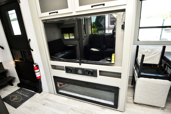 This rear kitchen fifth wheel features ample counter space, an L-shaped counter, plus a spacious pantry and residential refrigerator for food storage. Your crew can relax on the hide-a-bed sofa and power theater seating, or dine at the booth dinette. There is also an entertainment center and fireplace with a hidden pantry behind it for board games and movies. A full bath includes a shower with a seat for added comfort, and the front private bedroom with a king bed slide is sure to bring a great night's rest. You'll find a spacious wardrobe and a dresser to keep your clothes organized, plus washer and dryer prep if you want to add these appliances.