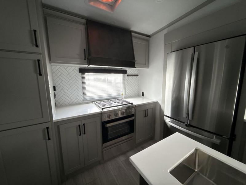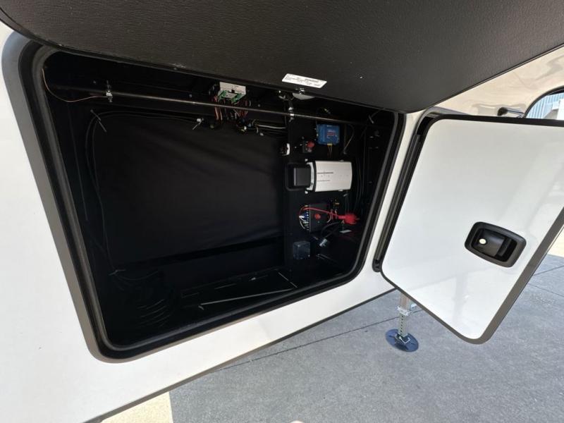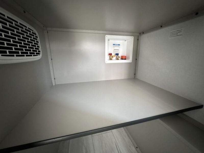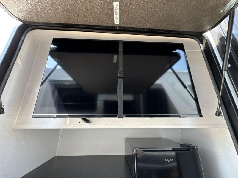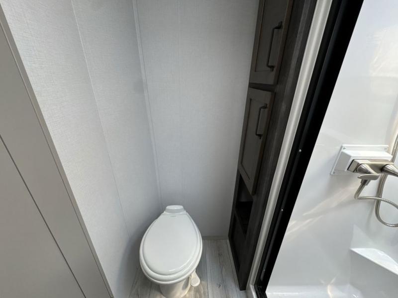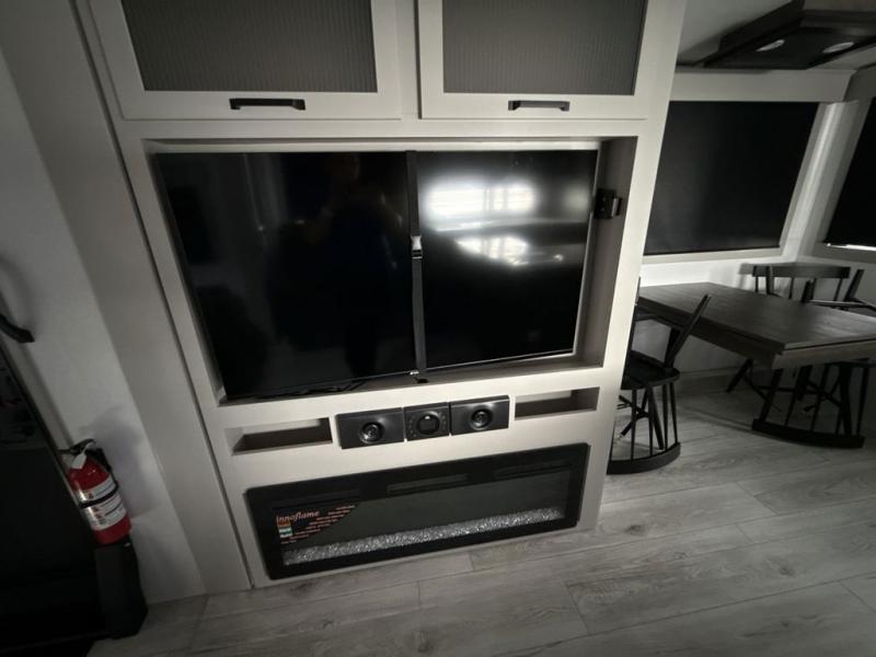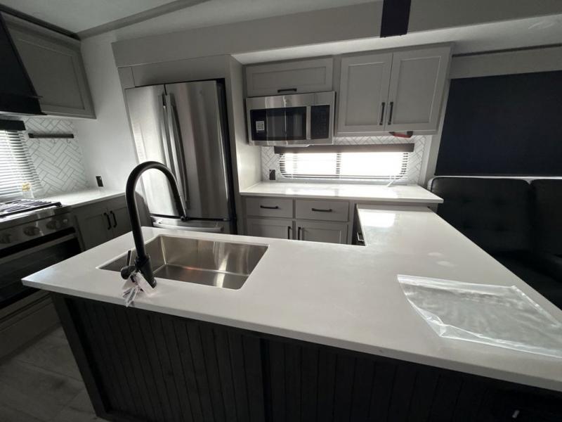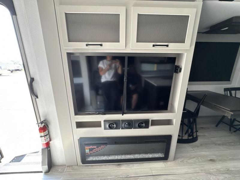 This rear kitchen fifth wheel features ample counter space, an L-shaped counter, plus a spacious pantry and residential refrigerator for food storage. Your crew can relax on the hide-a-bed sofa and power theater seating, or dine at the booth dinette. There is also an entertainment center and fireplace with a hidden pantry behind it for board games and movies. A full bath includes a shower with a seat for added comfort, and the front private bedroom with a king bed slide is sure to bring a great night's rest. You'll find a spacious wardrobe and a dresser to keep your clothes organized, plus washer and dryer prep if you want to add these appliances.