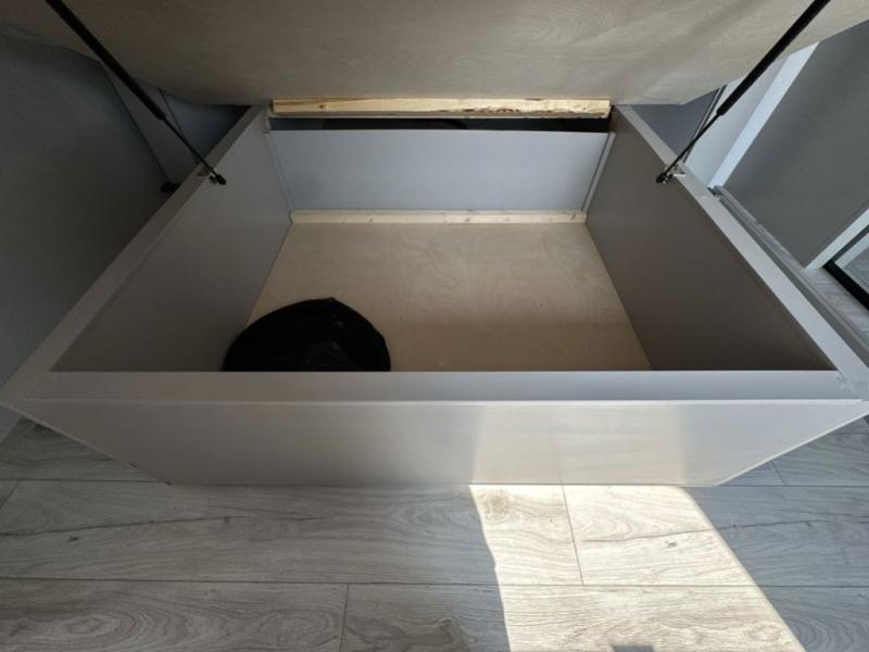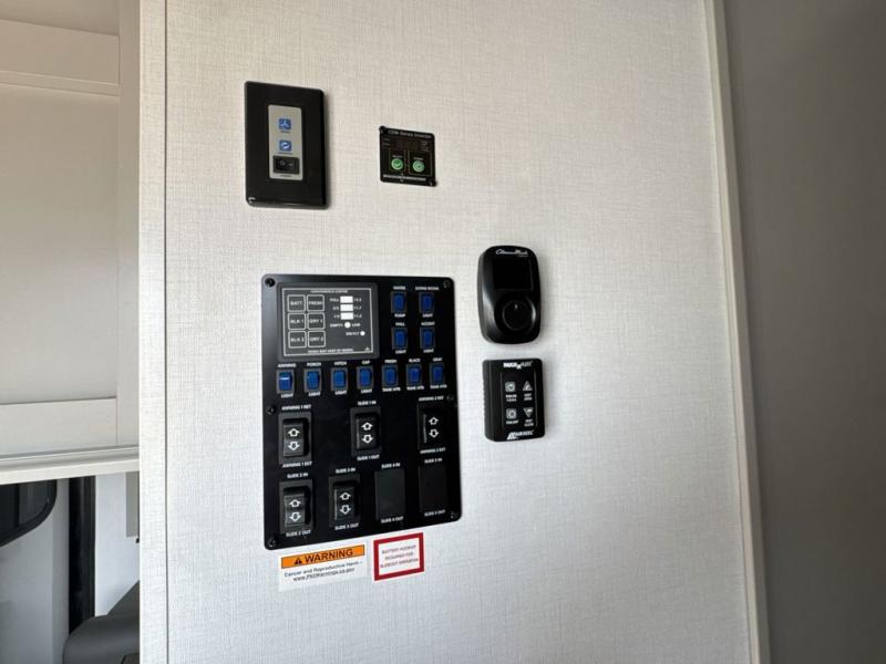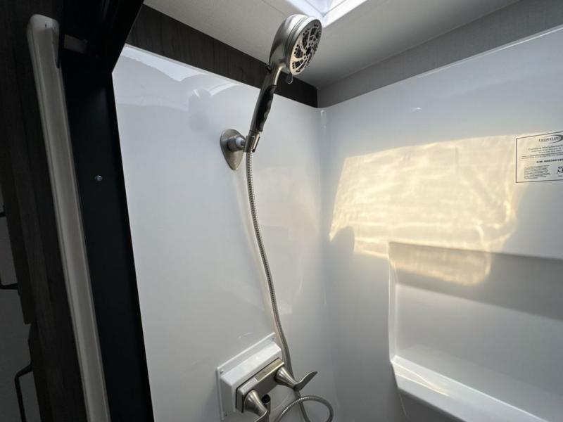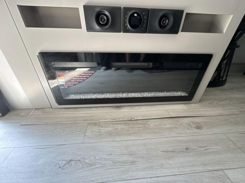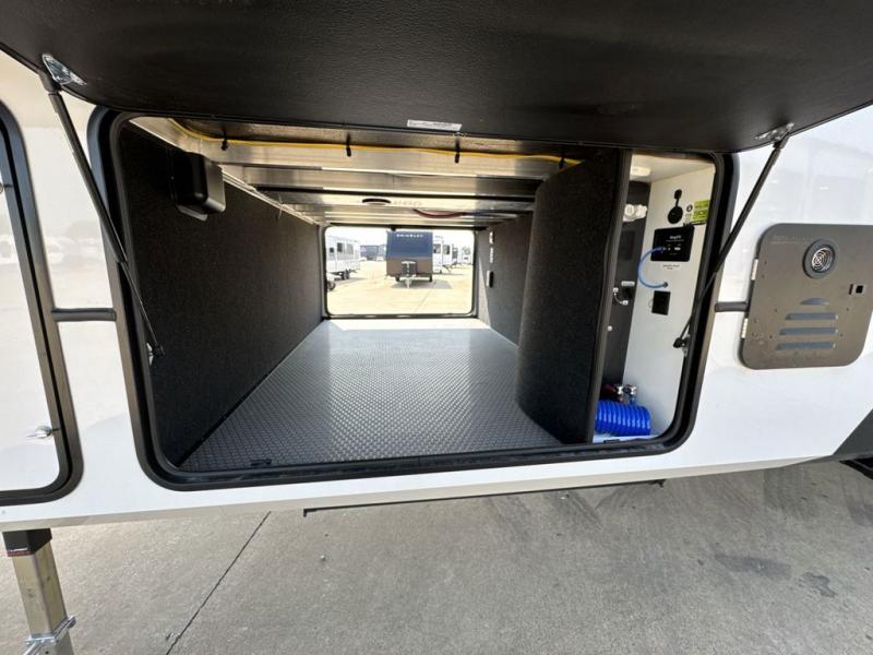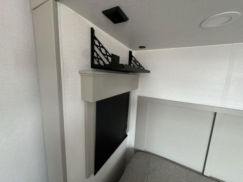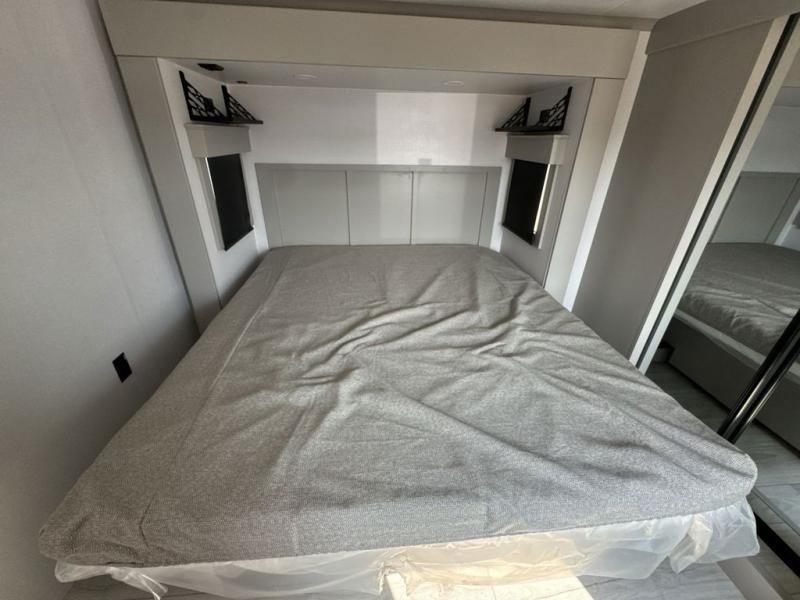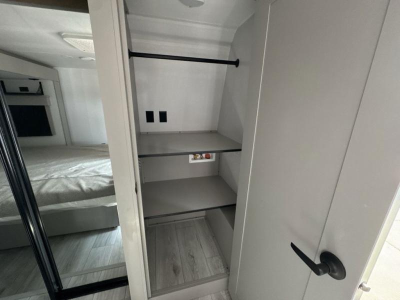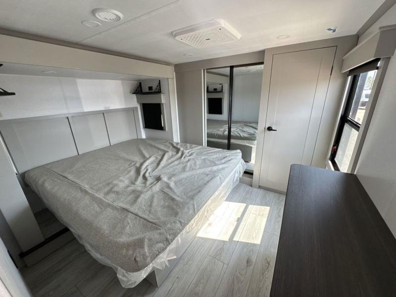 This rear kitchen fifth wheel features ample counter space, an L-shaped counter, plus a spacious pantry and residential refrigerator for food storage. Your crew can relax on the hide-a-bed sofa and power theater seating, or dine at the booth dinette. There is also an entertainment center and fireplace with a hidden pantry behind it for board games and movies. A full bath includes a shower with a seat for added comfort, and the front private bedroom with a king bed slide is sure to bring a great night's rest. You'll find a spacious wardrobe and a dresser to keep your clothes organized, plus washer and dryer prep if you want to add these appliances.