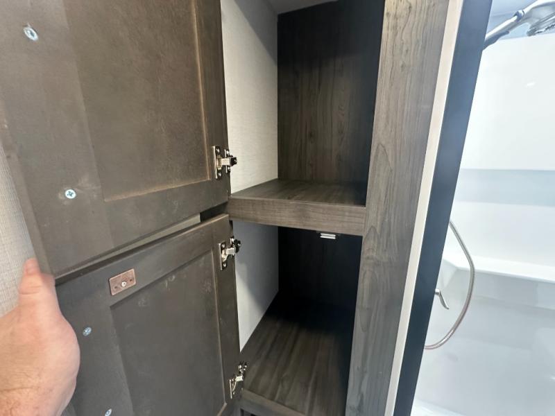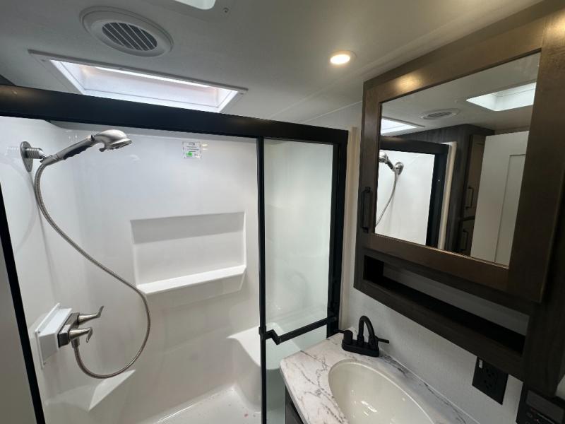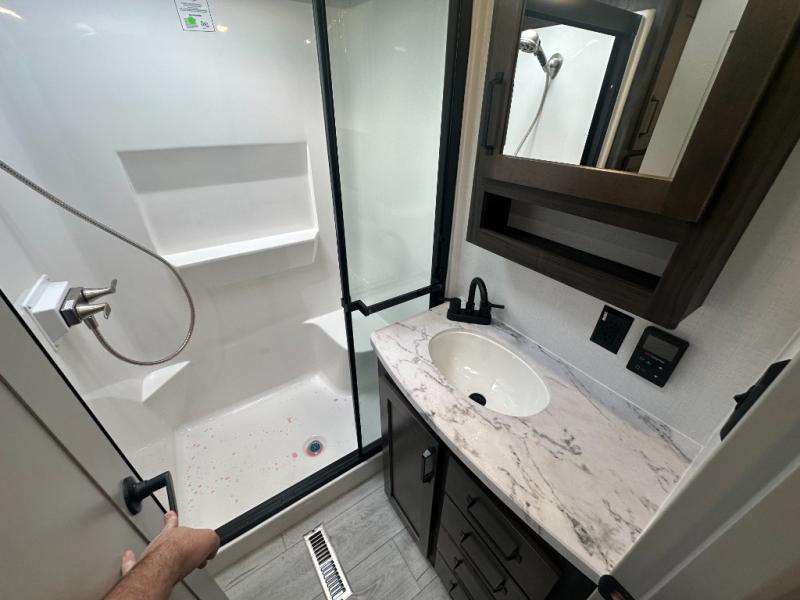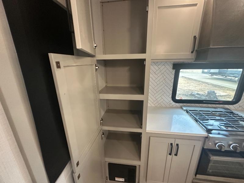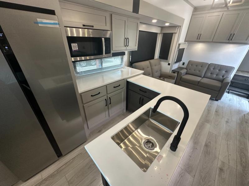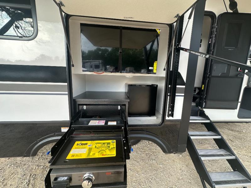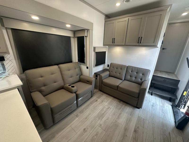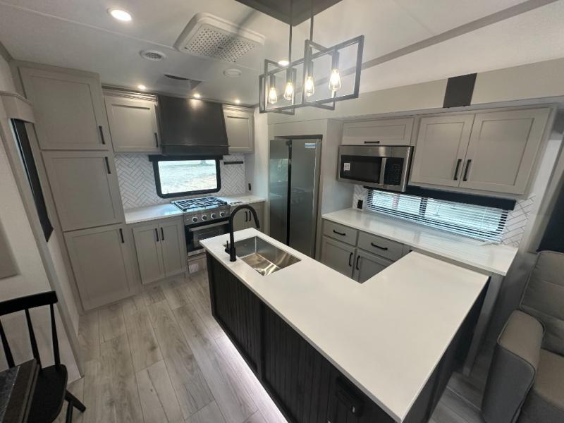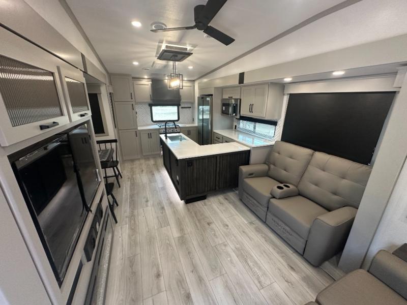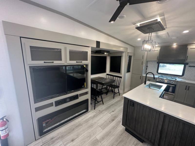 This rear kitchen fifth wheel features ample counter space, an L-shaped counter, plus a spacious pantry and residential refrigerator for food storage. Your crew can relax on the hide-a-bed sofa and power theater seating, or dine at the booth dinette. There is also an entertainment center and fireplace with a hidden pantry behind it for board games and movies. A full bath includes a shower with a seat for added comfort, and the front private bedroom with a king bed slide is sure to bring a great night's rest. You'll find a spacious wardrobe and a dresser to keep your clothes organized, plus washer and dryer prep if you want to add these appliances.