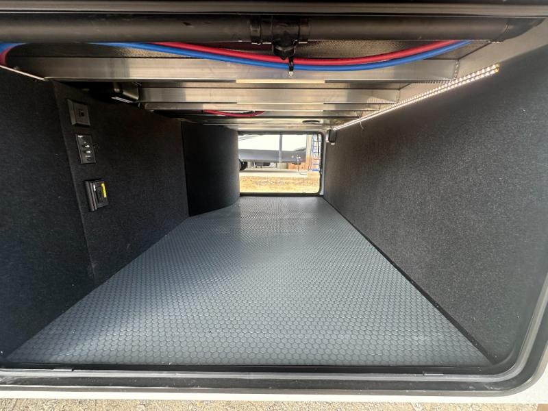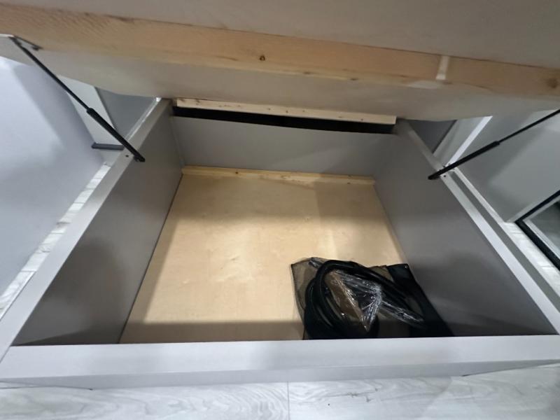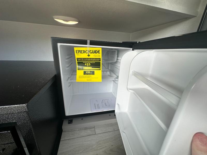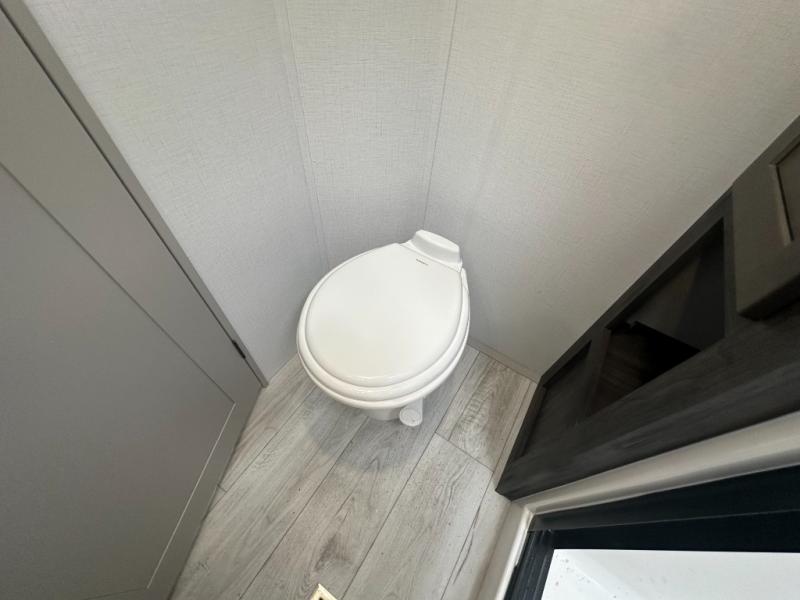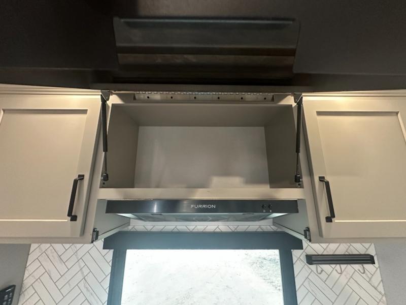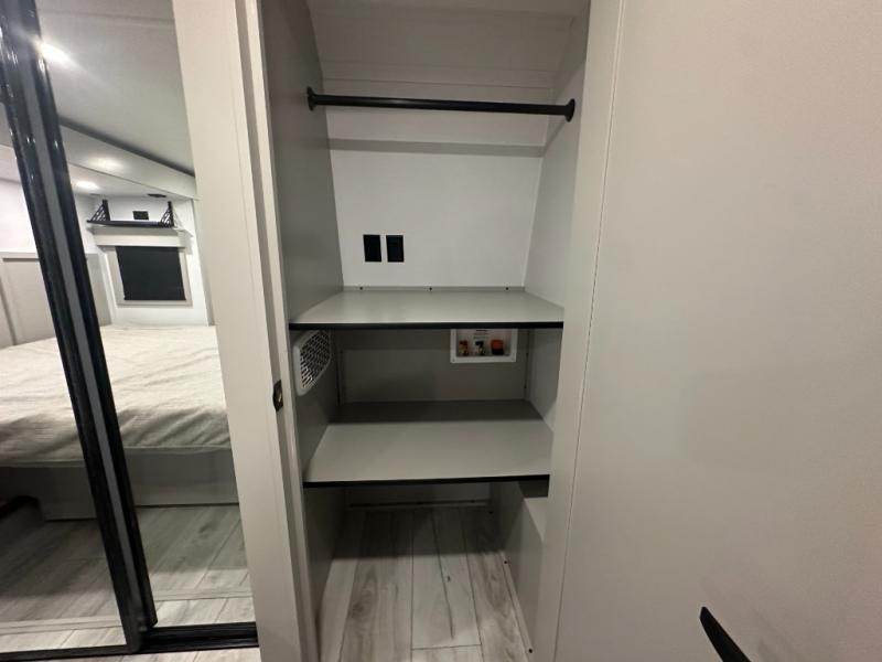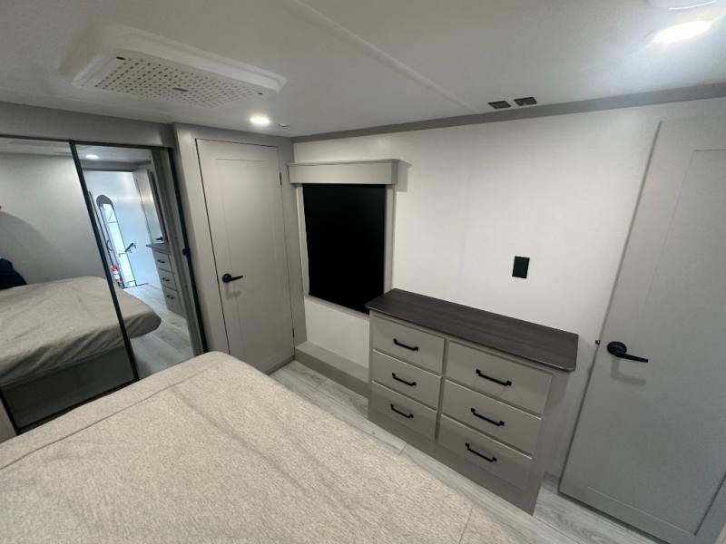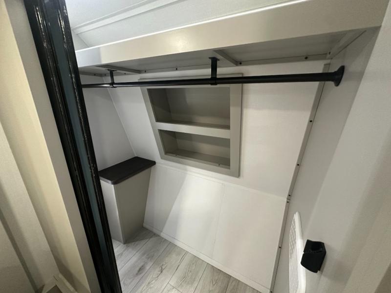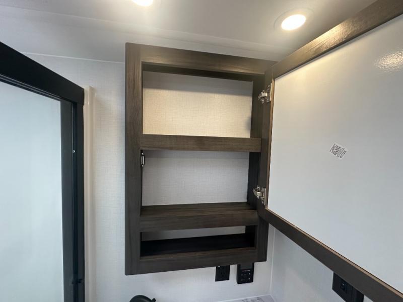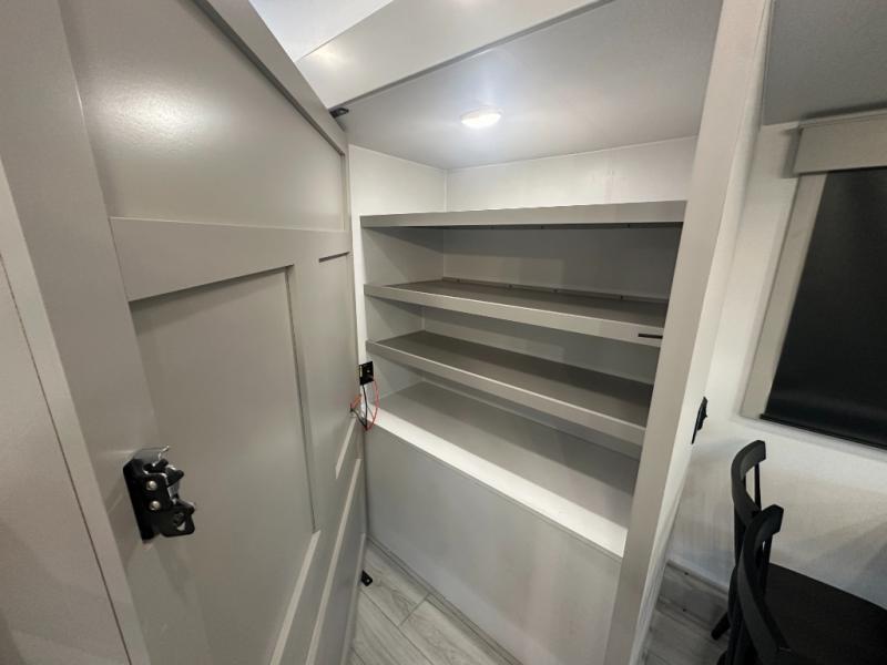 This rear kitchen fifth wheel features ample counter space, an L-shaped counter, plus a spacious pantry and residential refrigerator for food storage. Your crew can relax on the hide-a-bed sofa and power theater seating, or dine at the booth dinette. There is also an entertainment center and fireplace with a hidden pantry behind it for board games and movies. A full bath includes a shower with a seat for added comfort, and the front private bedroom with a king bed slide is sure to bring a great night's rest. You'll find a spacious wardrobe and a dresser to keep your clothes organized, plus washer and dryer prep if you want to add these appliances.