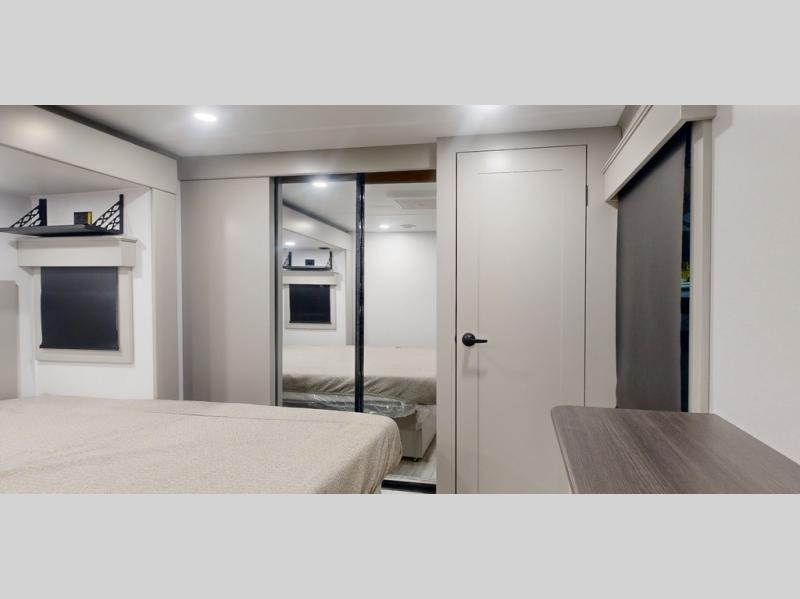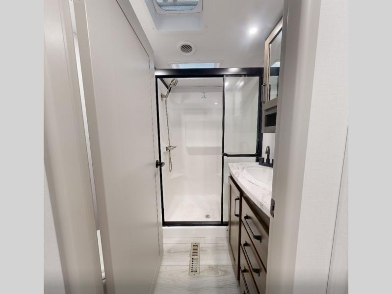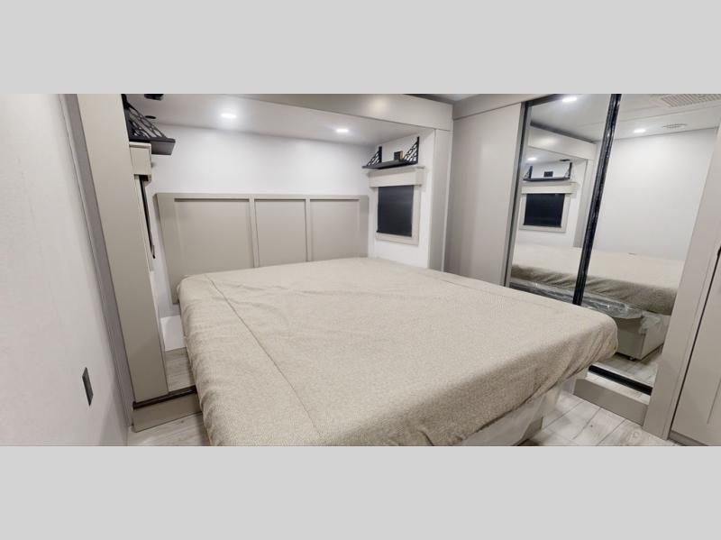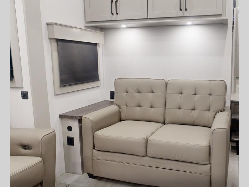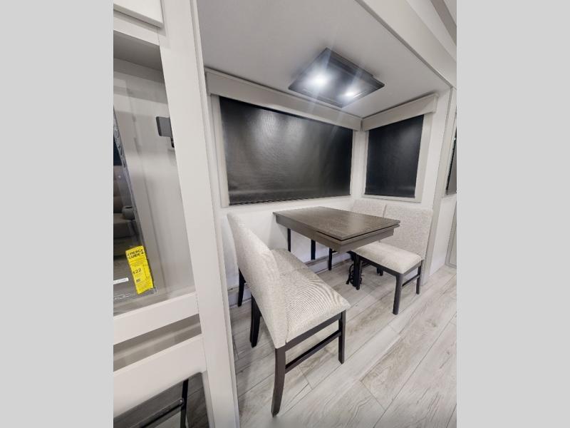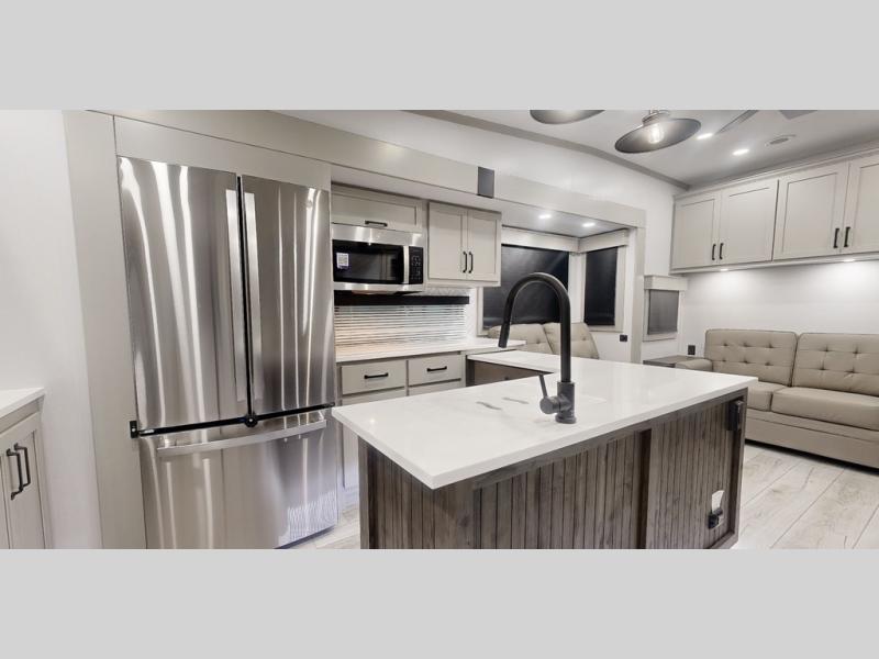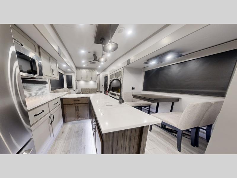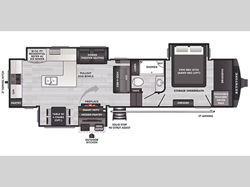 This rear kitchen fifth wheel features ample counter space, an L-shaped counter, plus a spacious pantry and residential refrigerator for food storage. Your crew can relax on the hide-a-bed sofa and power theater seating, or dine at the booth dinette. There is also an entertainment center and fireplace with a hidden pantry behind it for board games and movies. A full bath includes a shower with a seat for added comfort, and the front private bedroom with a king bed slide is sure to bring a great night's rest. You'll find a spacious wardrobe and a dresser to keep your clothes organized, plus washer and dryer prep if you want to add these appliances.