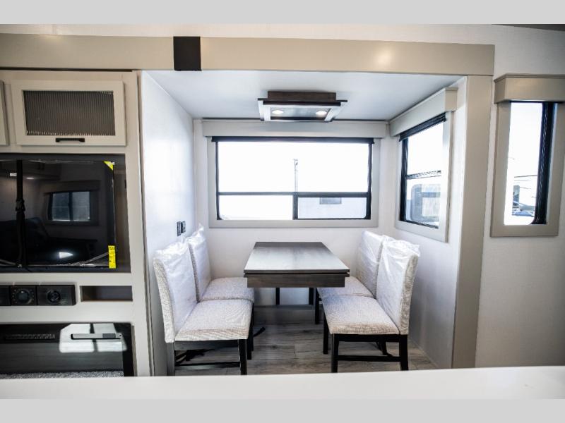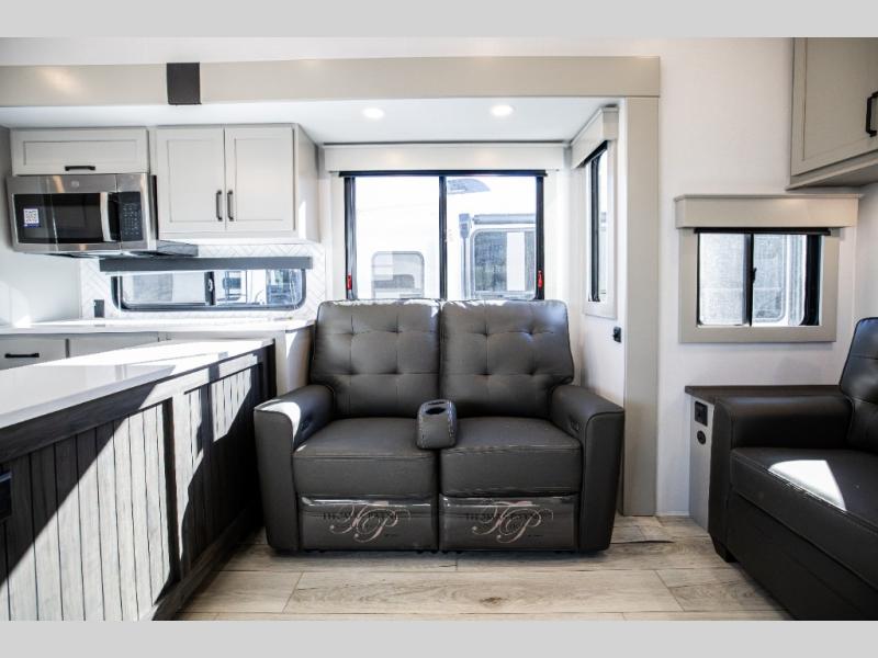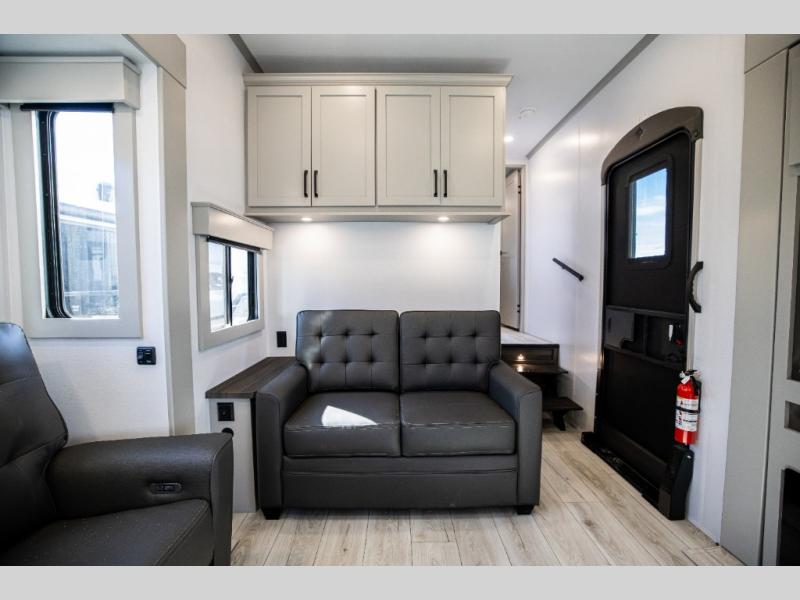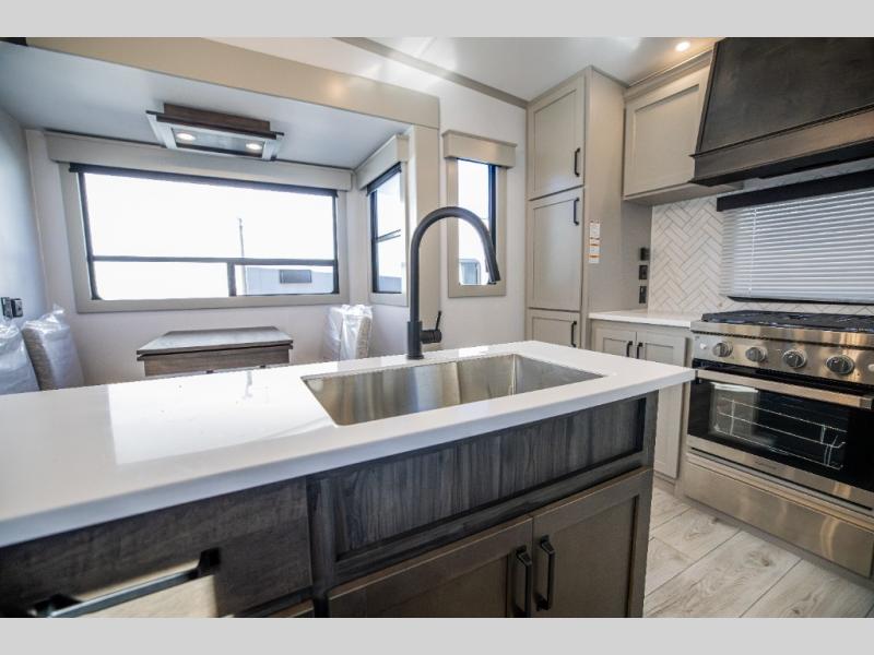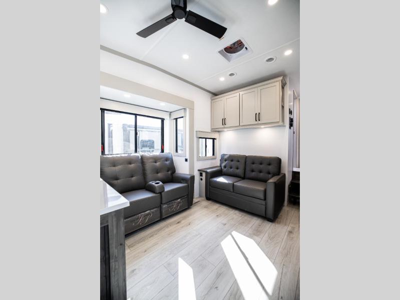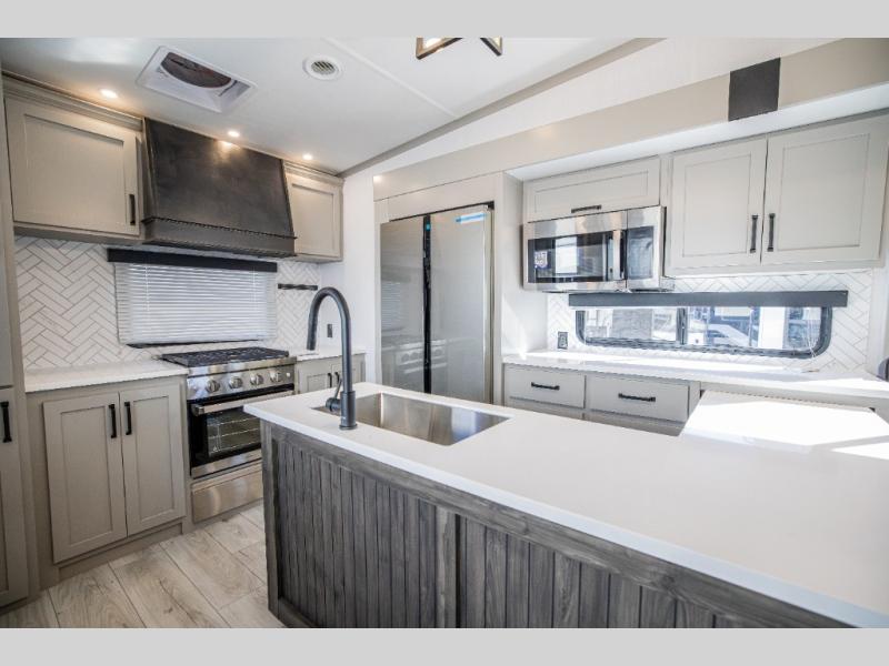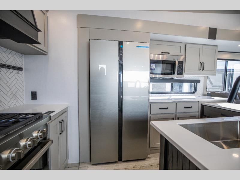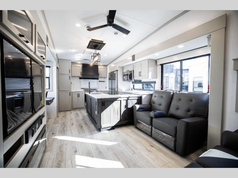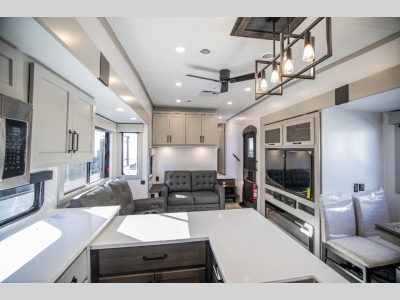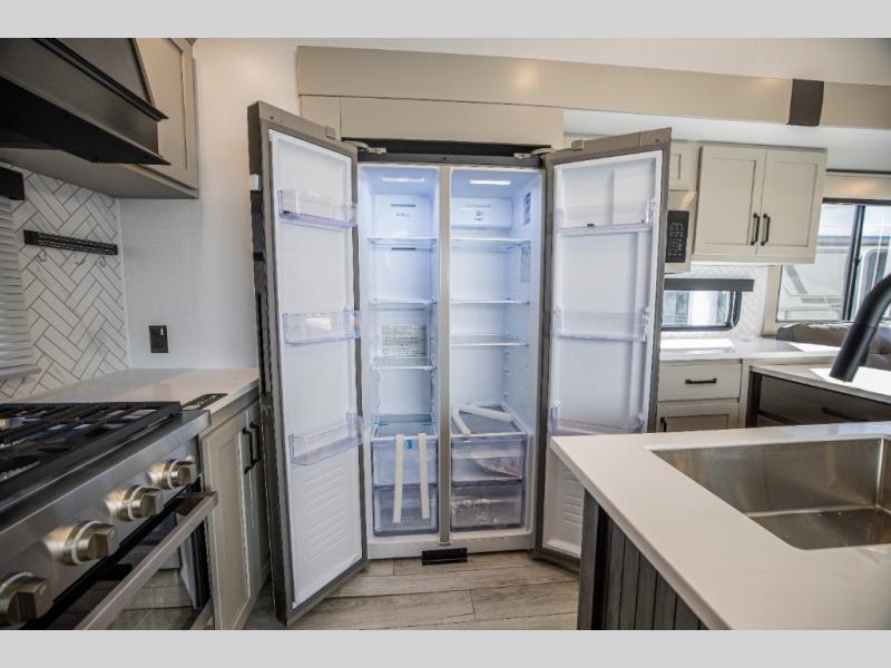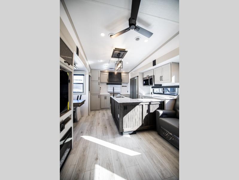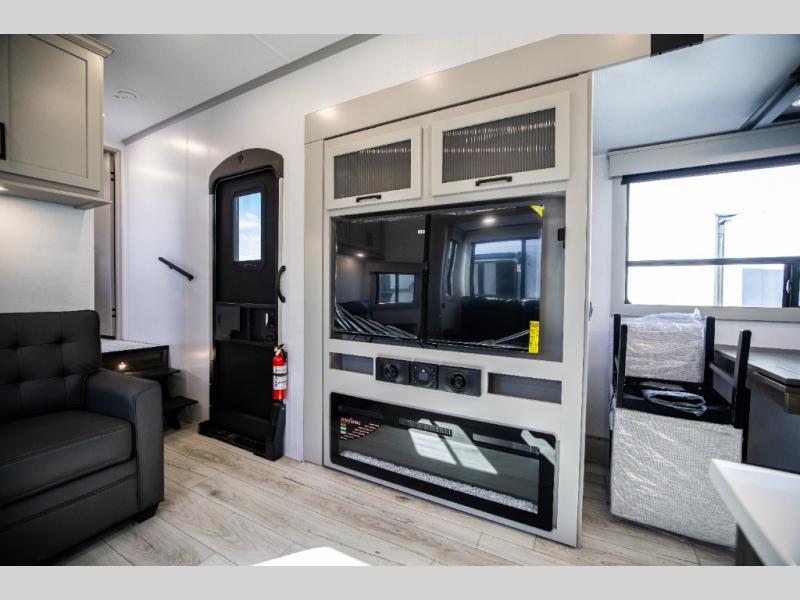This rear kitchen fifth wheel features ample counter space, an L-shaped counter, plus a spacious pantry and residential refrigerator for food storage. Your crew can relax on the hide-a-bed sofa and power theater seating, or dine at the booth dinette. There is also an entertainment center and fireplace with a hidden pantry behind it for board games and movies. A full bath includes a shower with a seat for added comfort, and the front private bedroom with a king bed slide is sure to bring a great night's rest. You'll find a spacious wardrobe and a dresser to keep your clothes organized, plus washer and dryer prep if you want to add these appliances.