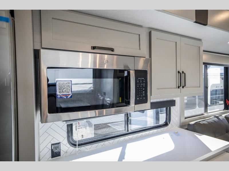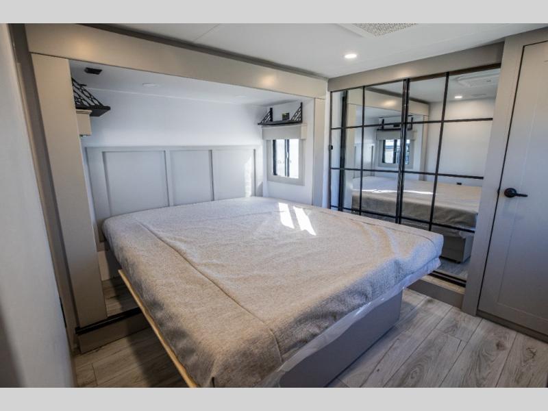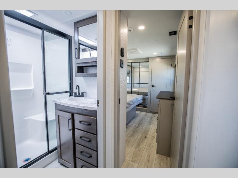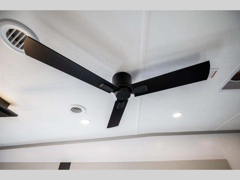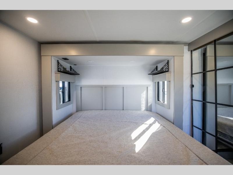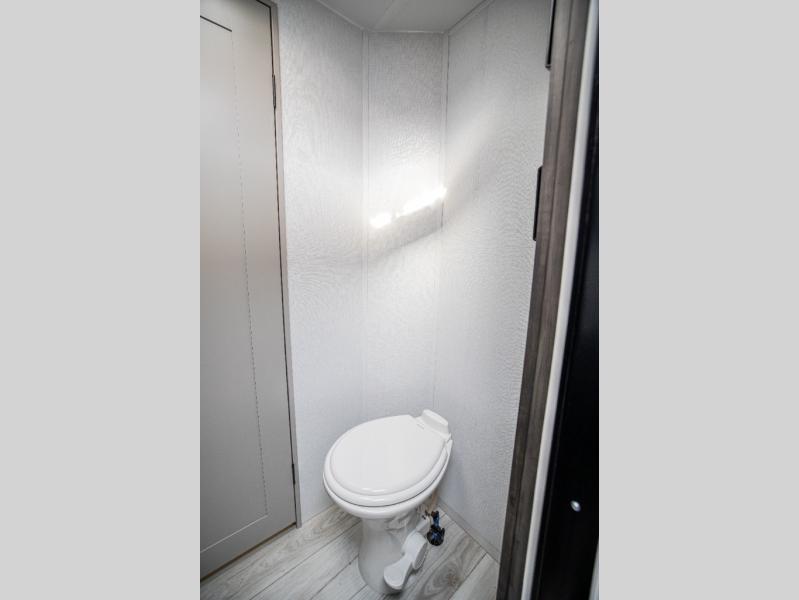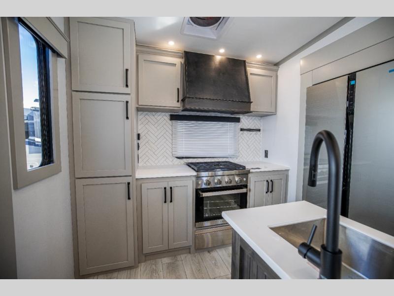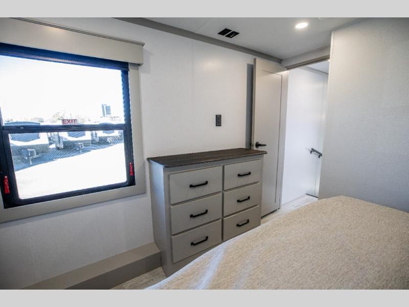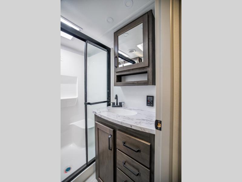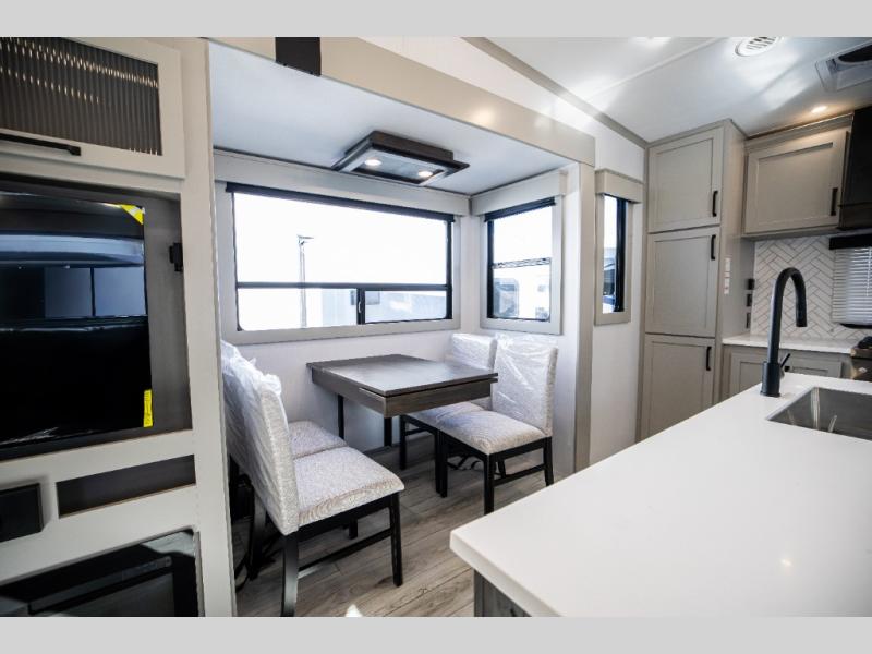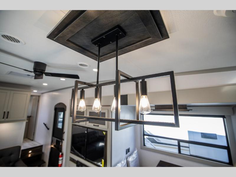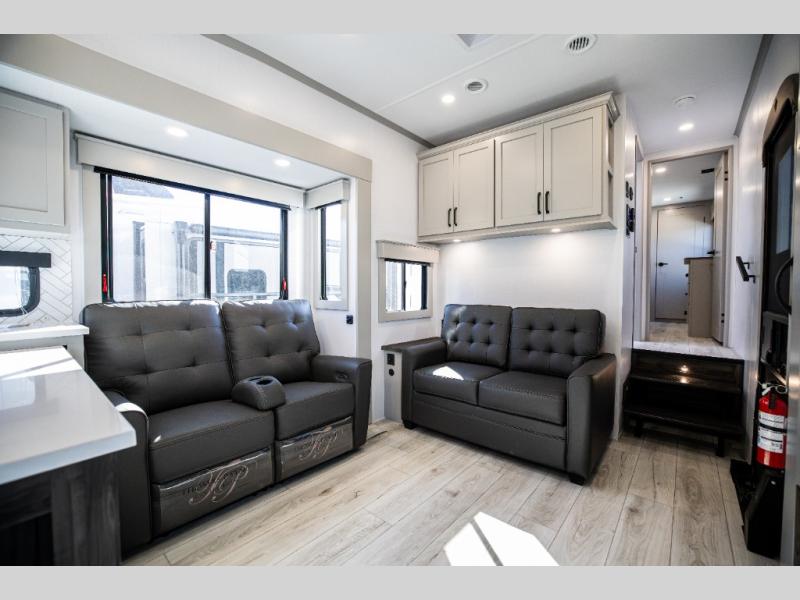 This rear kitchen fifth wheel features ample counter space, an L-shaped counter, plus a spacious pantry and residential refrigerator for food storage. Your crew can relax on the hide-a-bed sofa and power theater seating, or dine at the booth dinette. There is also an entertainment center and fireplace with a hidden pantry behind it for board games and movies. A full bath includes a shower with a seat for added comfort, and the front private bedroom with a king bed slide is sure to bring a great night's rest. You'll find a spacious wardrobe and a dresser to keep your clothes organized, plus washer and dryer prep if you want to add these appliances.