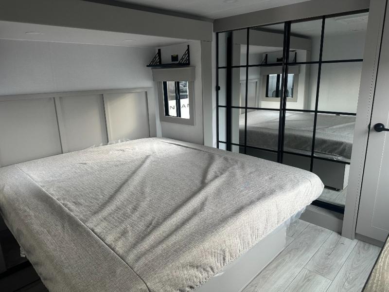 This rear kitchen fifth wheel features ample counter space, an L-shaped counter, plus a spacious pantry and residential refrigerator for food storage. Your crew can relax on the hide-a-bed sofa and power theater seating, or dine at the booth dinette. There is also an entertainment center and fireplace with a hidden pantry behind it for board games and movies. A full bath includes a shower with a seat for added comfort, and the front private bedroom with a king bed slide is sure to bring a great night's rest. You'll find a spacious wardrobe and a dresser to keep your clothes organized, plus washer and dryer prep if you want to add these appliances.