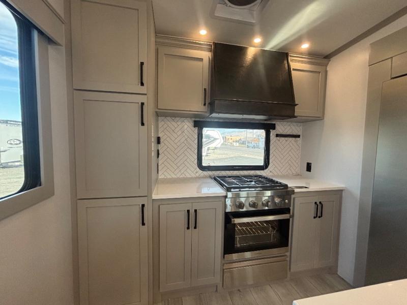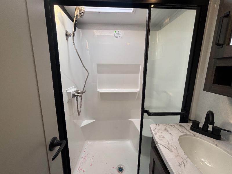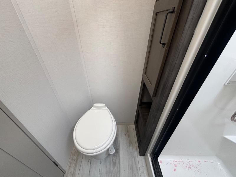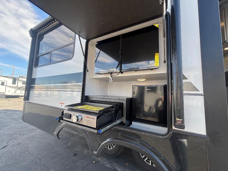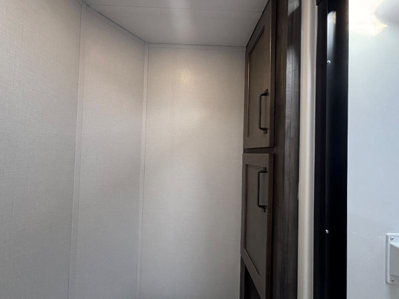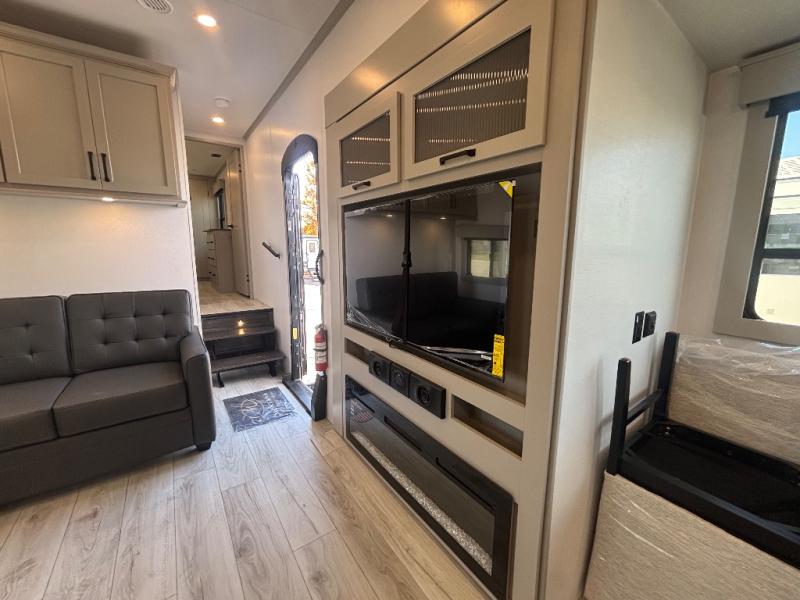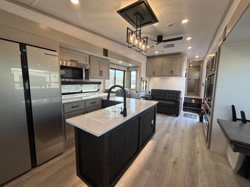 This rear kitchen fifth wheel features ample counter space, an L-shaped counter, plus a spacious pantry and residential refrigerator for food storage. Your crew can relax on the hide-a-bed sofa and power theater seating, or dine at the booth dinette. There is also an entertainment center and fireplace with a hidden pantry behind it for board games and movies. A full bath includes a shower with a seat for added comfort, and the front private bedroom with a king bed slide is sure to bring a great night's rest. You'll find a spacious wardrobe and a dresser to keep your clothes organized, plus washer and dryer prep if you want to add these appliances.