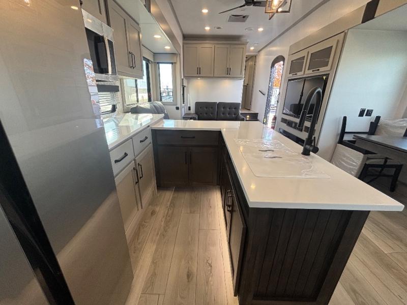 Live the high life with a Keystone Montana High Country fifth wheel! You'll have all the luxury you need with these units. They come with a MaxTurn™ front cap with KeyShield™ automotive-grade paint, a fully walkable roof with Alpha seamless TPO membrane system, and an insulated underbelly with forced hot air and electric tank heaters. The MORryde CRE3000 suspension with wet bolts helps provide a smooth tow, and the Ground Control® four-point electric auto-leveling with hitch memory will make set-up quite easy. The interior is elegantly appointed with the Thomas Payne Collection furniture, hardwood decorative slide-out fascia, Beauflor® vinyl throughout, accent crown molding, and premium solid surface kitchen countertops.