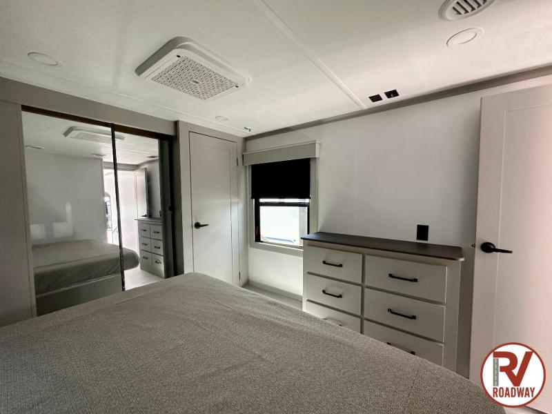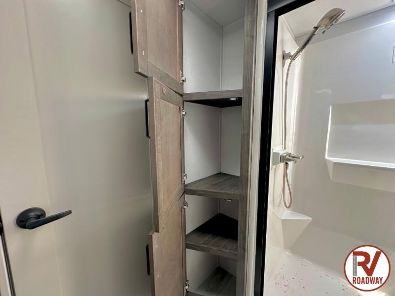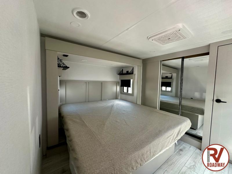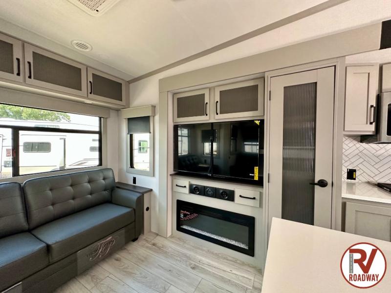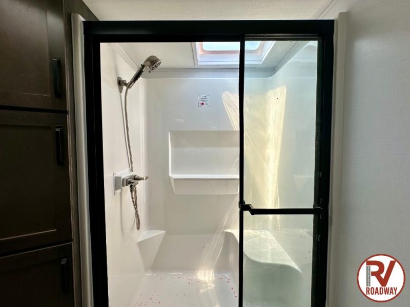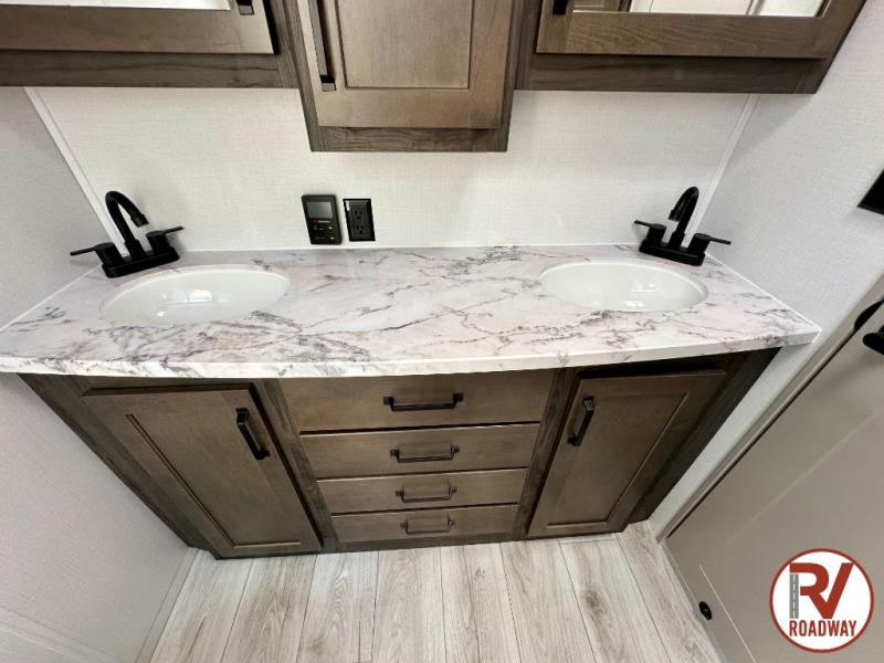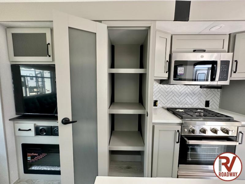 You can live life to its fullest in this Montana High Country fifth wheel! There are opposing slides in the main living area for more space, and the fireplace adds coziness to this space. Spend time relaxing on the power theater seating, and use the hide-a-bed sofa as an extra bed when you have friends turn into overnight guests. The pantry will help you keep your snacks stored away, and full bathroom has a dual-sink vanity and 48" x 30" shower with seat for a convenient way to get clean. The front bedroom has a king bed slide with storage underneath the bed, and the wardrobe and dresser provide more storage space.
