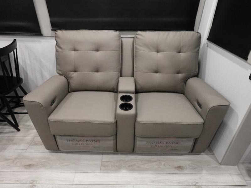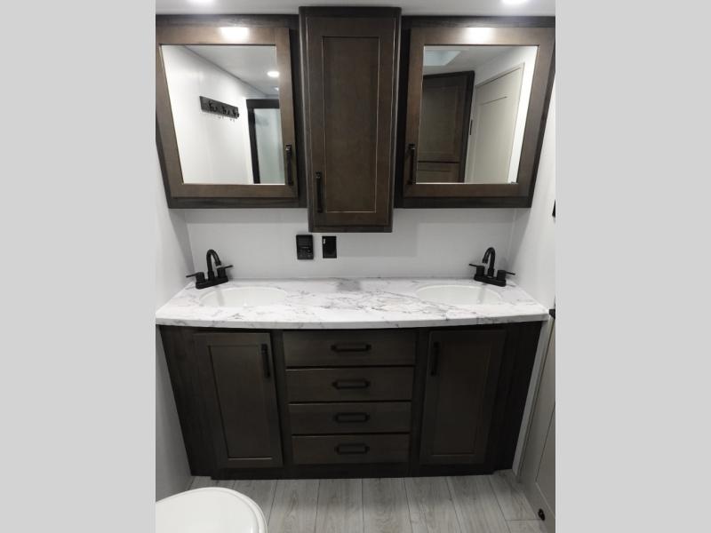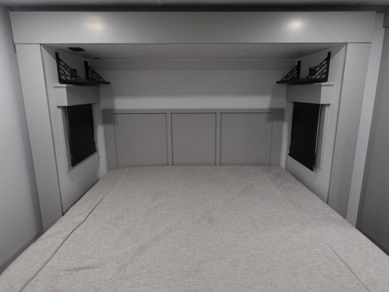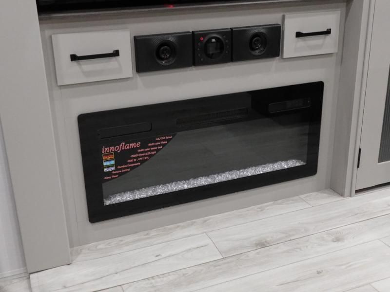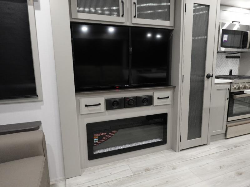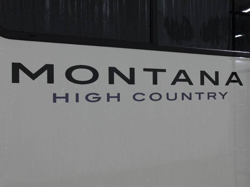 You can live life to its fullest in this Montana High Country fifth wheel! There are opposing slides in the main living area for more space, and the fireplace adds coziness to this space. Spend time relaxing on the power theater seating, and use the hide-a-bed sofa as an extra bed when you have friends turn into overnight guests. The pantry will help you keep your snacks stored away, and full bathroom has a dual-sink vanity and 48" x 30" shower with seat for a convenient way to get clean. The front bedroom has a king bed slide with storage underneath the bed, and the wardrobe and dresser provide more storage space.