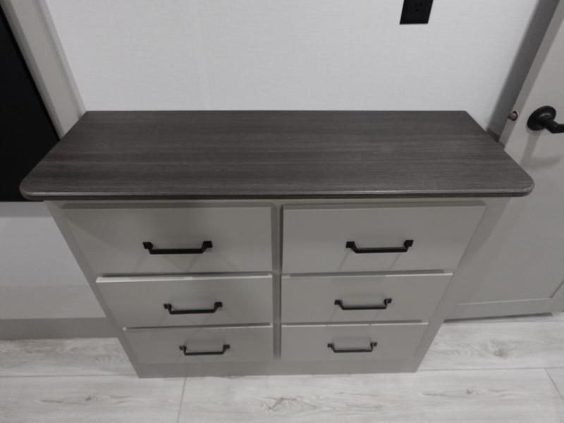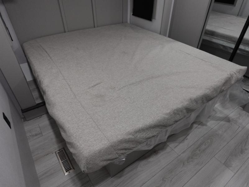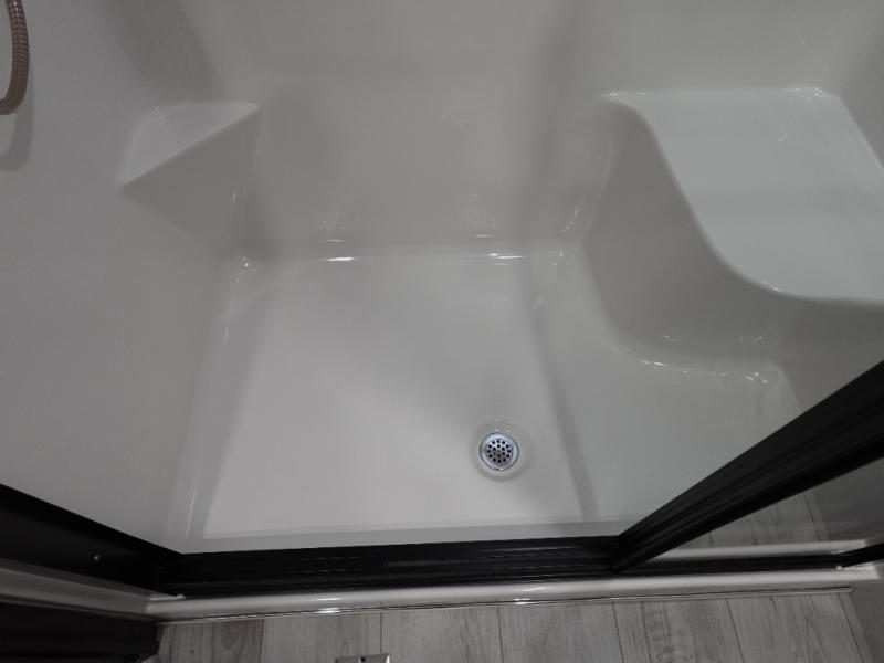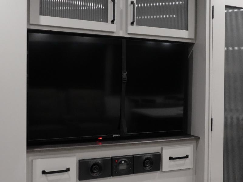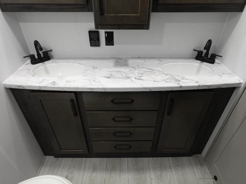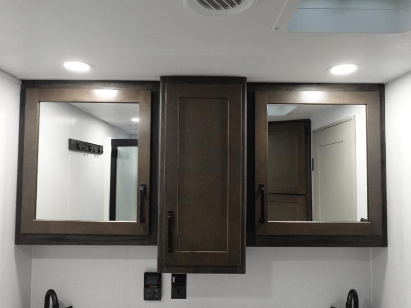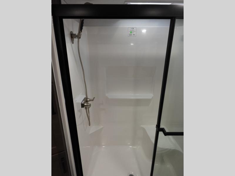 You can live life to its fullest in this Montana High Country fifth wheel! There are opposing slides in the main living area for more space, and the fireplace adds coziness to this space. Spend time relaxing on the power theater seating, and use the hide-a-bed sofa as an extra bed when you have friends turn into overnight guests. The pantry will help you keep your snacks stored away, and full bathroom has a dual-sink vanity and 48" x 30" shower with seat for a convenient way to get clean. The front bedroom has a king bed slide with storage underneath the bed, and the wardrobe and dresser provide more storage space.
