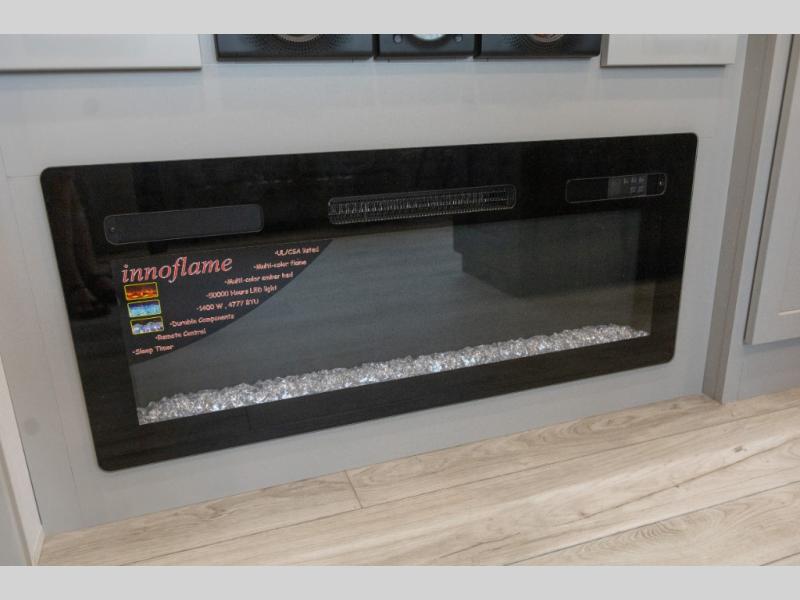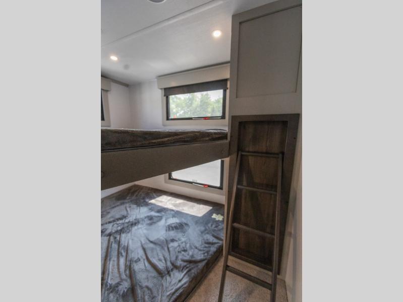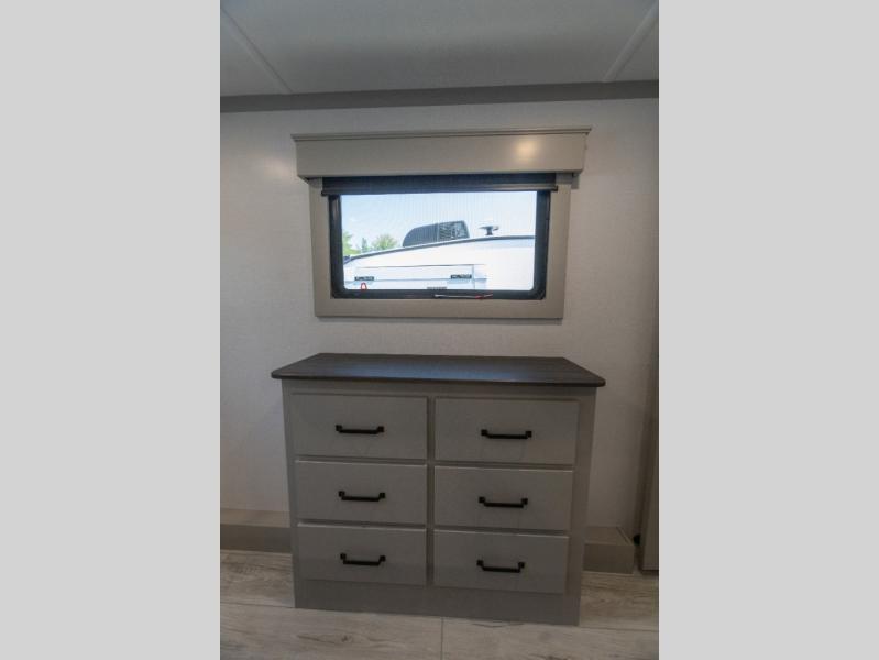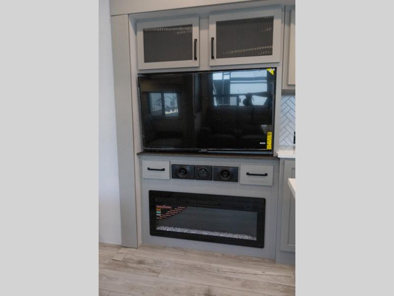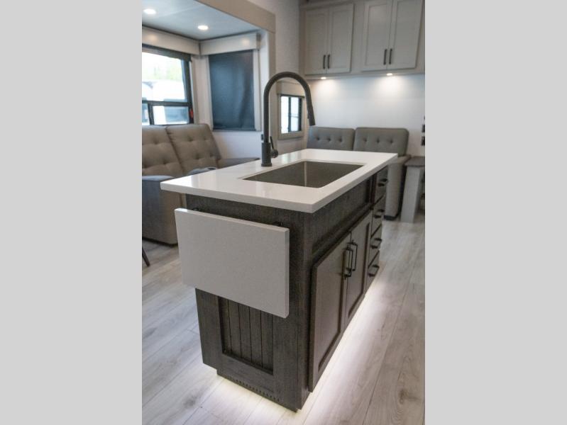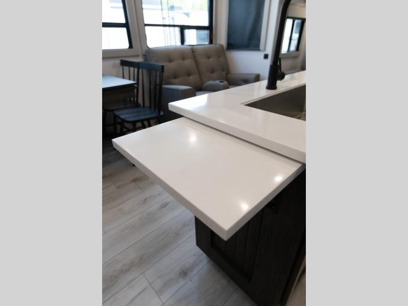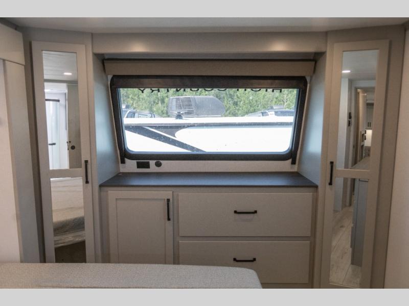 You will be living in true luxury with this Montana High Country fifth wheel! First of all, you'll have your own master suite up at the front with a king bed slide out. The bedroom also has great storage space for your clothes with the two dressers and two wardrobes. Second, there is a great sleeping area in the back for the extra travelers you have with you. The RV queen-size bunks allow four adults to sleep comfortably each night in this area, and there is even a hide-a-bed sofa next to the bunks for yet another set of sleepy campers. The power theater seating sits directly across from the fireplace and 50" LED TV, and the kitchen island has a countertop extension for even more prep space in the kitchen.