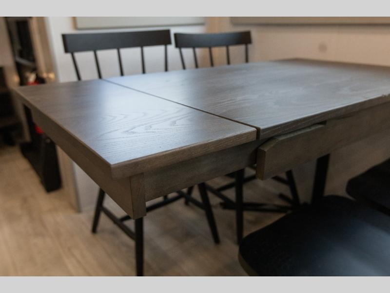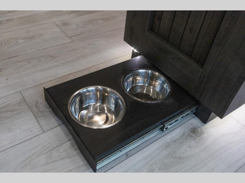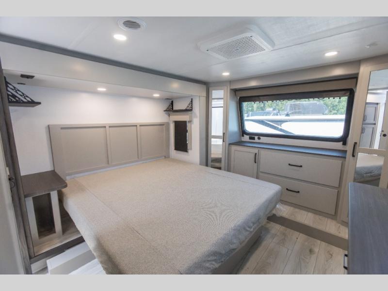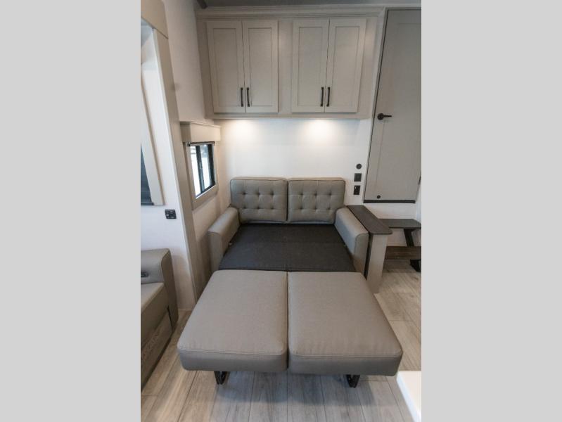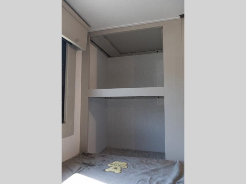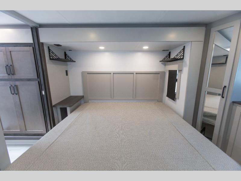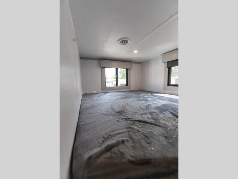 You will be living in true luxury with this Montana High Country fifth wheel! First of all, you'll have your own master suite up at the front with a king bed slide out. The bedroom also has great storage space for your clothes with the two dressers and two wardrobes. Second, there is a great sleeping area in the back for the extra travelers you have with you. The RV queen-size bunks allow four adults to sleep comfortably each night in this area, and there is even a hide-a-bed sofa next to the bunks for yet another set of sleepy campers. The power theater seating sits directly across from the fireplace and 50" LED TV, and the kitchen island has a countertop extension for even more prep space in the kitchen.