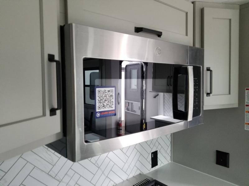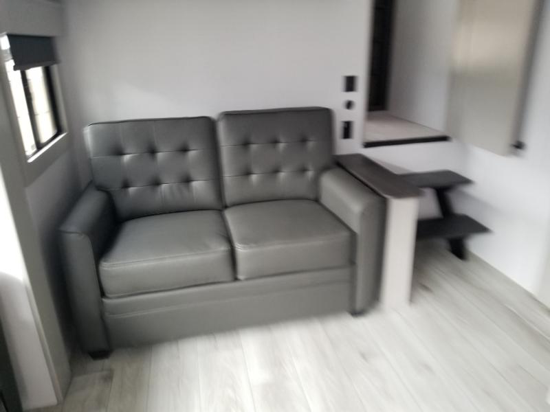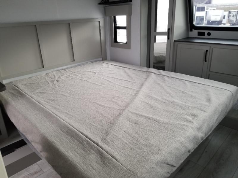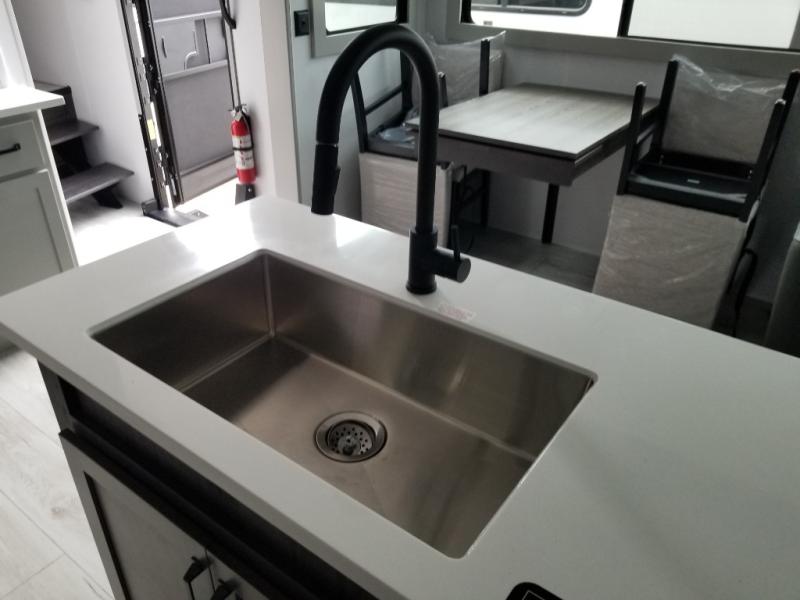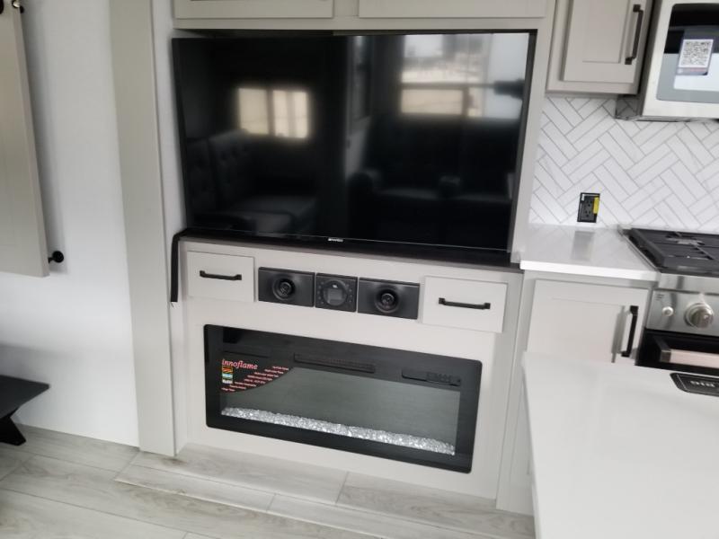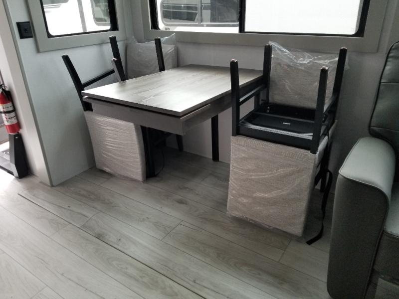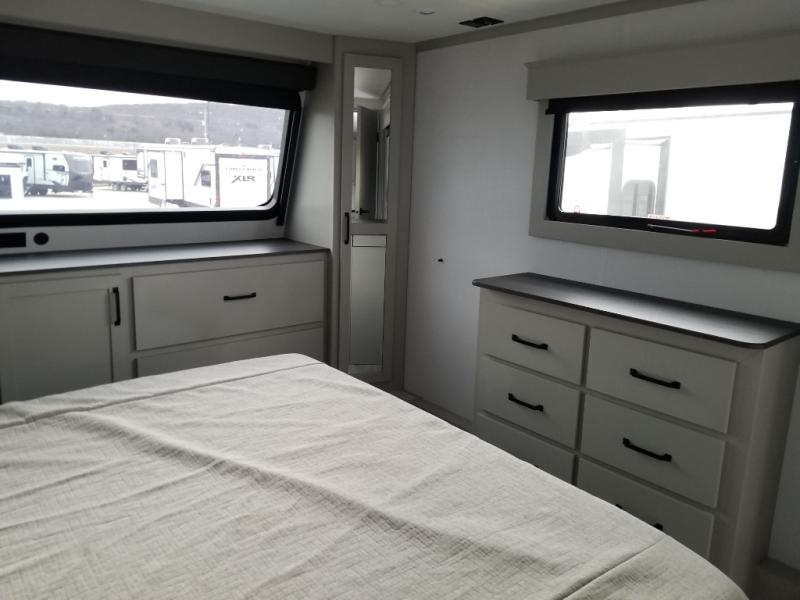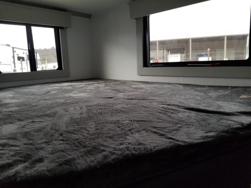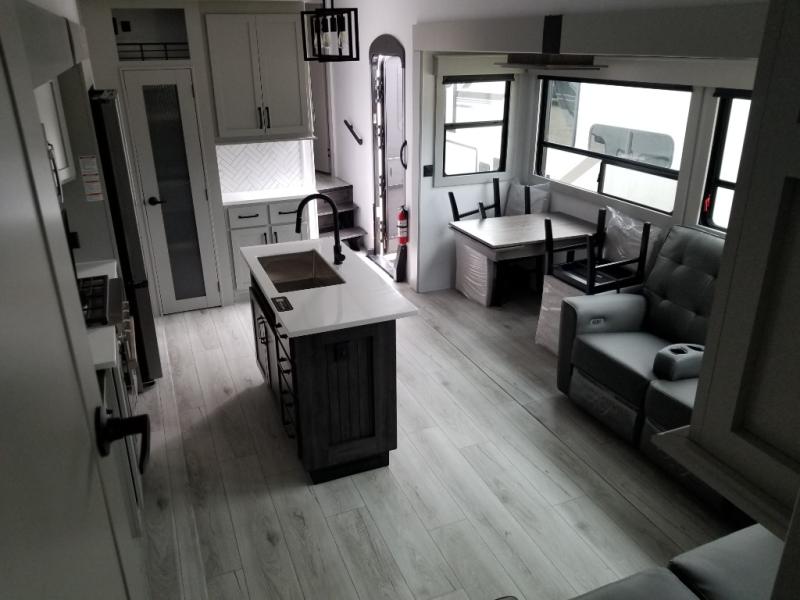 You will be living in true luxury with this Montana High Country fifth wheel! First of all, you'll have your own master suite up at the front with a king bed slide out. The bedroom also has great storage space for your clothes with the two dressers and two wardrobes. Second, there is a great sleeping area in the back for the extra travelers you have with you. The RV queen-size bunks allow four adults to sleep comfortably each night in this area, and there is even a hide-a-bed sofa next to the bunks for yet another set of sleepy campers. The power theater seating sits directly across from the fireplace and 50" LED TV, and the kitchen island has a countertop extension for even more prep space in the kitchen.