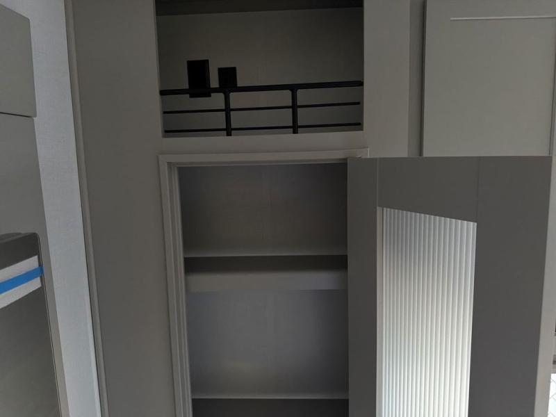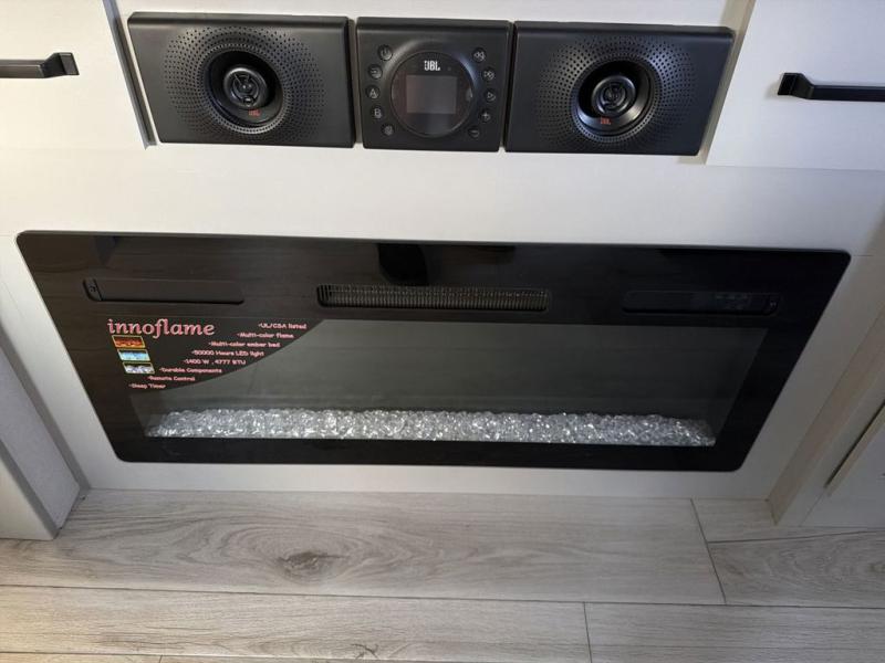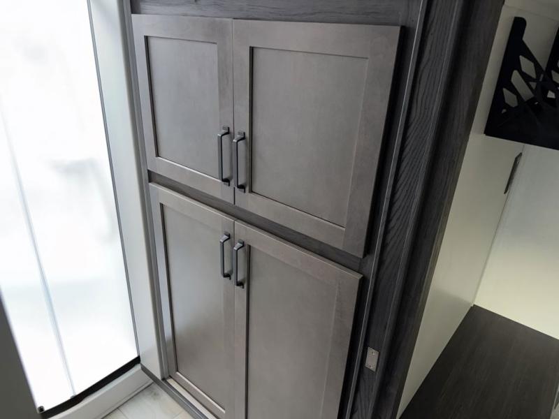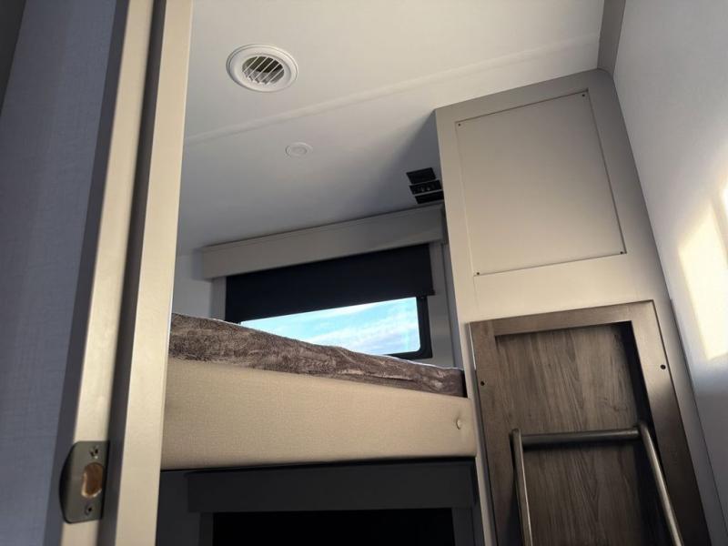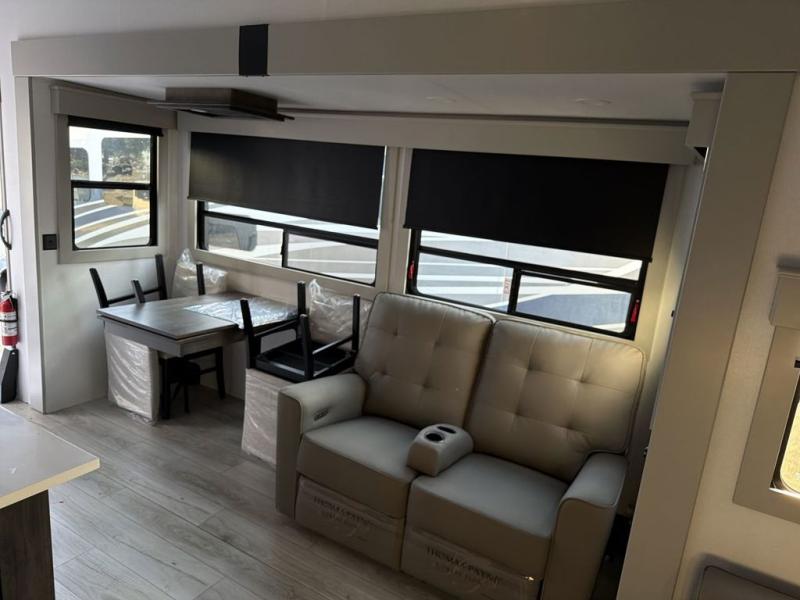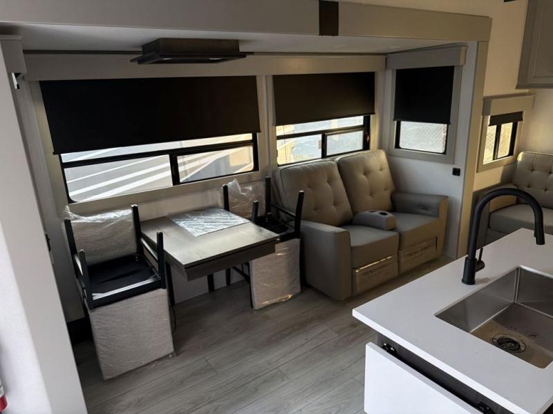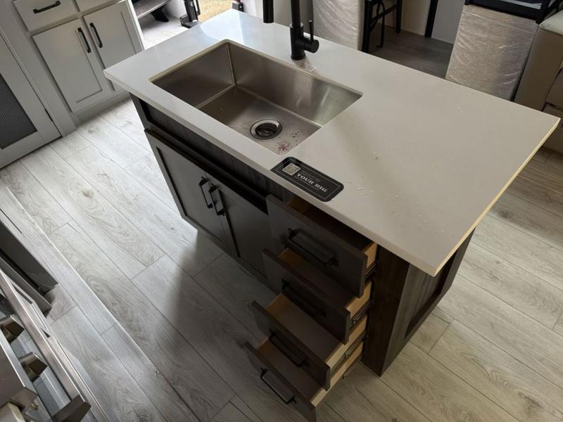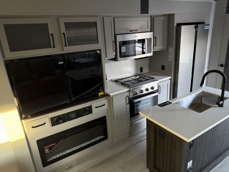You will be living in true luxury with this Montana High Country fifth wheel! First of all, you'll have your own master suite up at the front with a king bed slide out. The bedroom also has great storage space for your clothes with the two dressers and two wardrobes. Second, there is a great sleeping area in the back for the extra travelers you have with you. The RV queen-size bunks allow four adults to sleep comfortably each night in this area, and there is even a hide-a-bed sofa next to the bunks for yet another set of sleepy campers. The power theater seating sits directly across from the fireplace and 50" LED TV, and the kitchen island has a countertop extension for even more prep space in the kitchen.